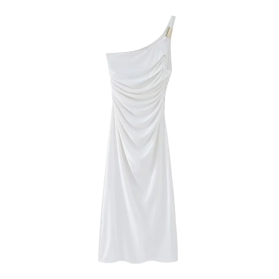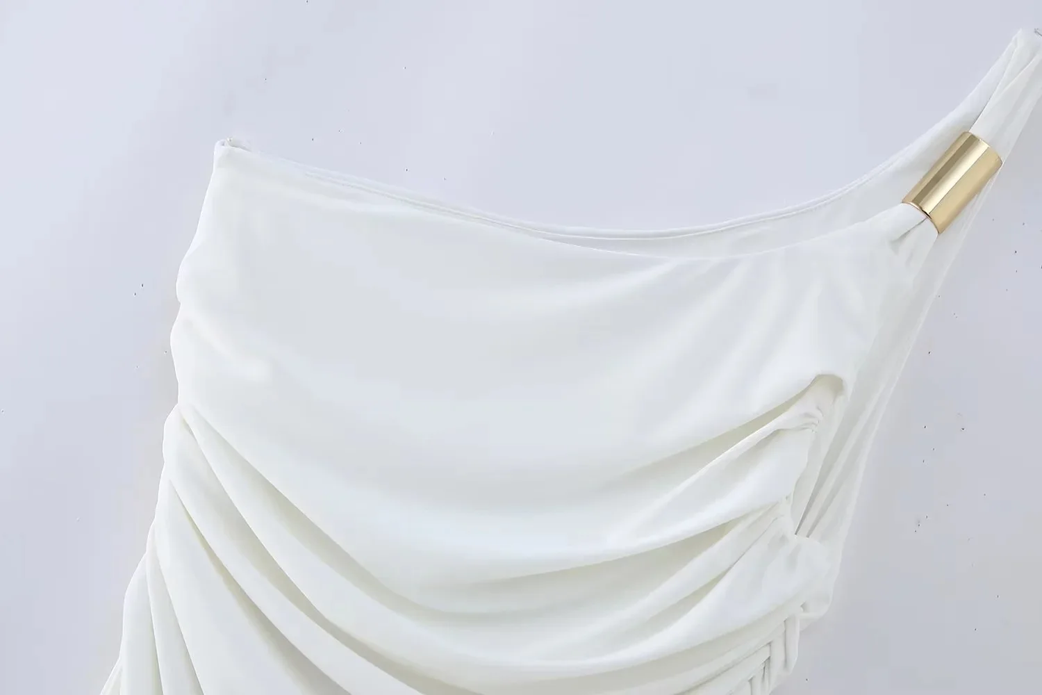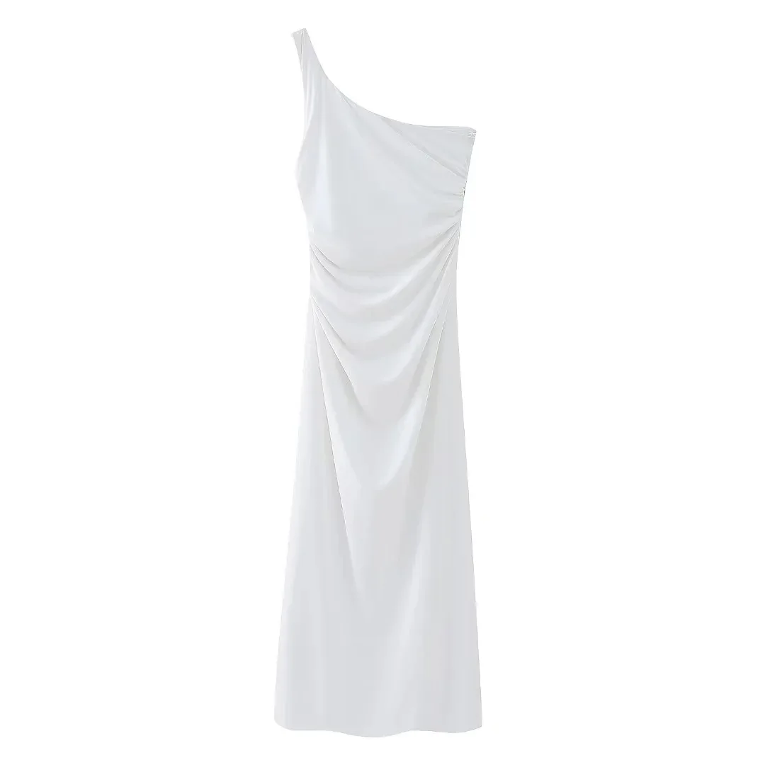 Newest summer ladies elegant party white pleated dress sleeveless one off shoulder simple long dresses women