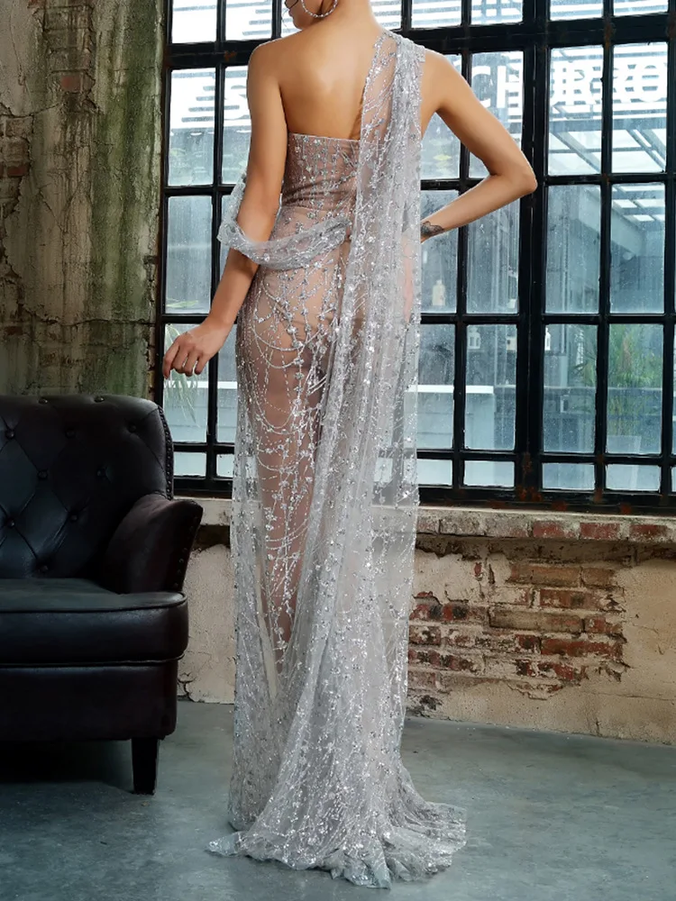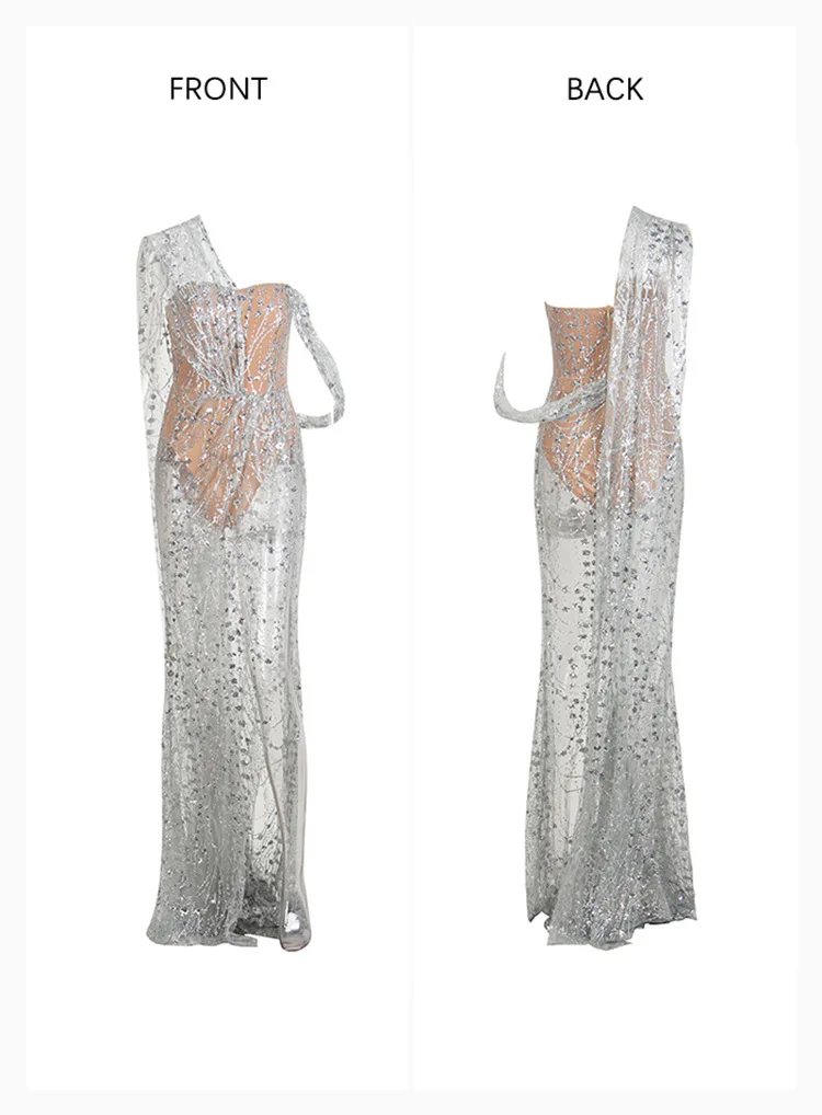 Ocstrade 2024 New Sparkly Sexy Elegant Party Dresses High Slit See Through Off Shoulder Women Glitter Mesh Maxi Evening Dress