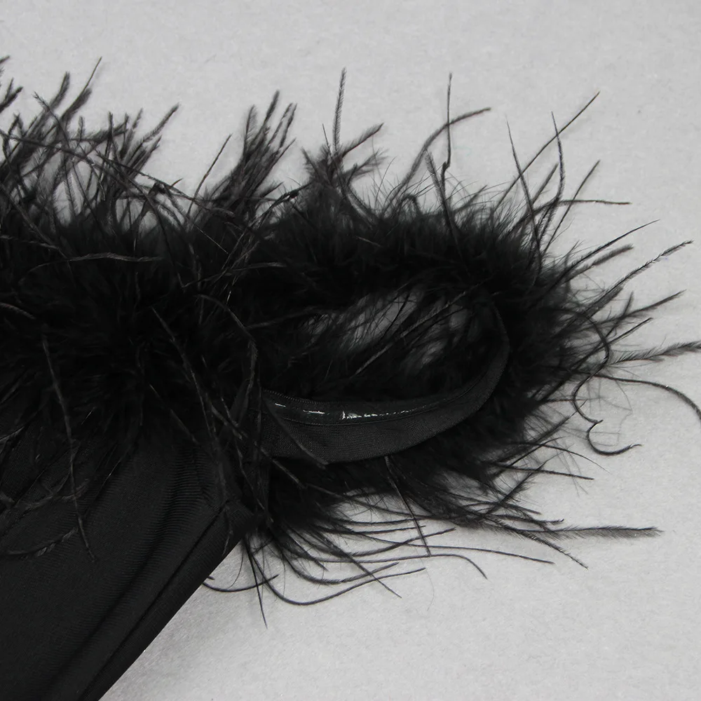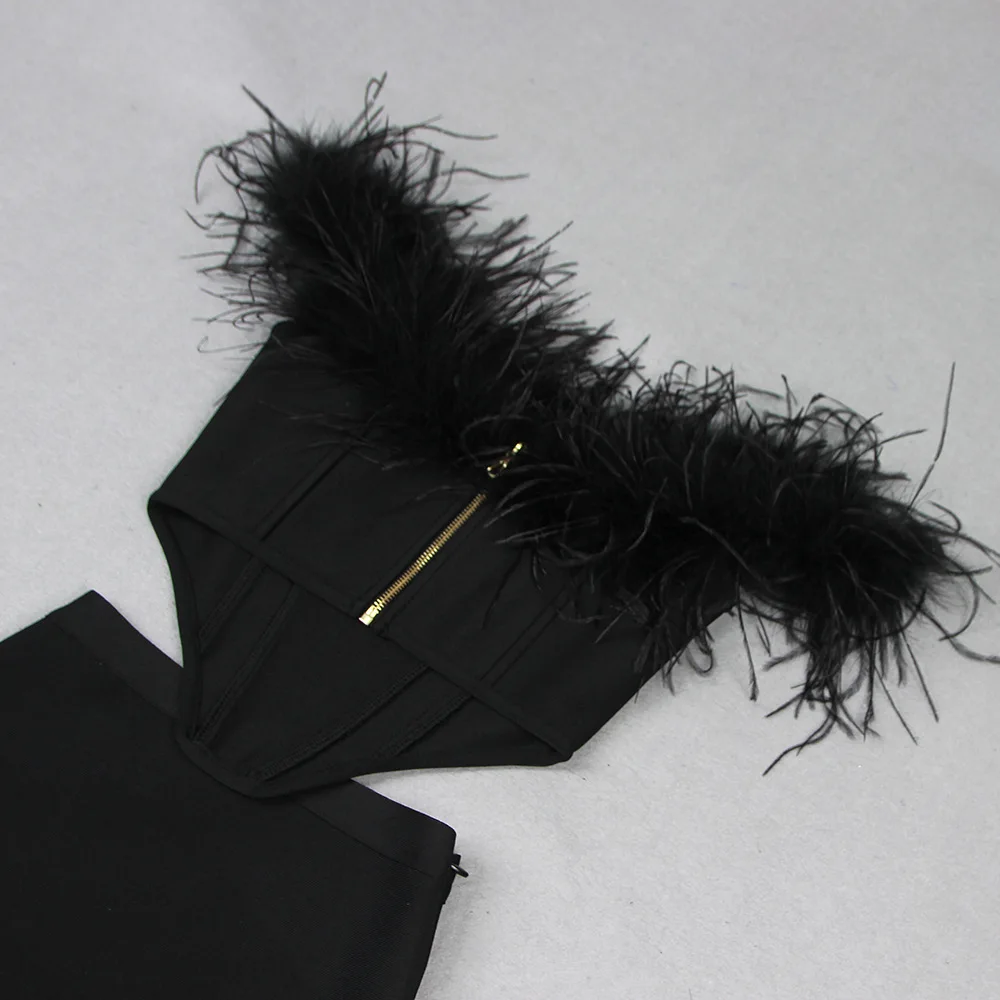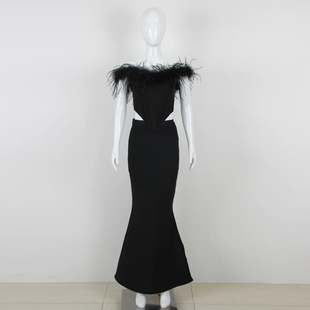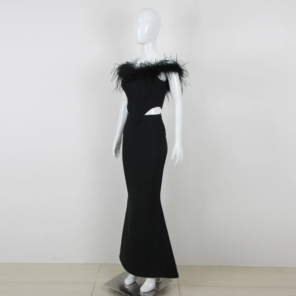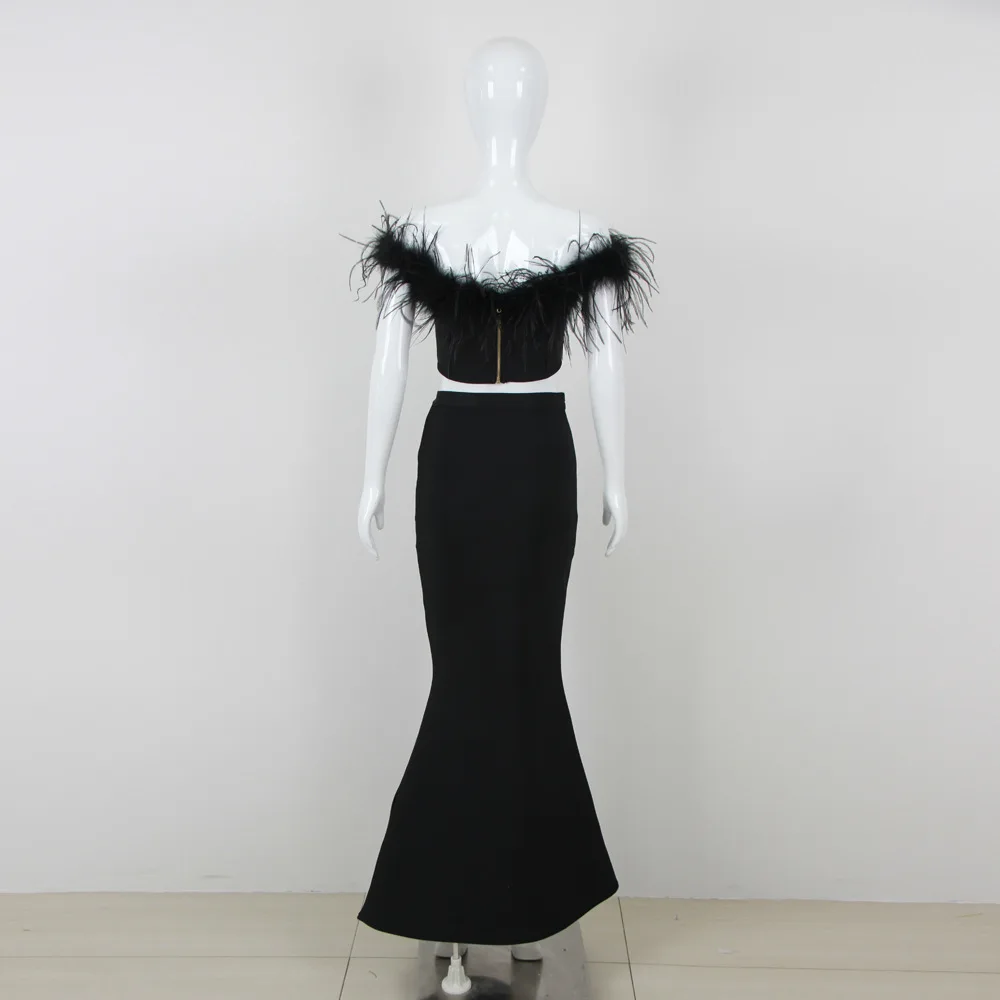 Ocstrade Black Feather Off The Order Two Piece Bandage Dress Set Black Bodycon Bandage Midi Skirt And Top Set For Women Vestido