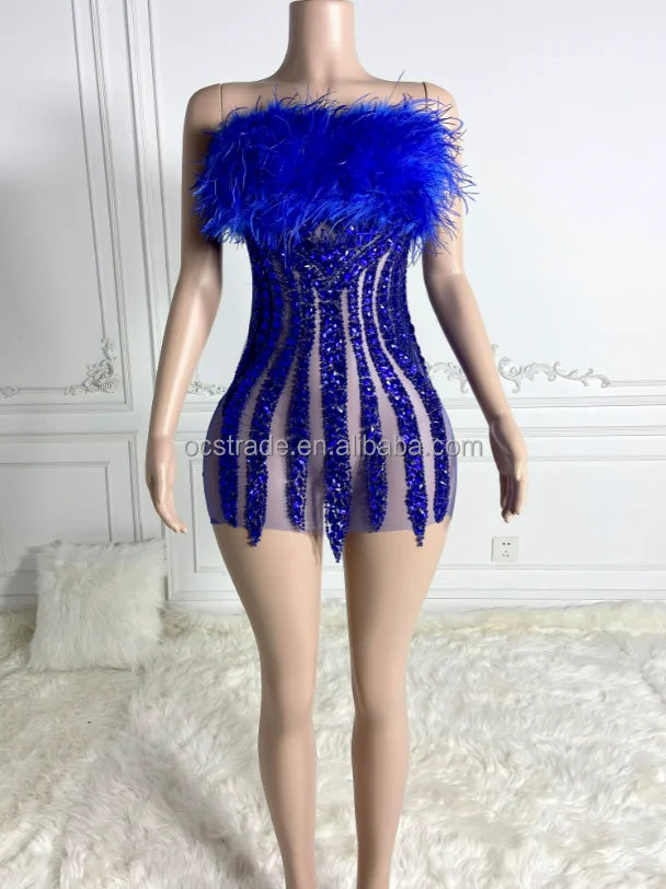 Ocstrade Off The Shoulder Glitter Full Body Rhinestone Blue Colour Club Dress Elegant Feather Birthday Dresses For Girls 21Th