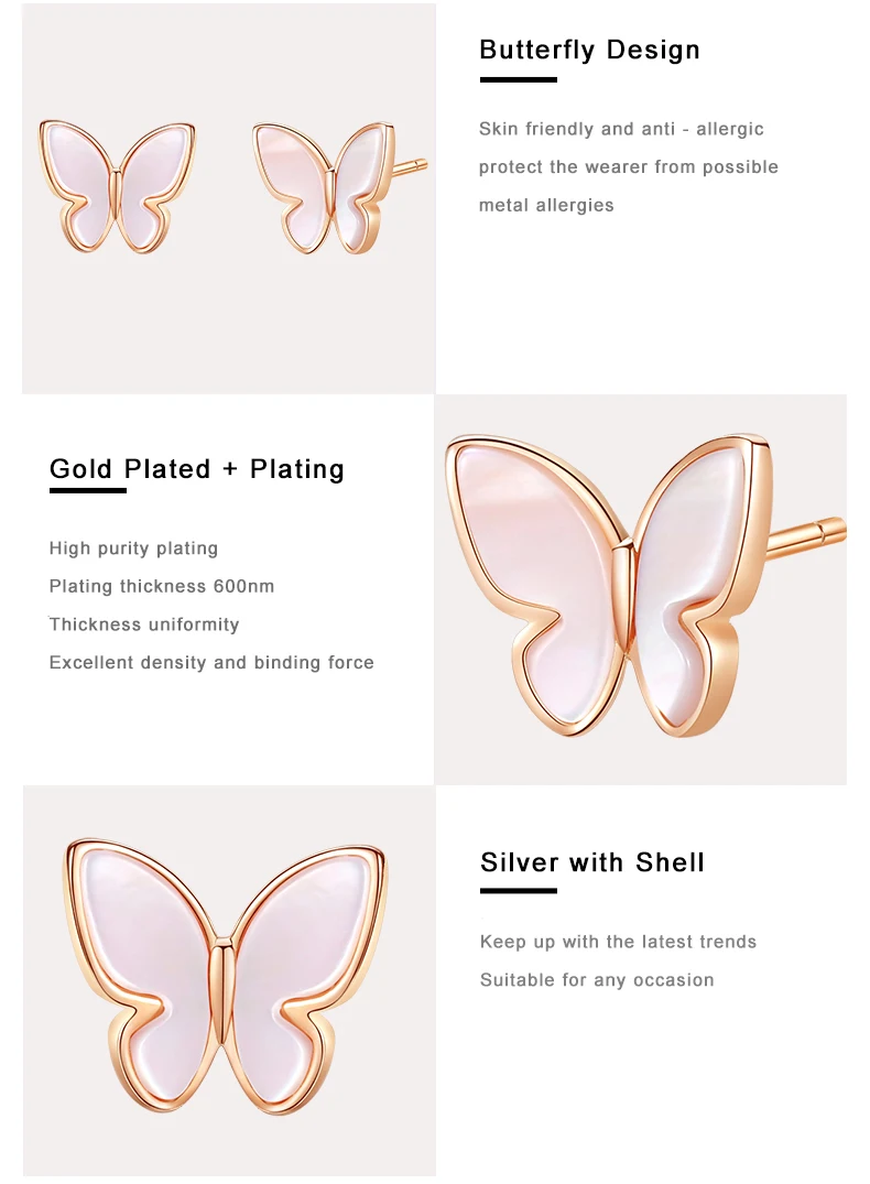 OEM&ODM Butterfly 925 Sterling Sliver Earring Natural Stone Shell Stud Earring Solid 18k Gold Plated Earrings