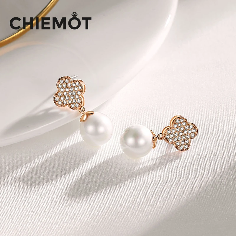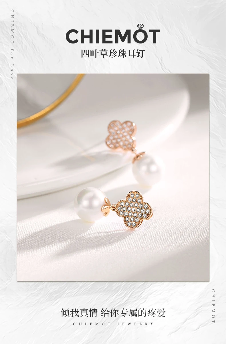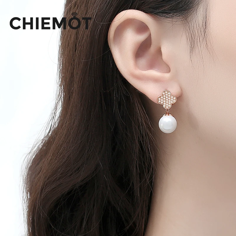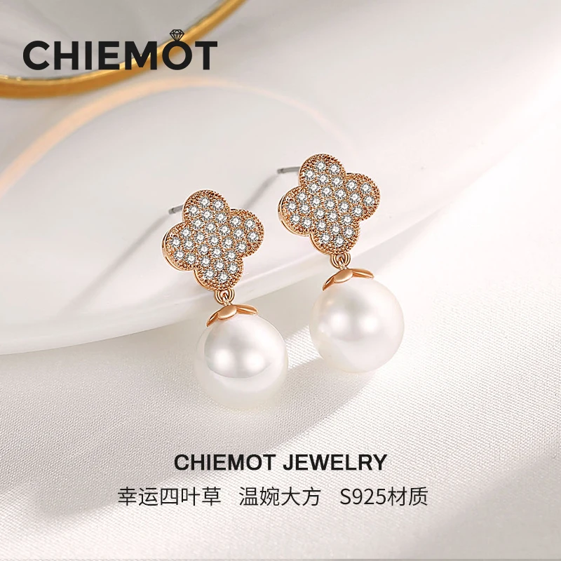 Dropshipping Fine Jewelry 925 Silver Lucky Four Leaf Clover Drop Earrings 18K Rose Gold Plated Elegant Pearl Earrings