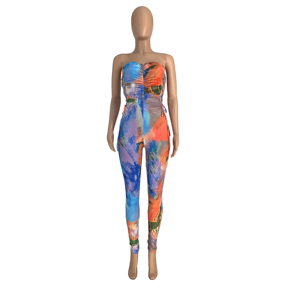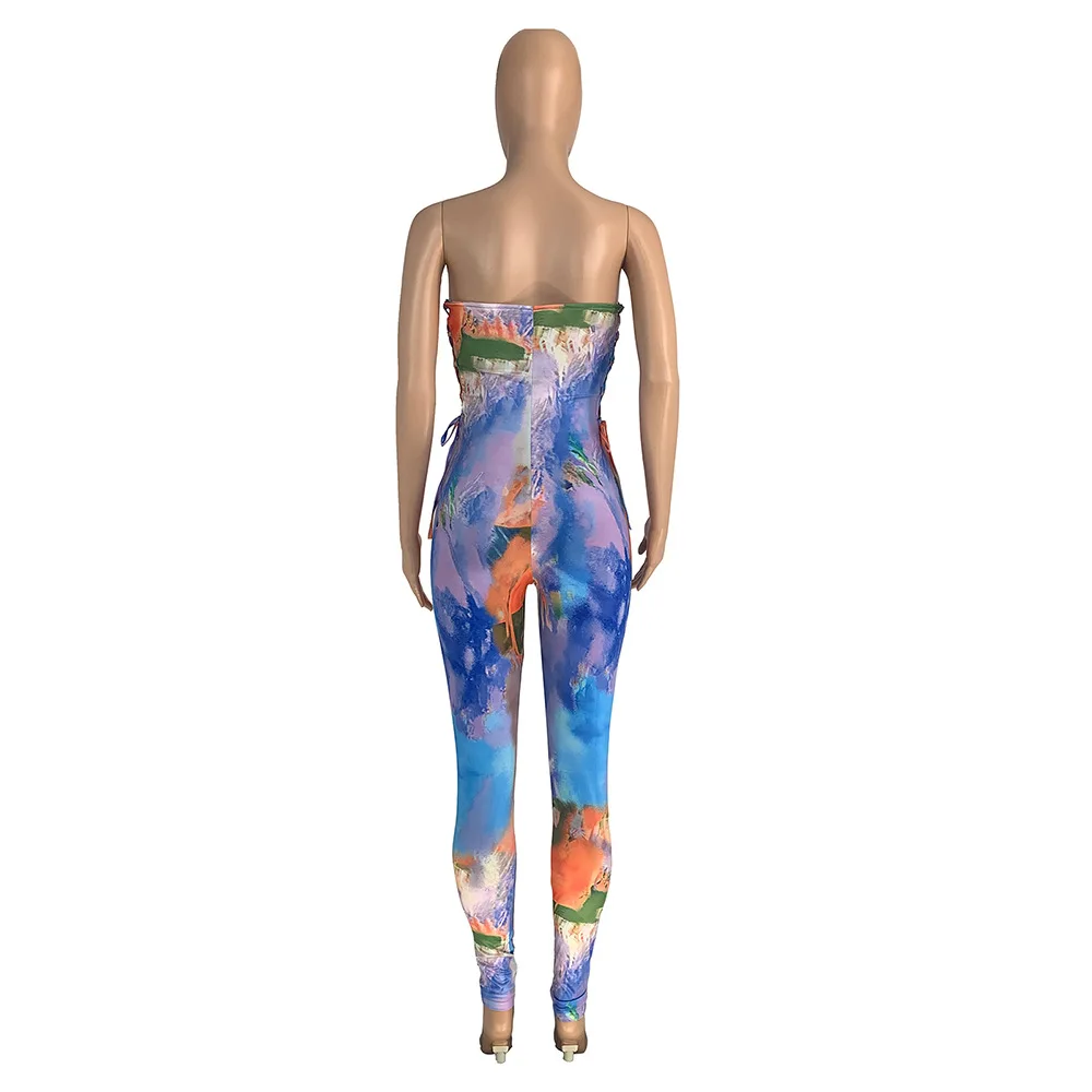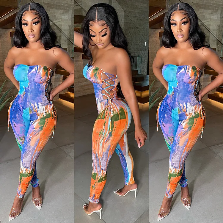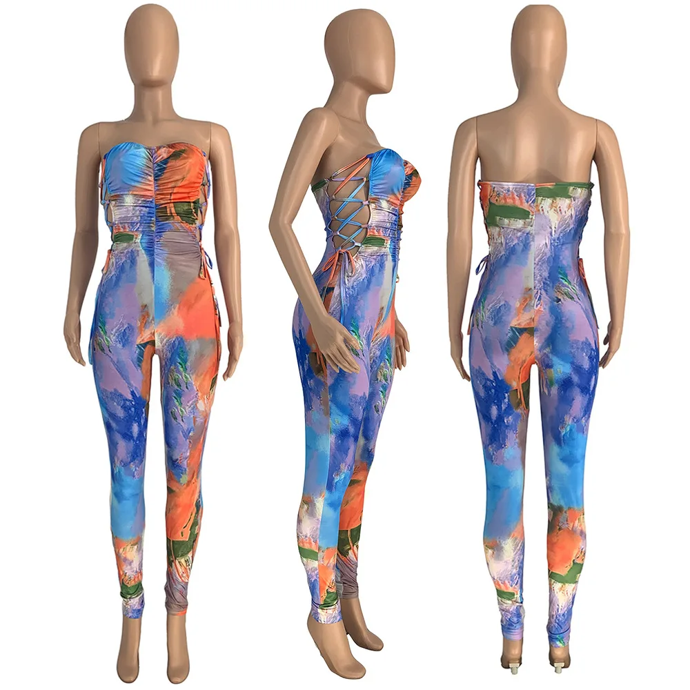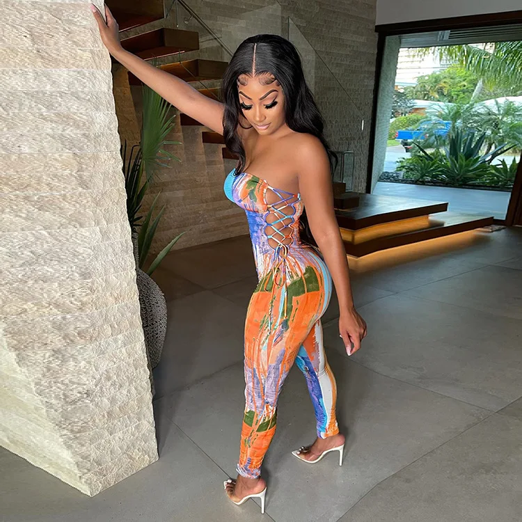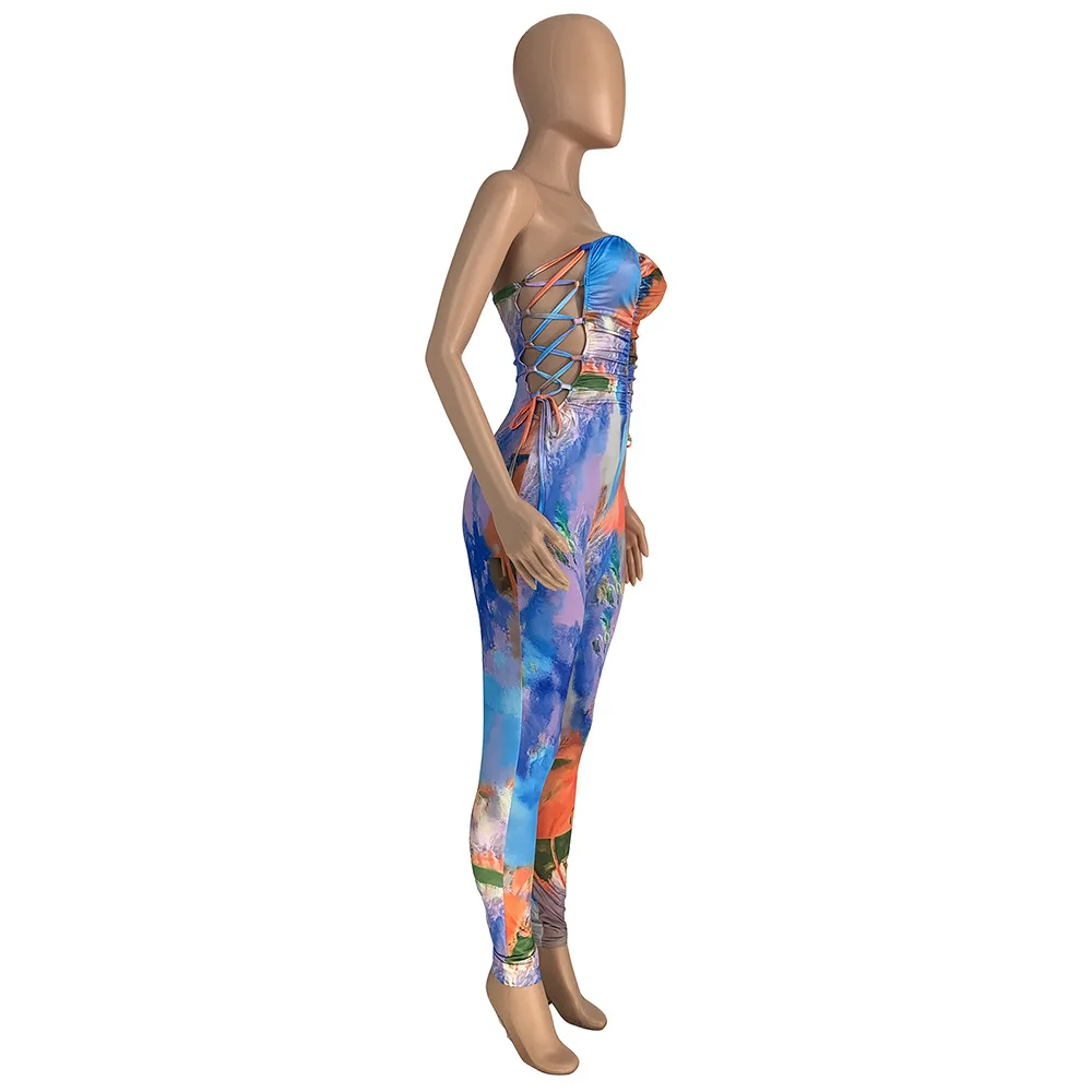 Off Shoulder Lace Up Women Jumpsuit Low Cut Strapless Summer Bodycon Sexy Ladies Print Rompers