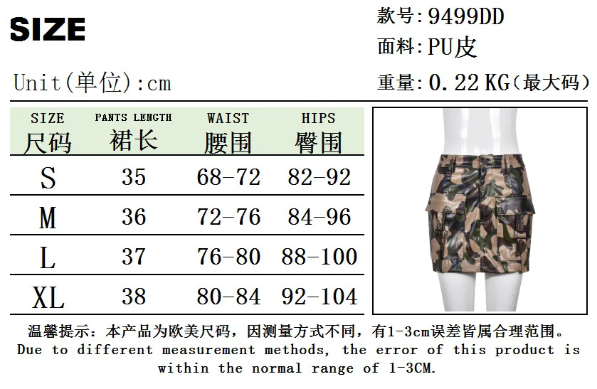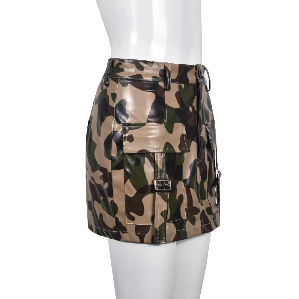 Olive Camo PU Leather Mini Skirt 2023 Summer Fall Clothes For Women Stretchy Zipper Design Multi Pockets For Ladies