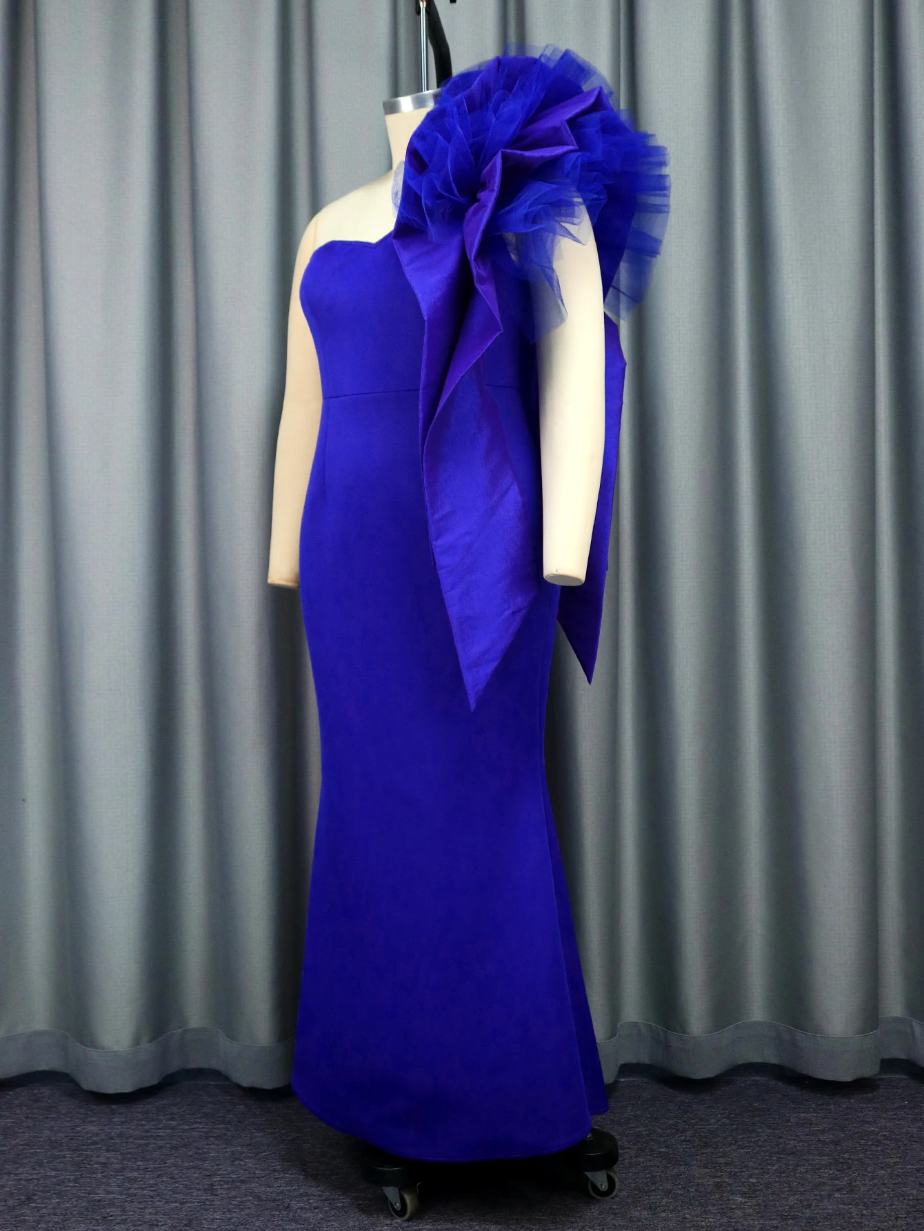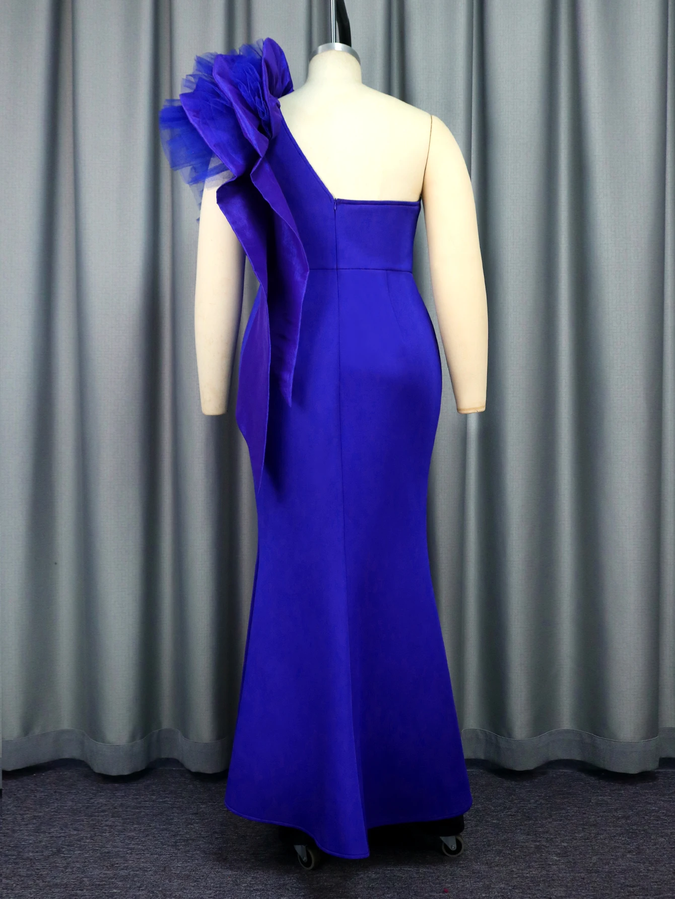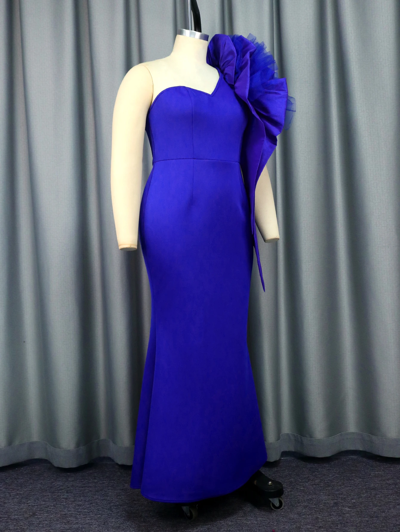 One Shoulder Ruffle Mesh Flower Fishtail Maxi Evening Dresses Women