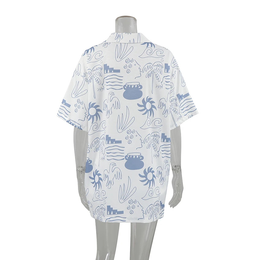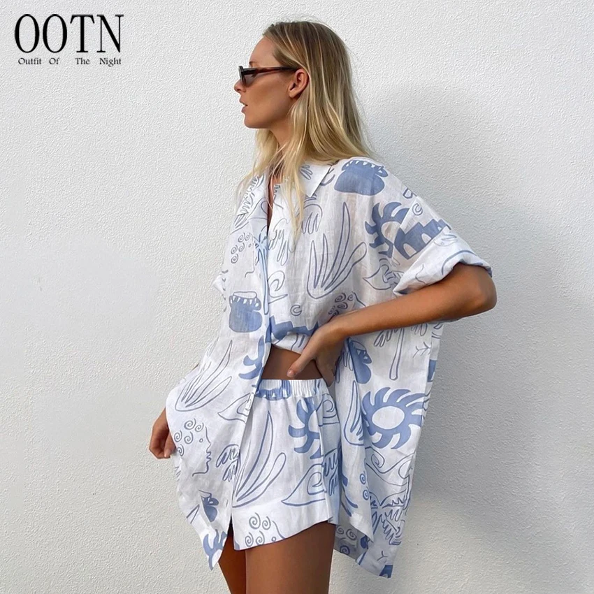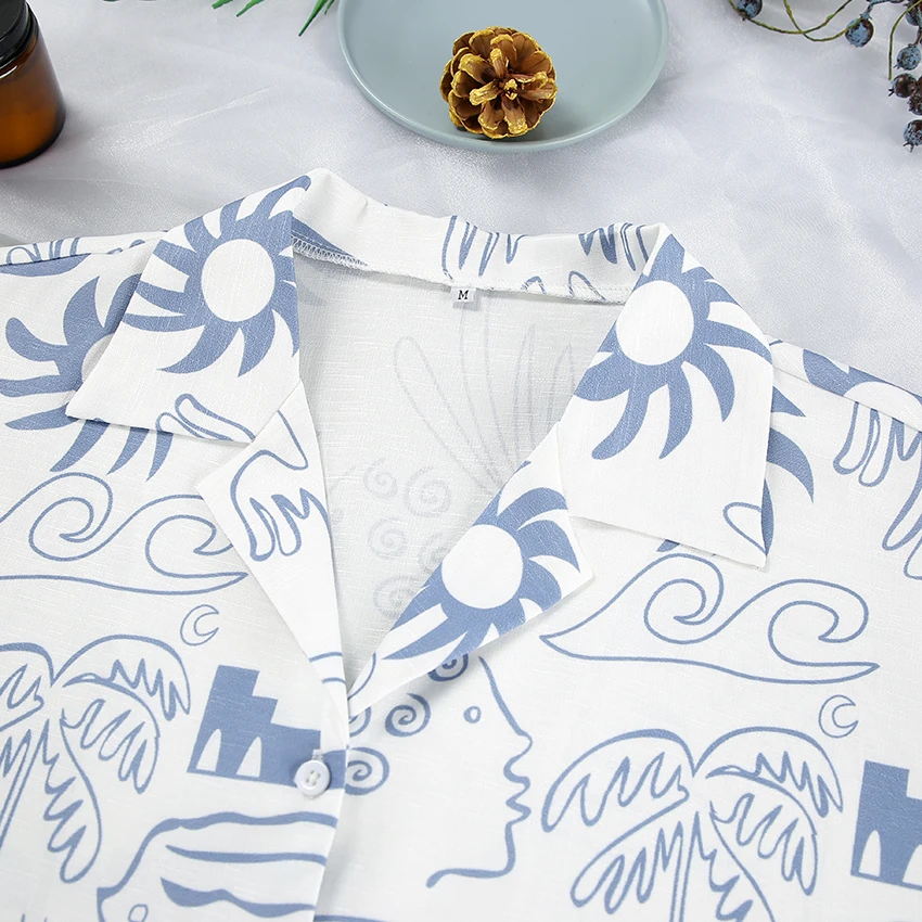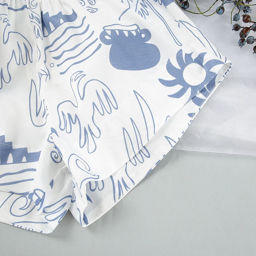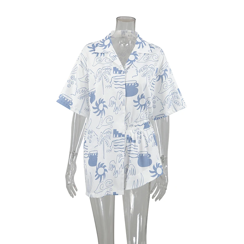 OOTN Outfits Pattern Printed Lapel Tops + Elastic Waist Shorts Mini Shorts Set short sleeve lounge wear pajamas women sleepwear