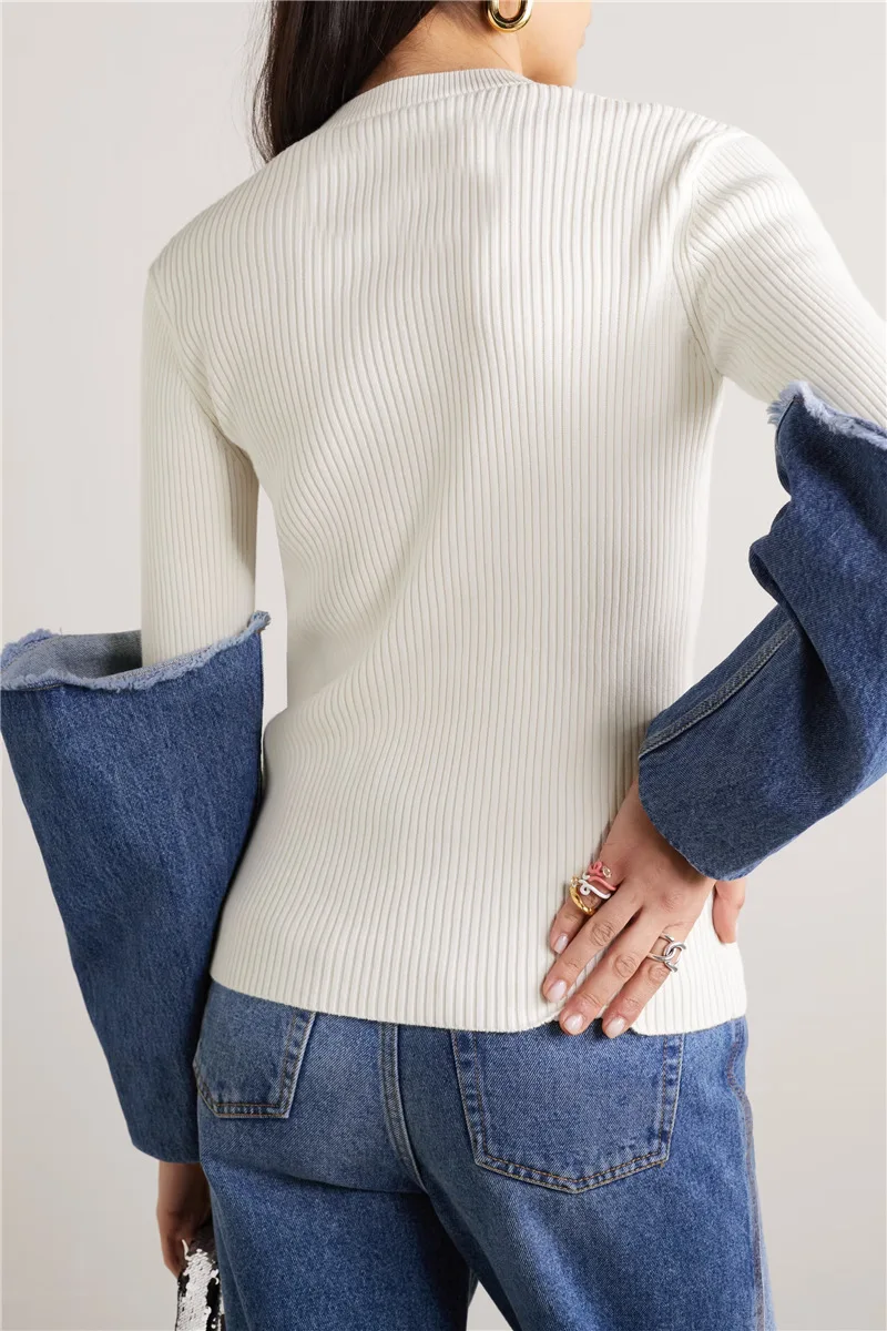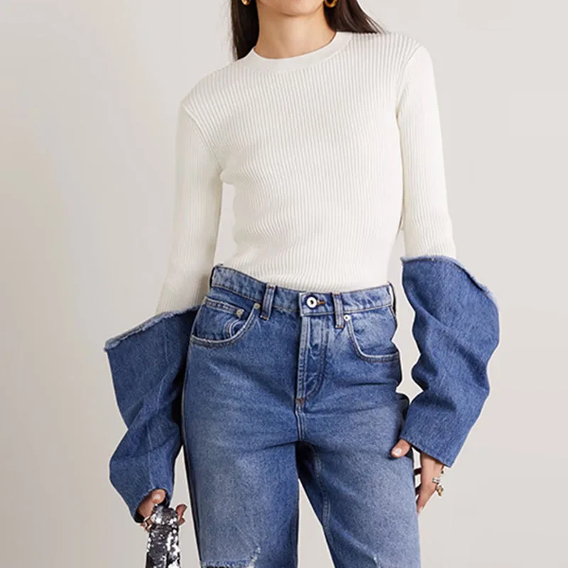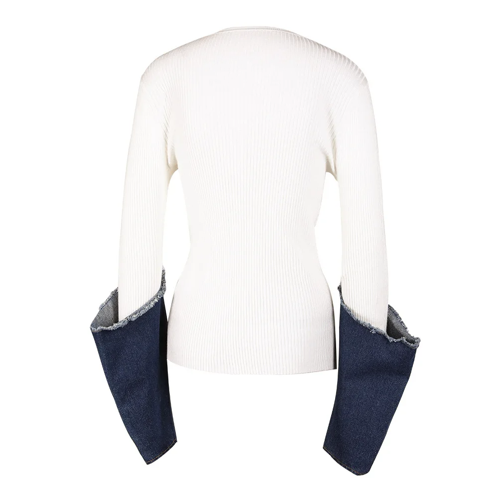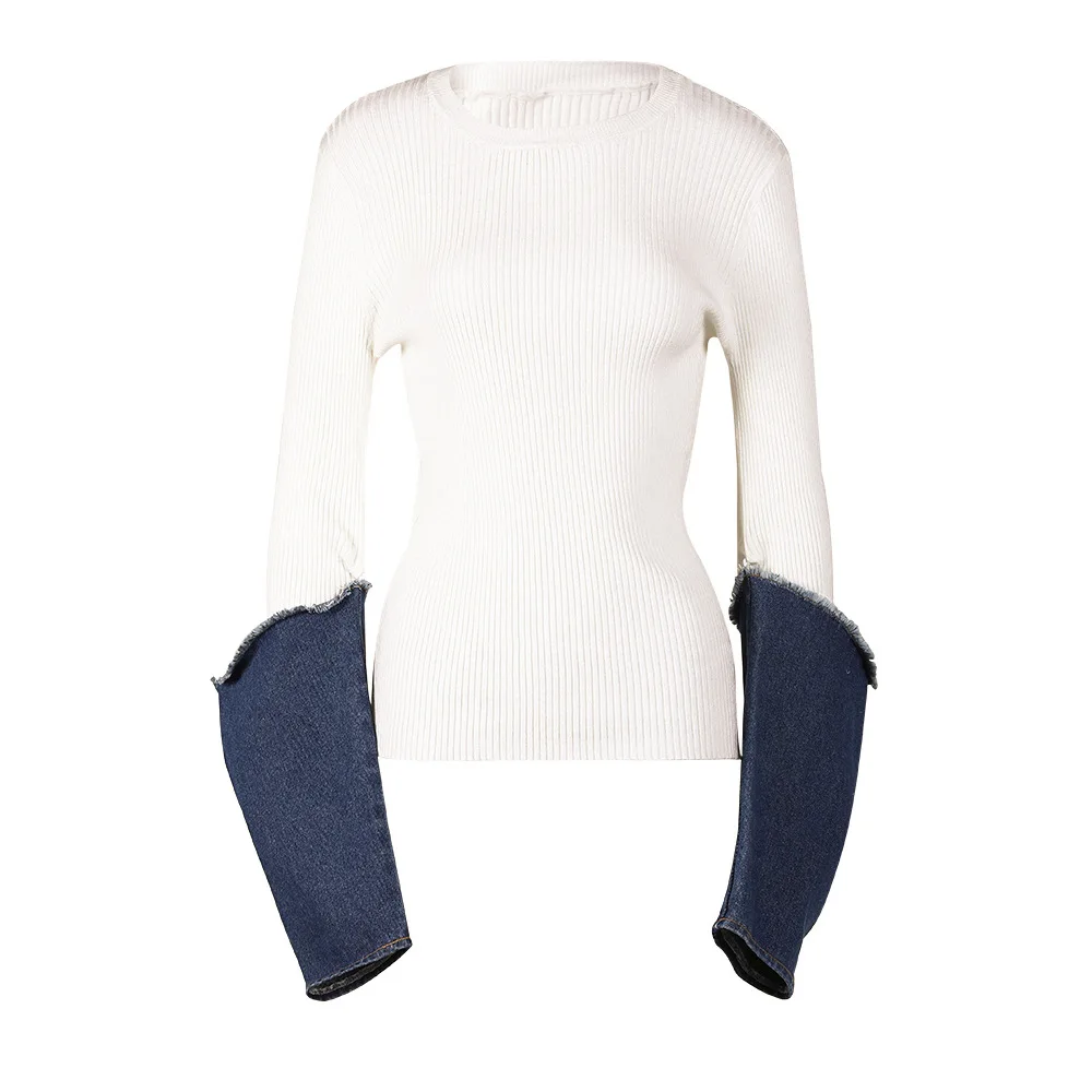 OUDINA 2023 New Arrivals Women Patchwork Detachable Denim Cuffs Casual Top Sweater Knit Women's Sweaters