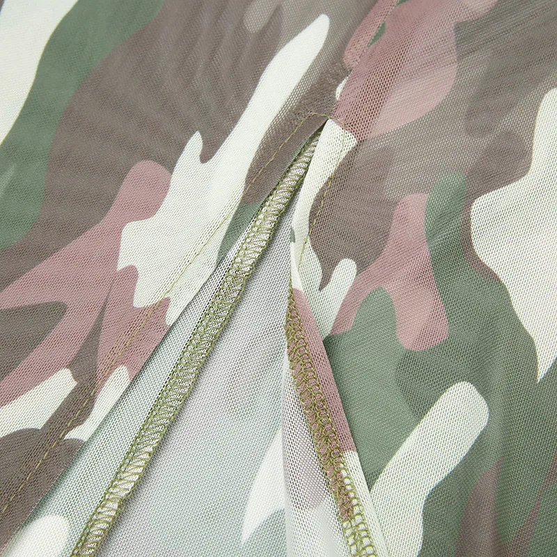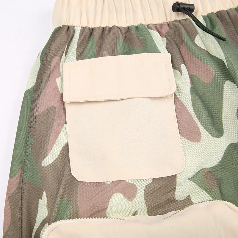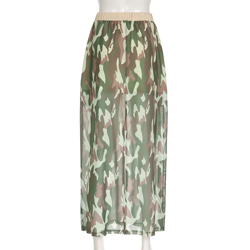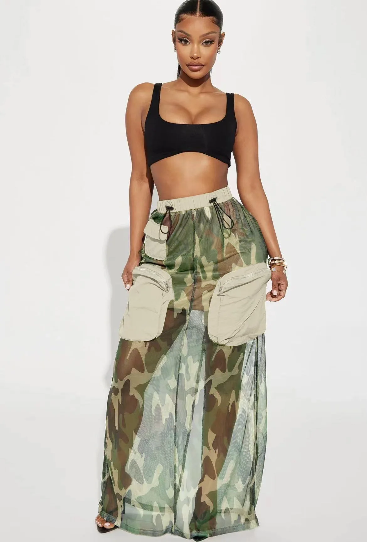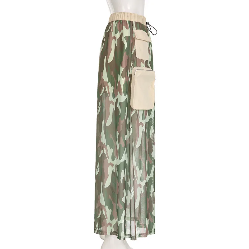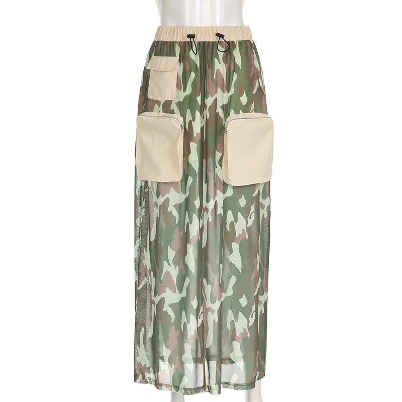 OUDINA 2023 New Stitching Mesh See-through Drawstring Skirts Loose Camo Long Cargo Skirt