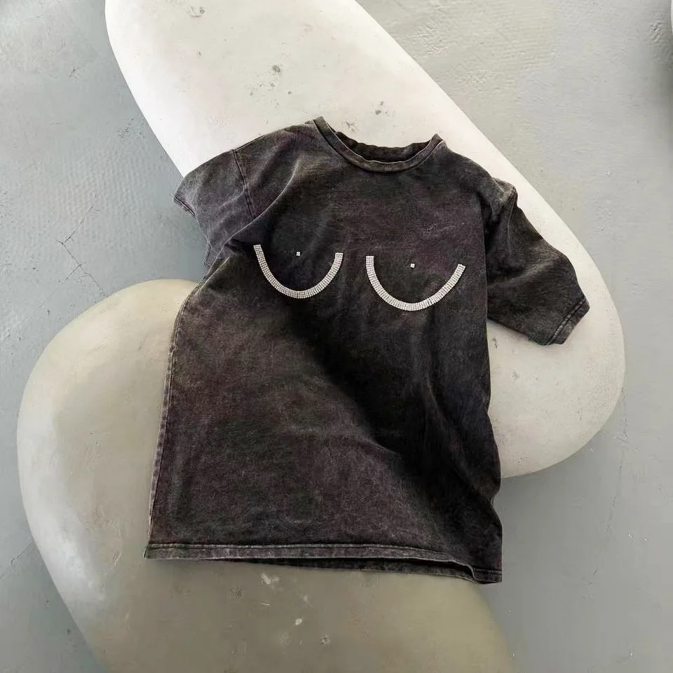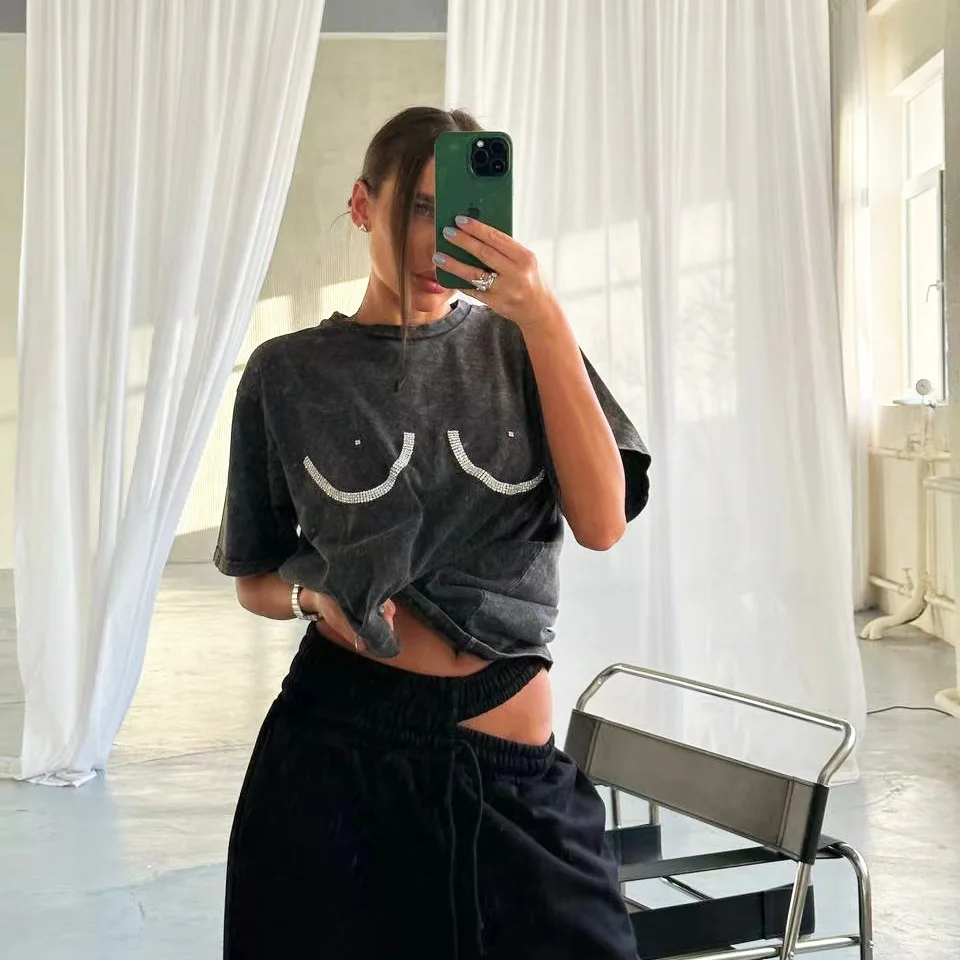 OUDINA American Style Bust Diamond Short Sleeve Women's Spring And Summer Solid Color Simple Round Neck Ladies T-shirt