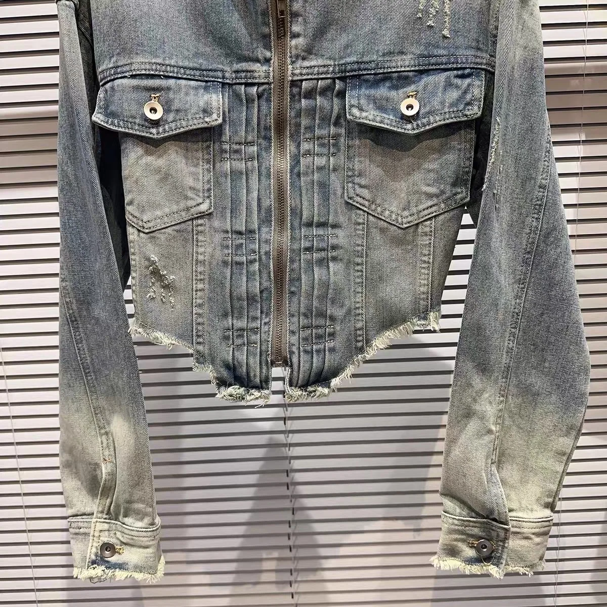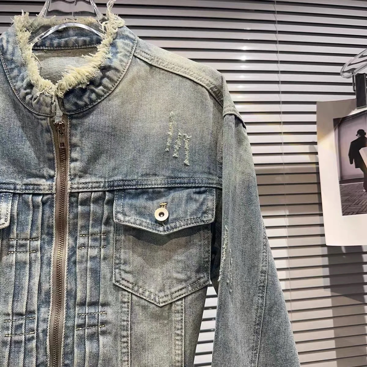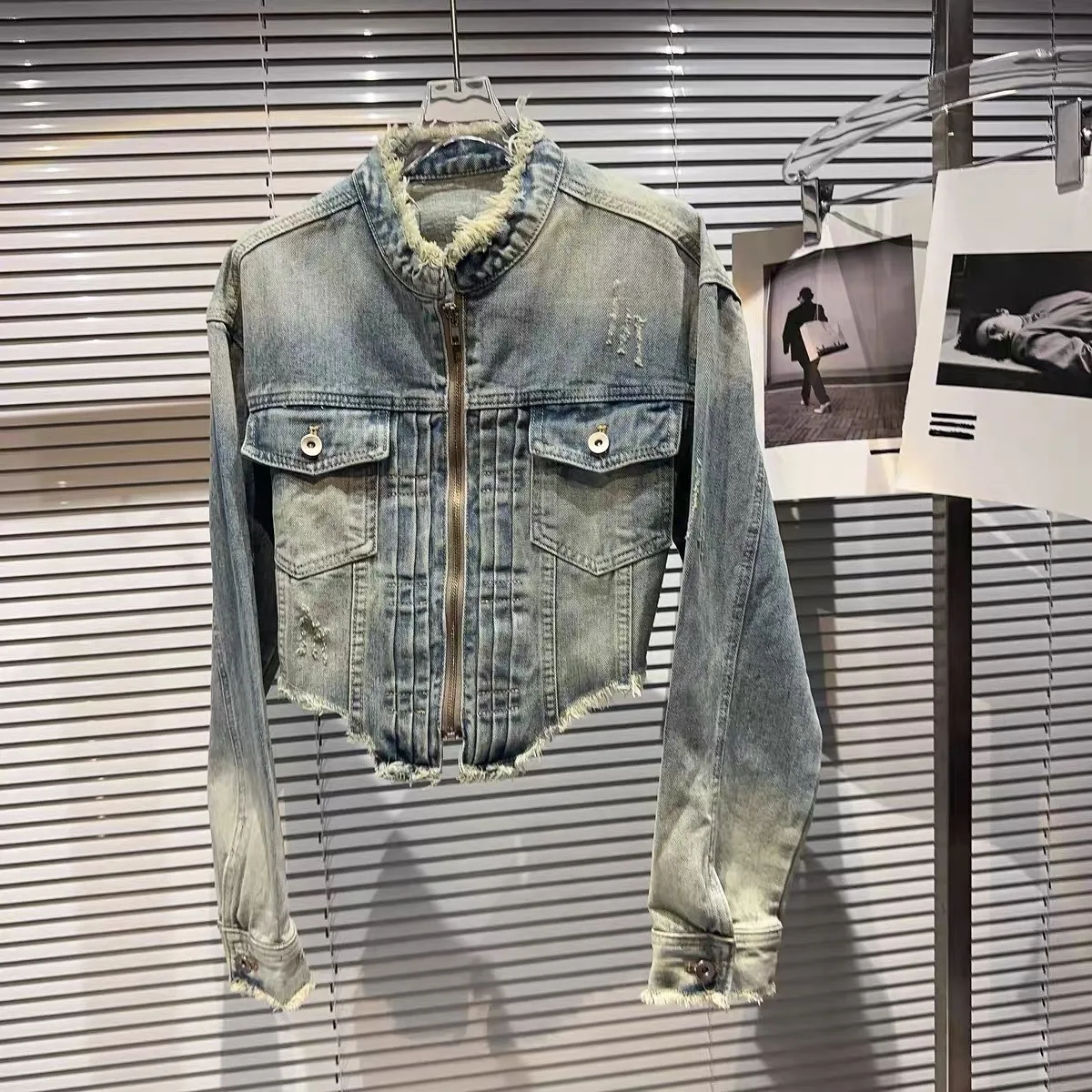OUDINA Autumn Trendy Street Tassel Raw Edge Stand-up Collar Washed Jean Jackets Gradient Short Cropped Women Denim Jacket