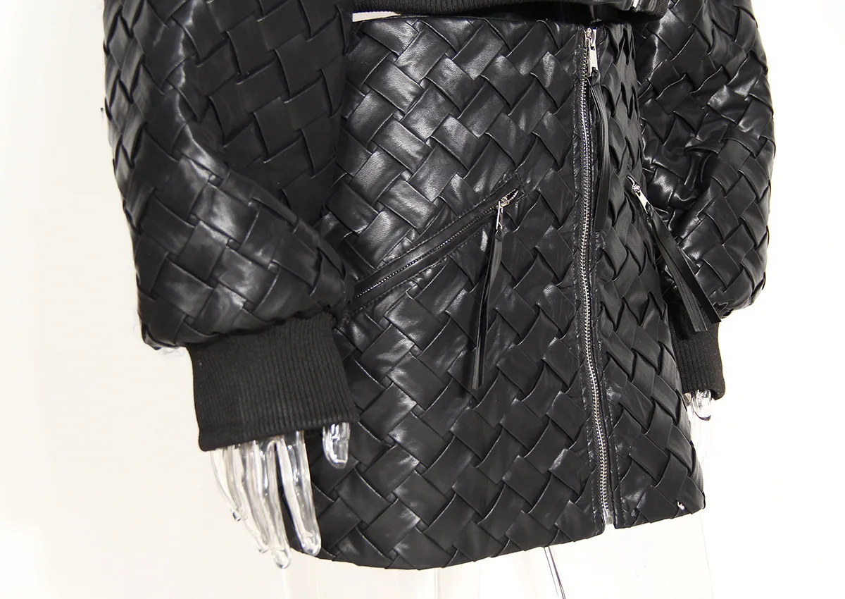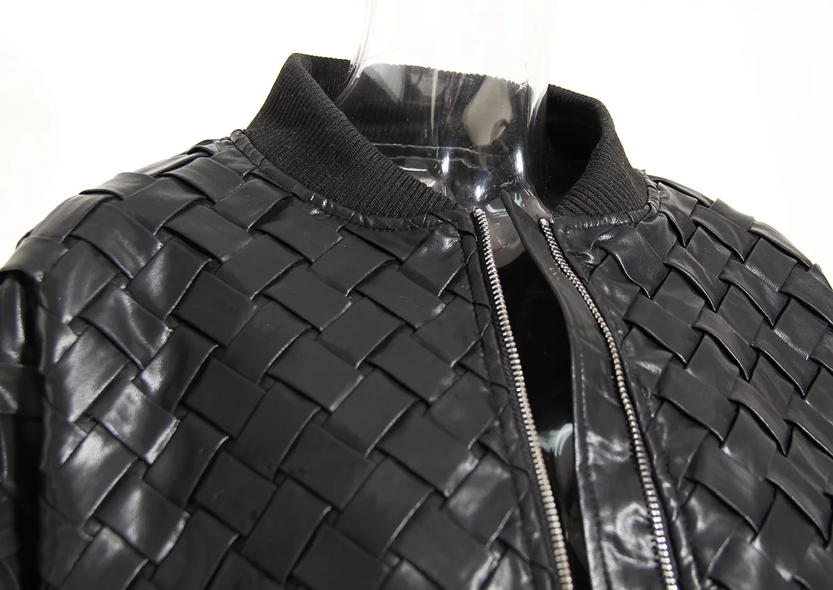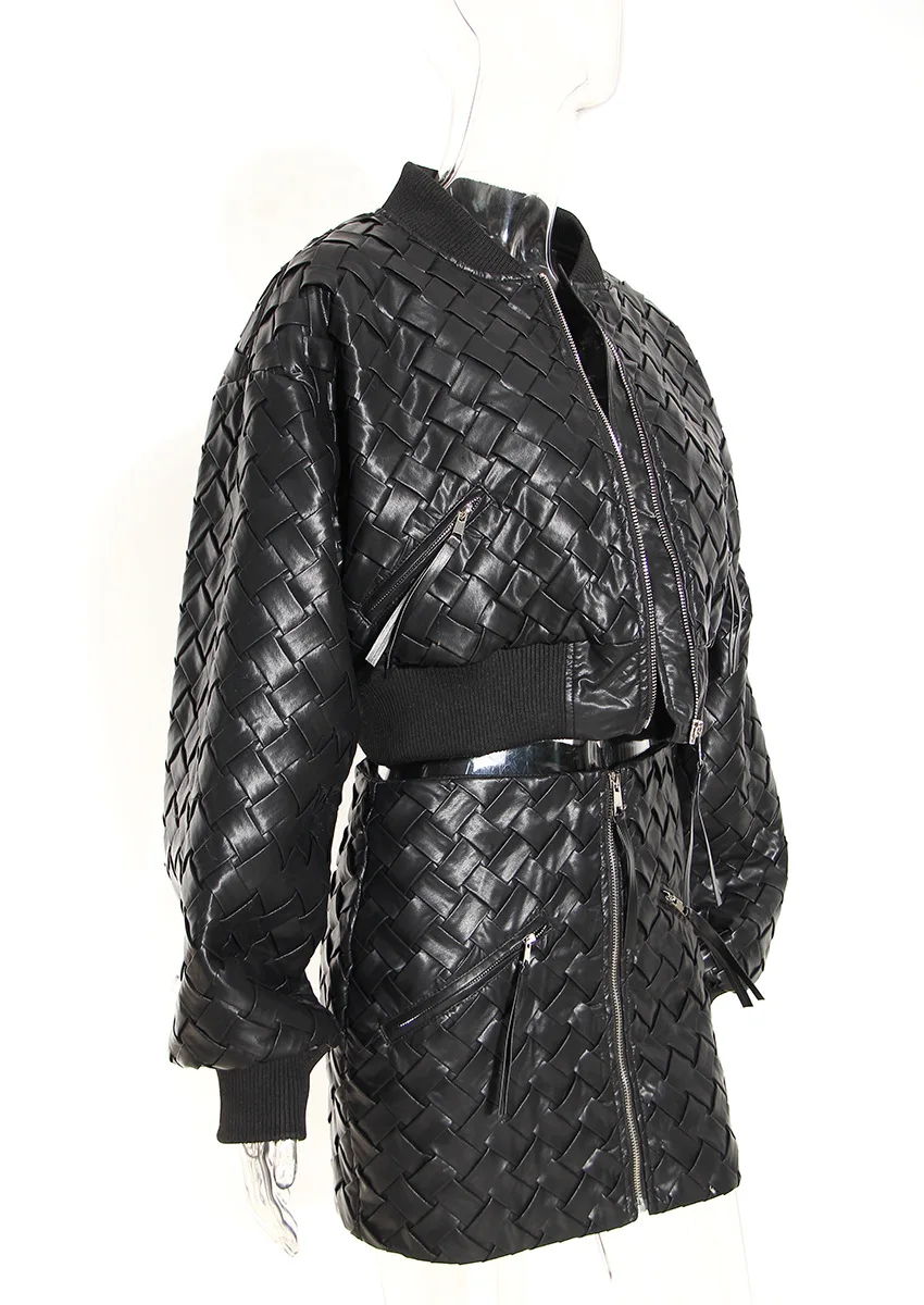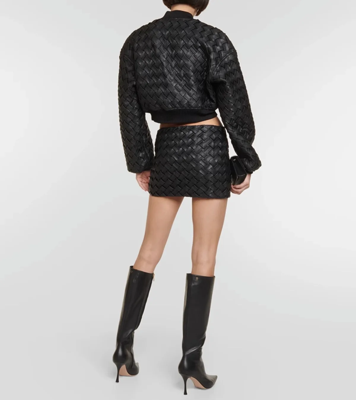 OUDINA Custom OEM Black Woven Textured Zipper Jacket And Mini Skirt Set PU Leather Two Piece Sets For Women