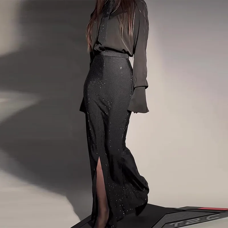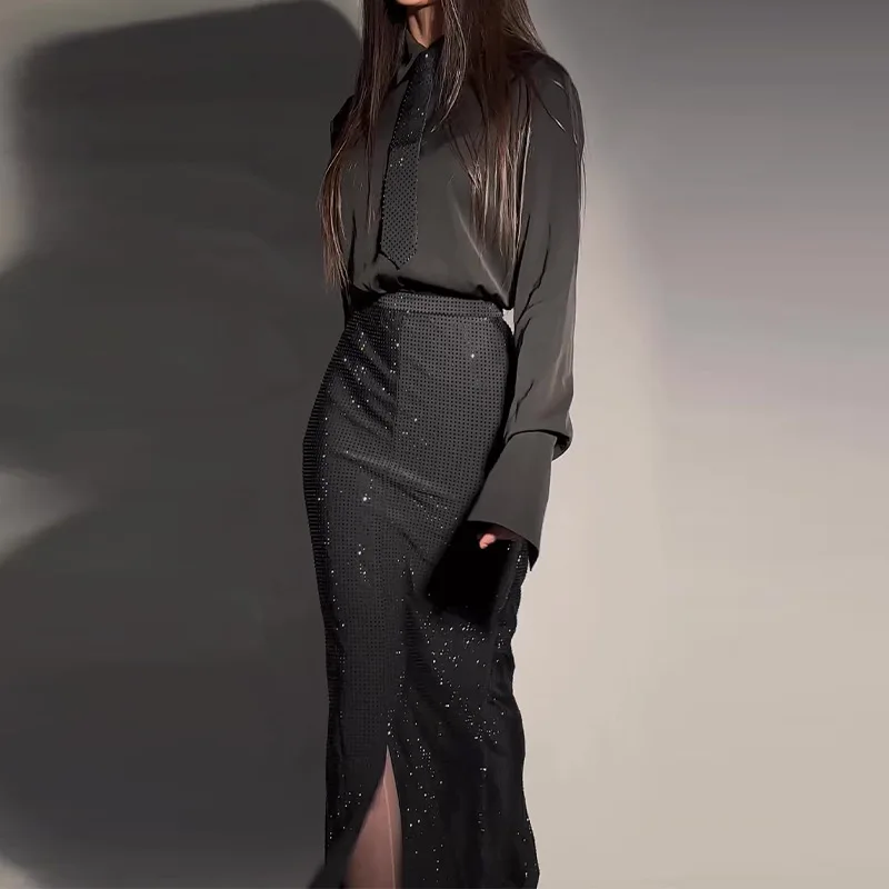 OUDINA Custom Women Elegant 2 Piece Sets Temperament Shirt And Heavy Industry Diamond Slit Skirt Set For Women