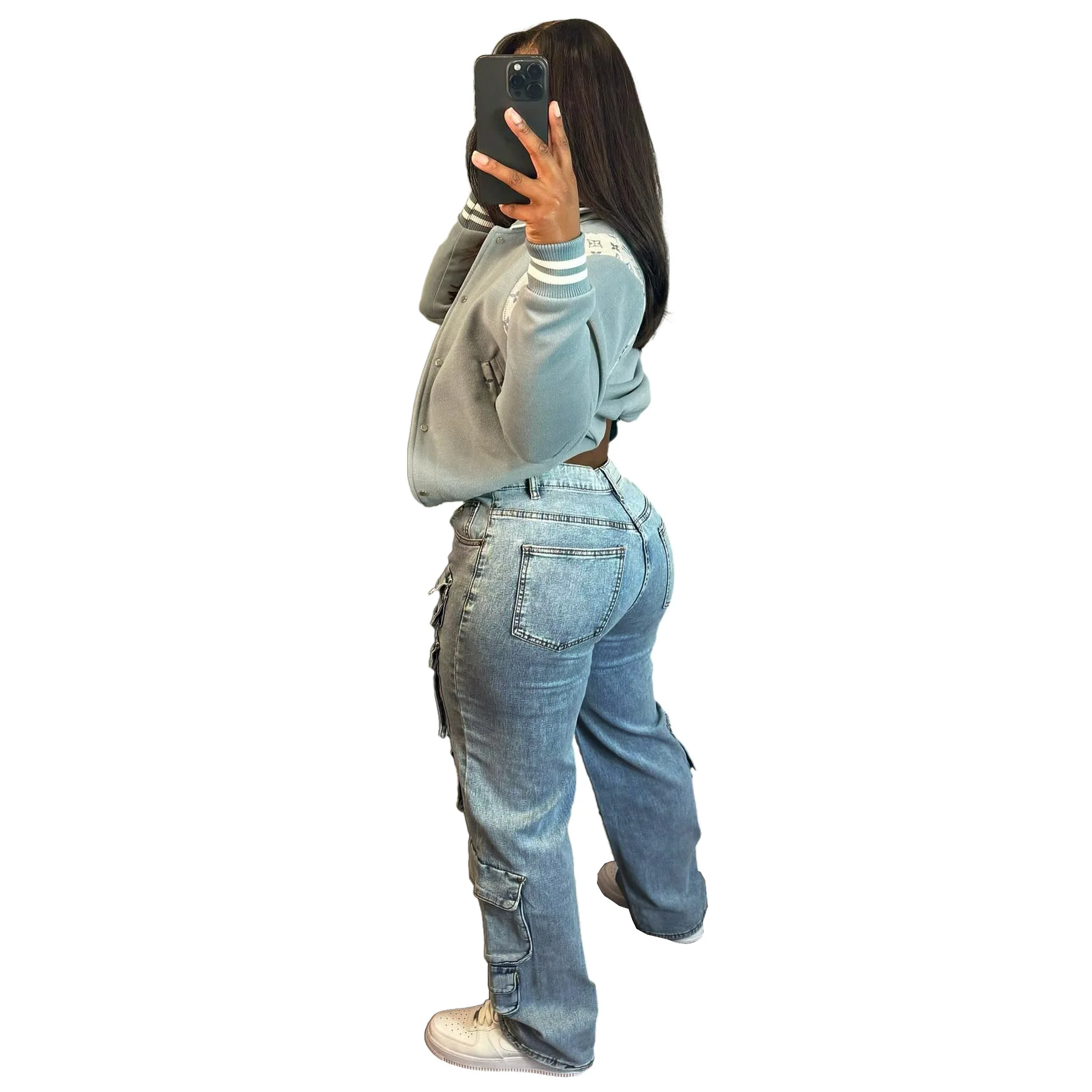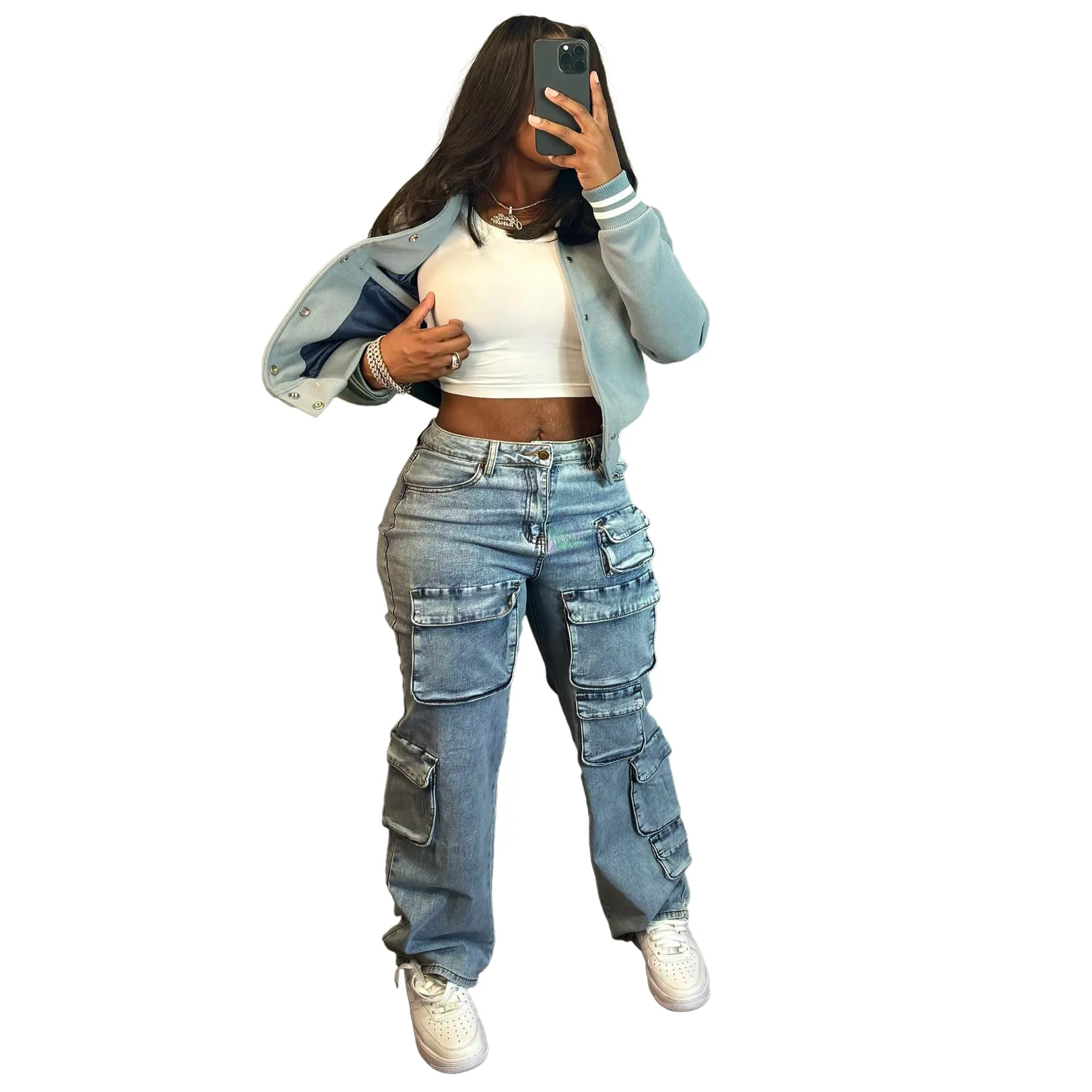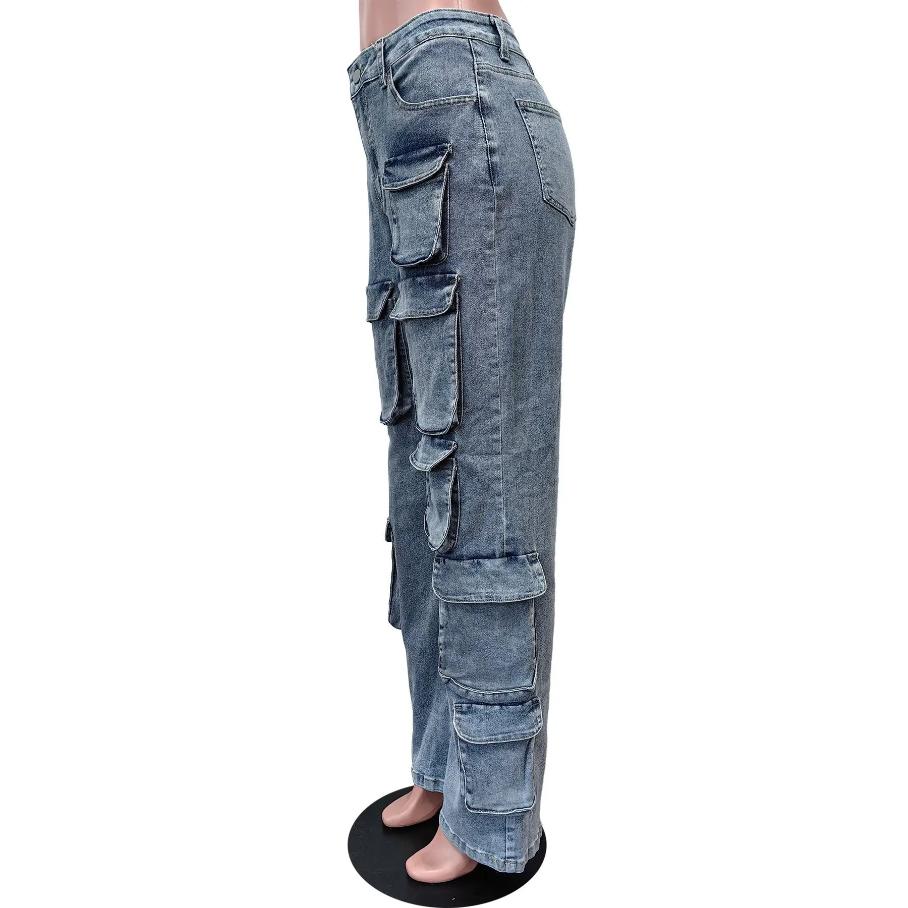 OUDINA Customize Wholesale Stretch Multi-pocket Pants Boyfriend Casual Straight Denim Trousers Ladies Jeans Pants For Women