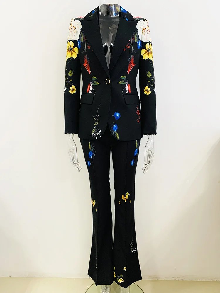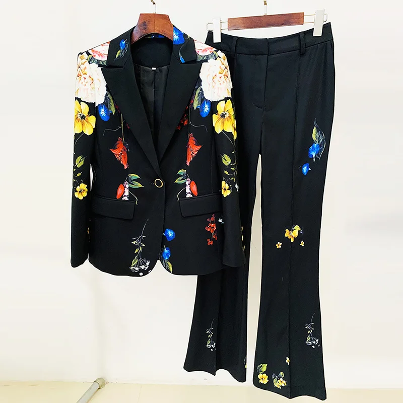 OUDINA Fashion Elegant One Button V Neck Suits Set For Women's Printing Long Sleeve Suits Set For Women