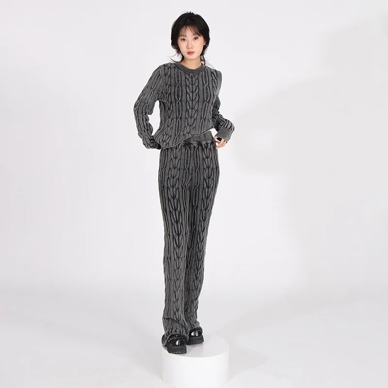 OUDINA Fashion Hot Sale Stretch Twist Short Cropped Top Knitted Sweater Two Piece Pants Set Women's Sets