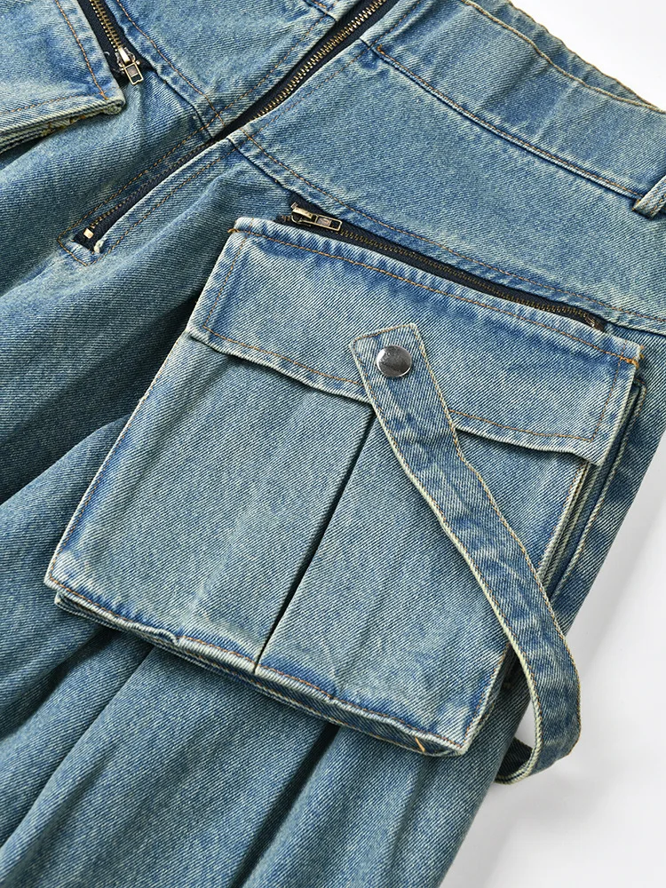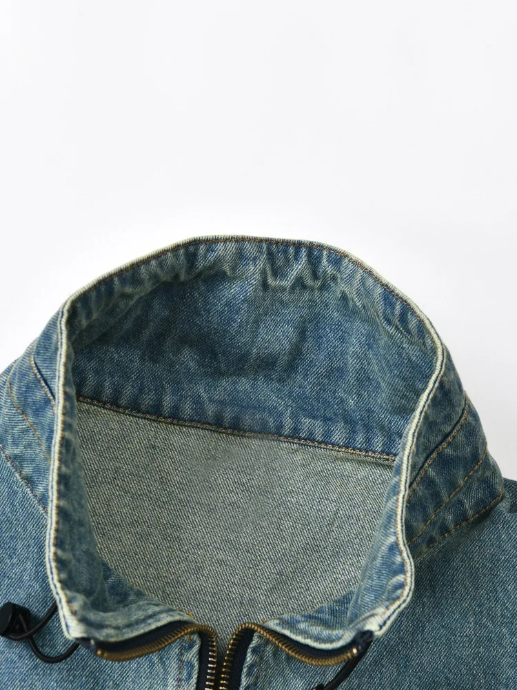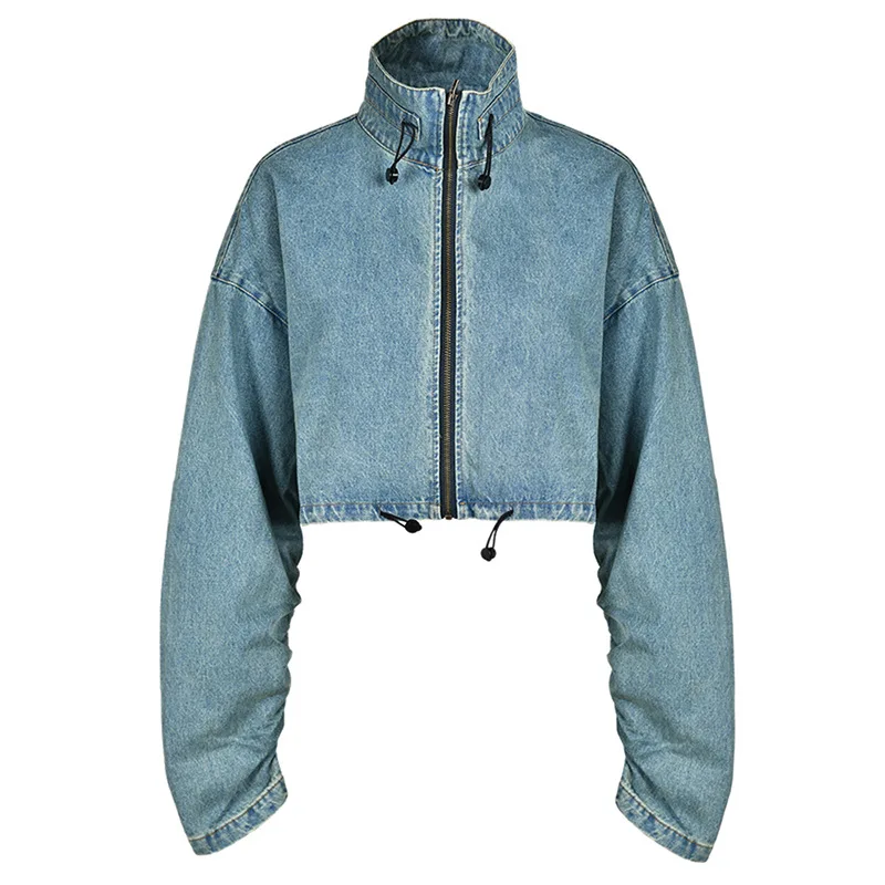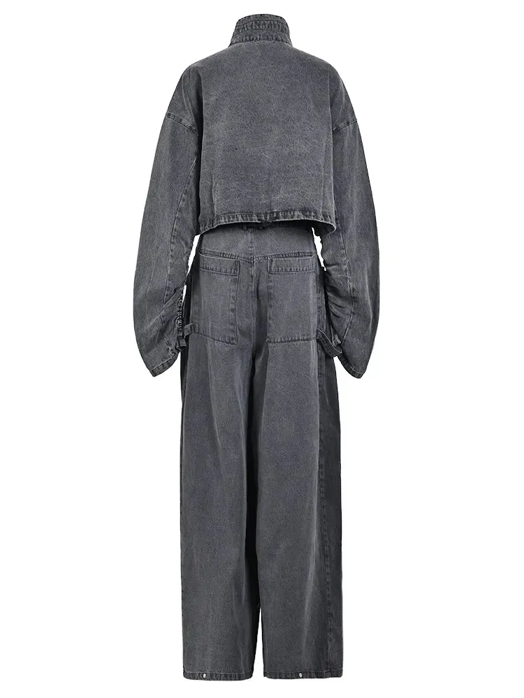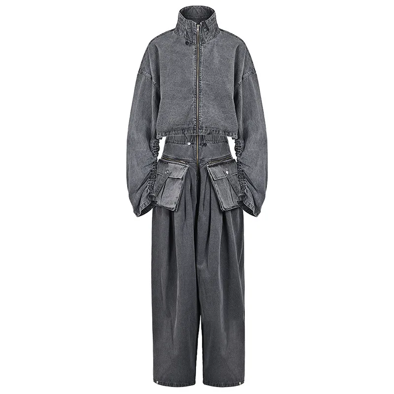 OUDINA Fashionable Denim Jacket Set Vintage High Waist Women Jean Pants Stand Neck Two Piece Set