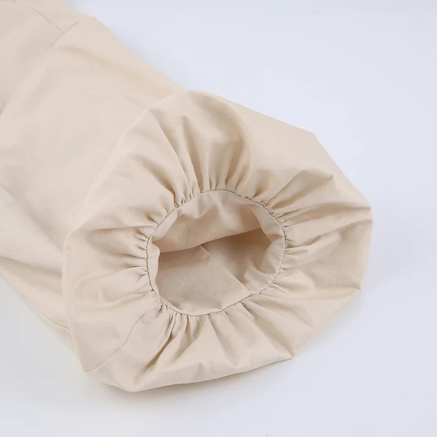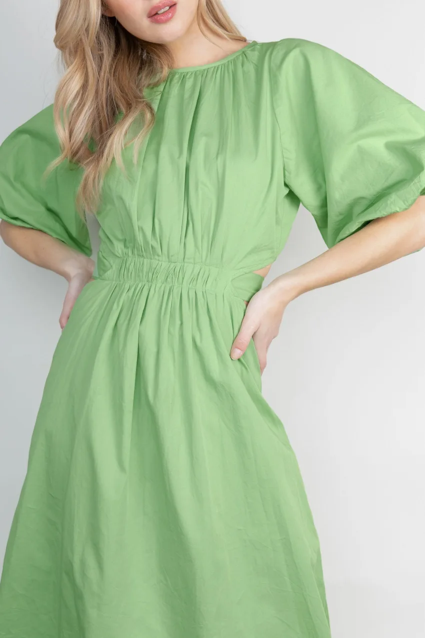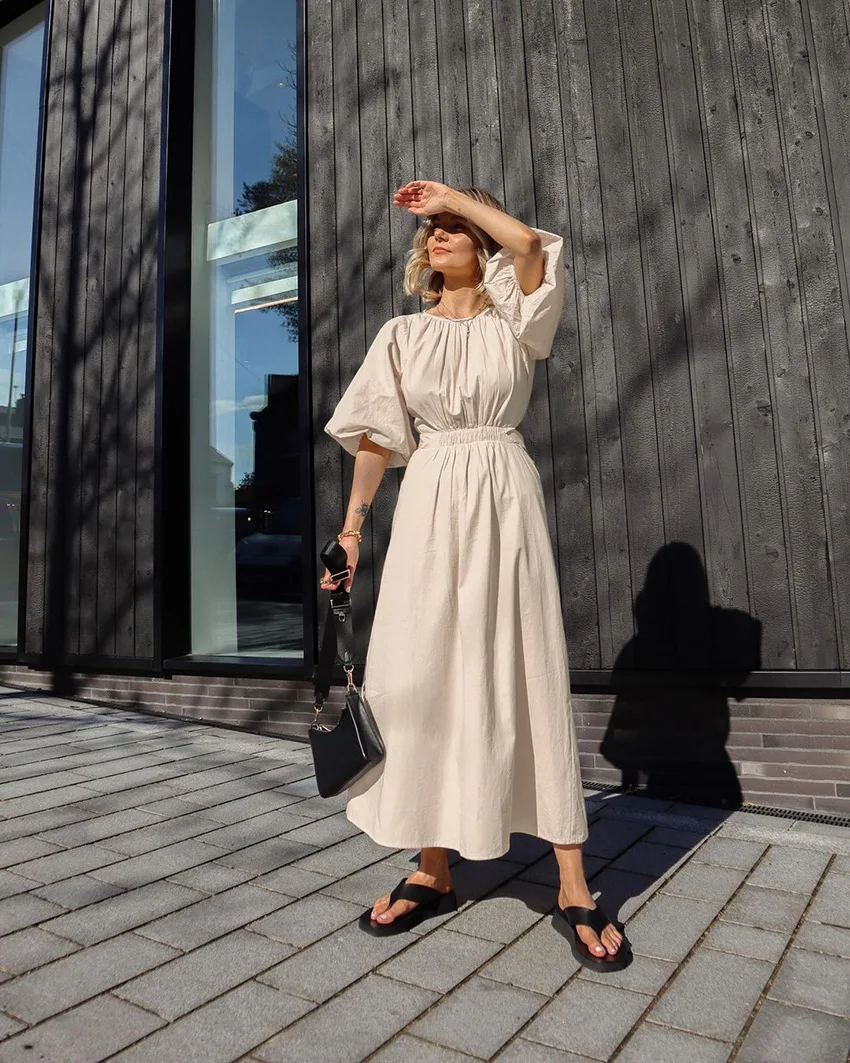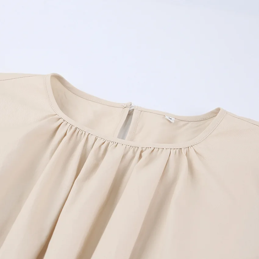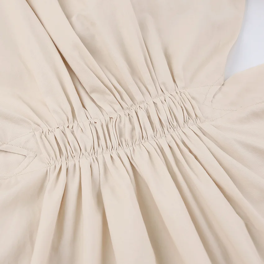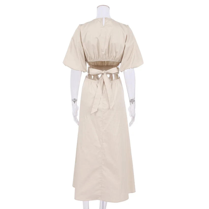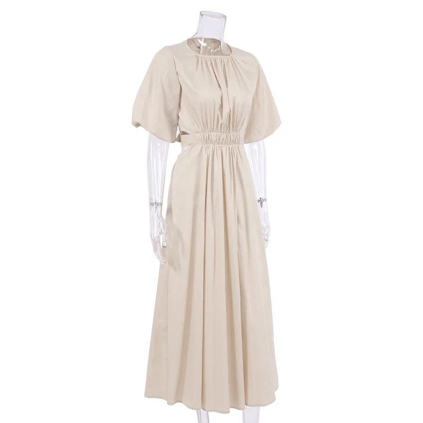 OUDINA Fashionable Loose Lace-up Hollow Puff Sleeve Cotton Pleated Long Womens Casual Dresses