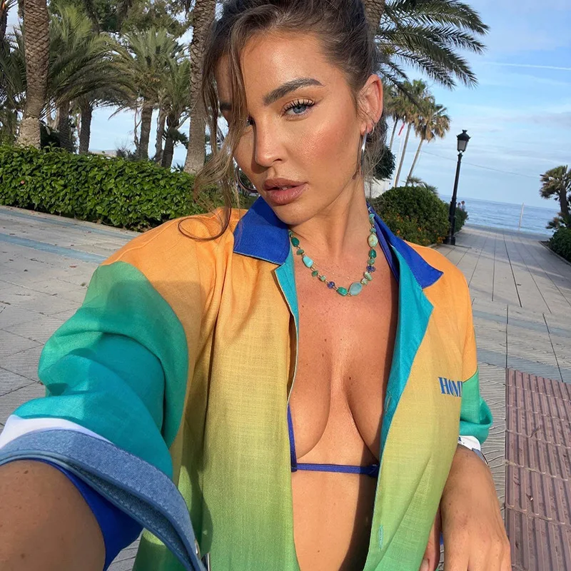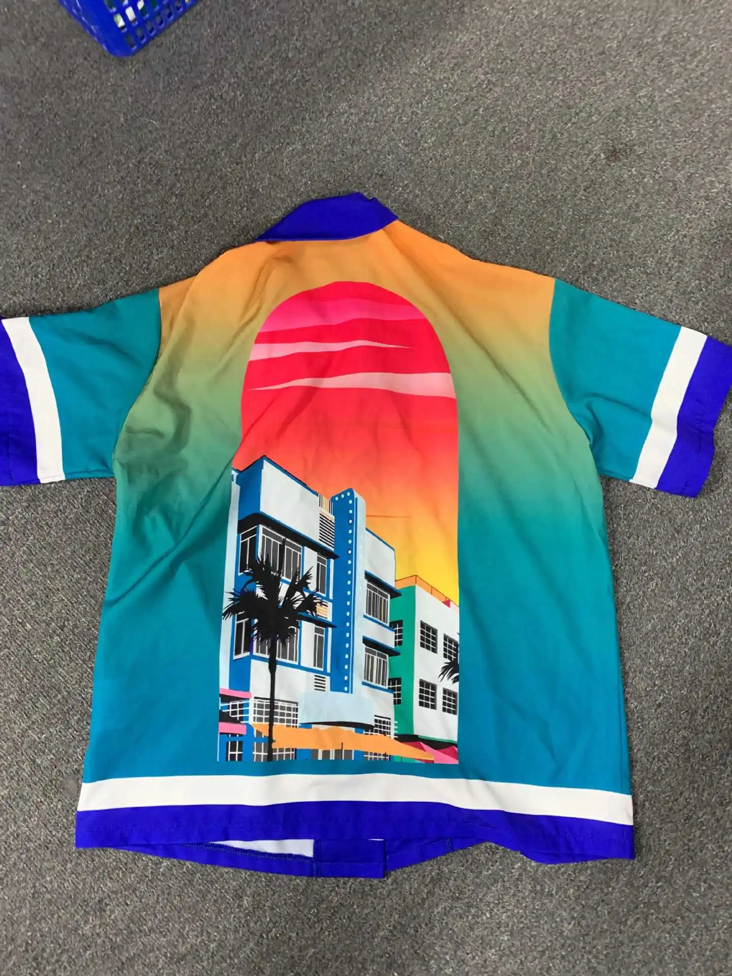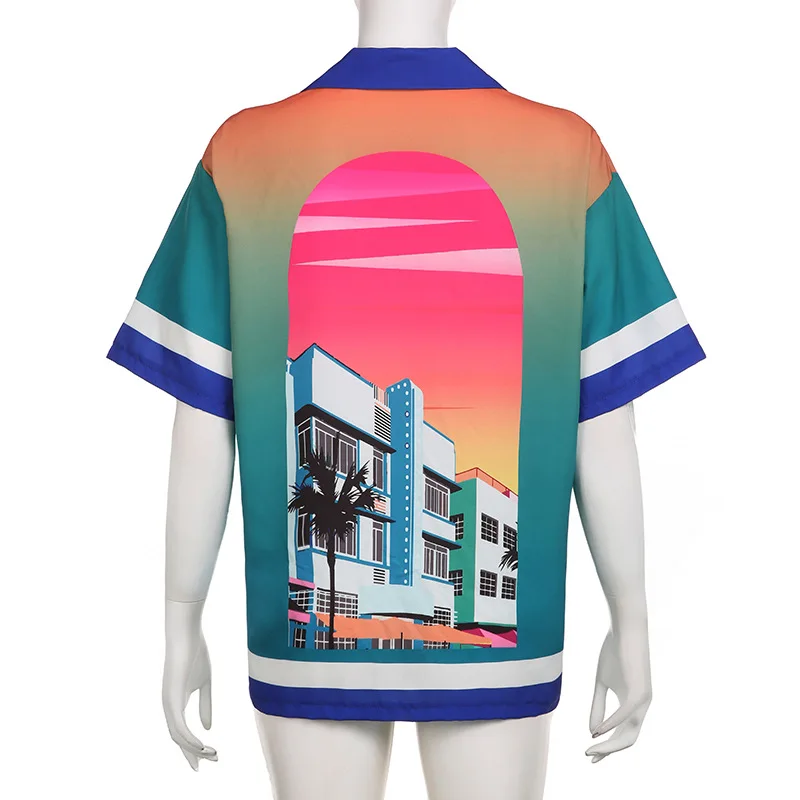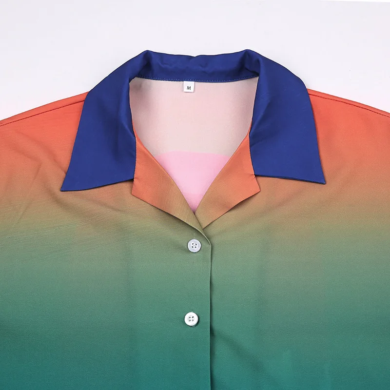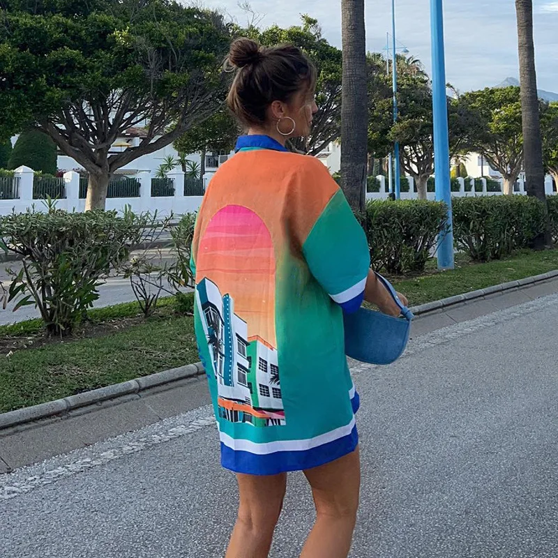 OUDINA Hot Sale Ladies Contrast Color Urban Print Lapel Single Breasted Loose Vacation Casual Shirt