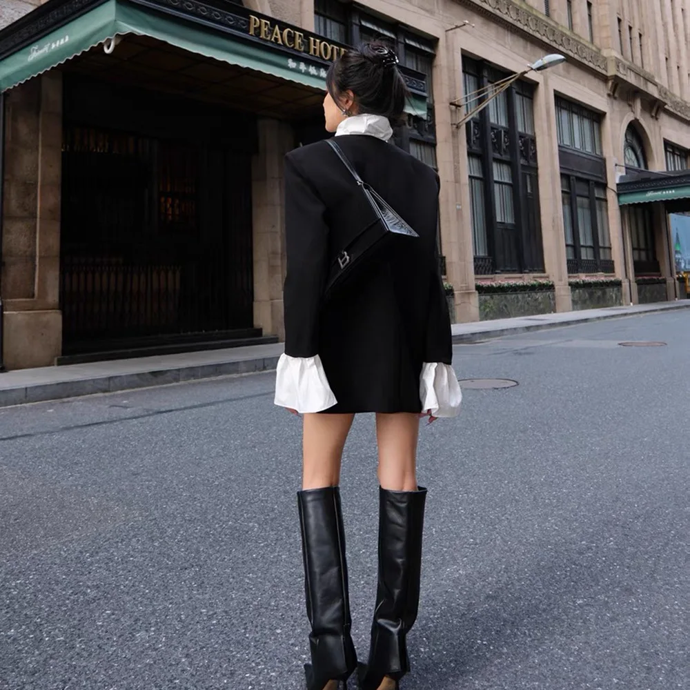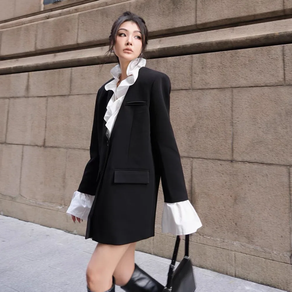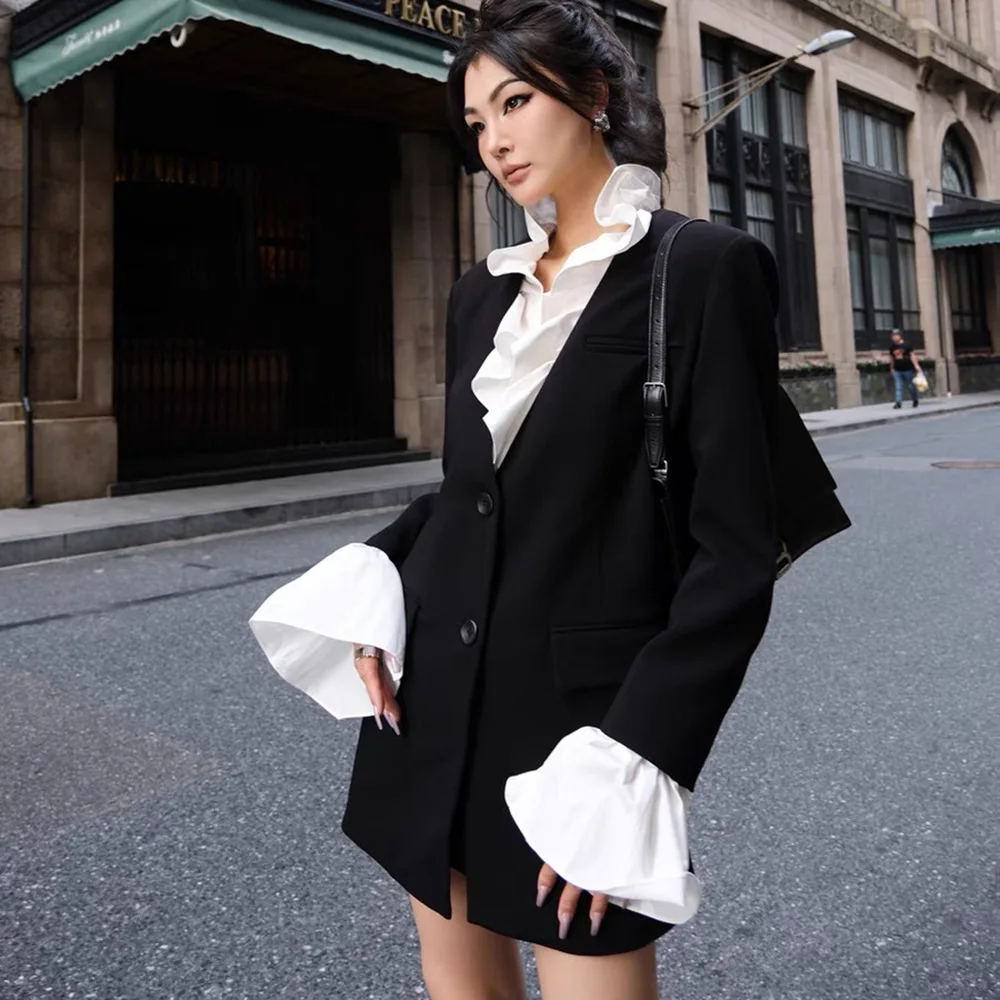 OUDINA New Style Ladies Women Jackets Contrasting Bell Sleeve Lotus Leaf Collar Suit Jacket Women's Suits Blazers