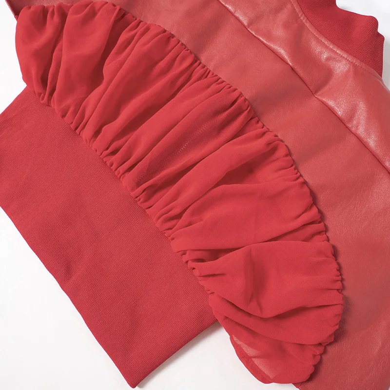 OUDINA New Style Splicing Mesh Crop Top Leather Jacket Zipper Short Sleeve Waist Women Jackets Coats