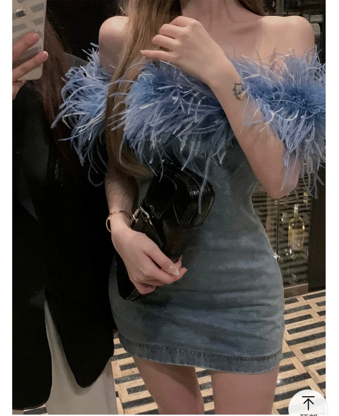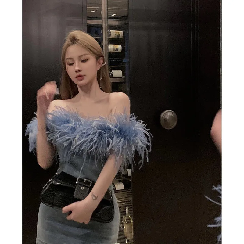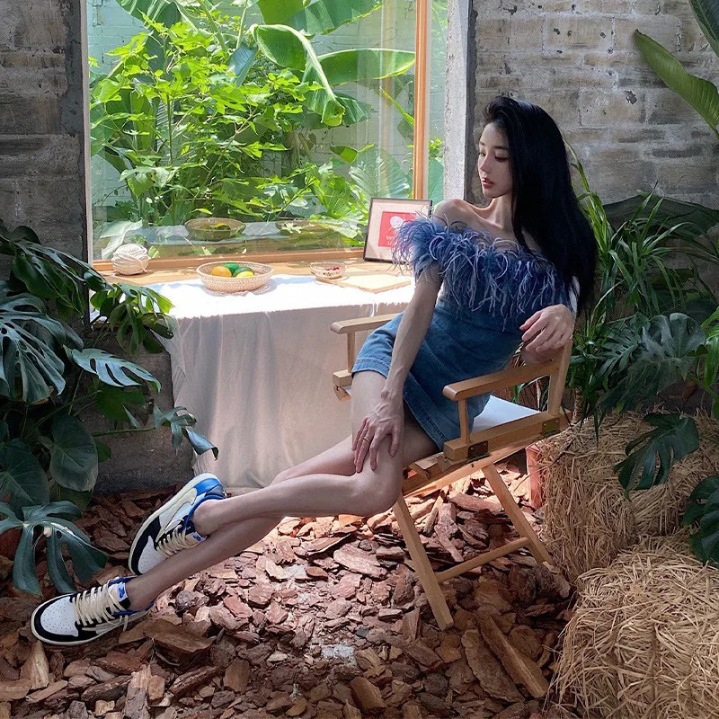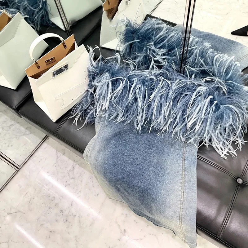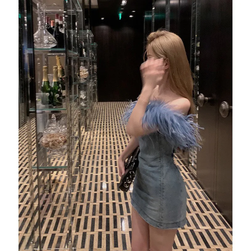 OUDINA New Wrap Chest Zipper Stitching Short Bodycon Wash Jean Dresses Denim Dress Women