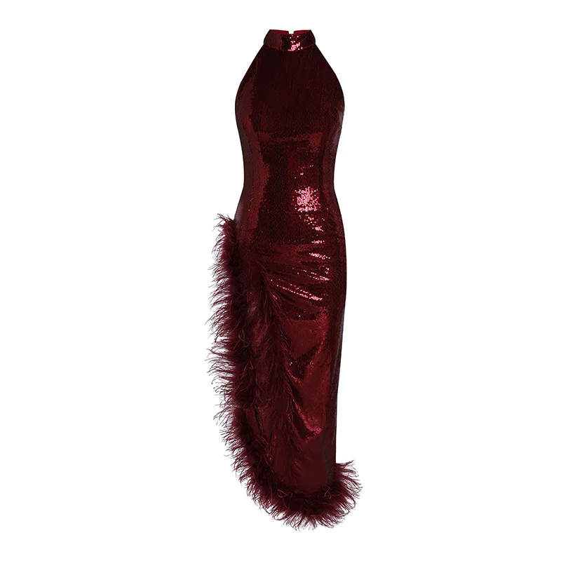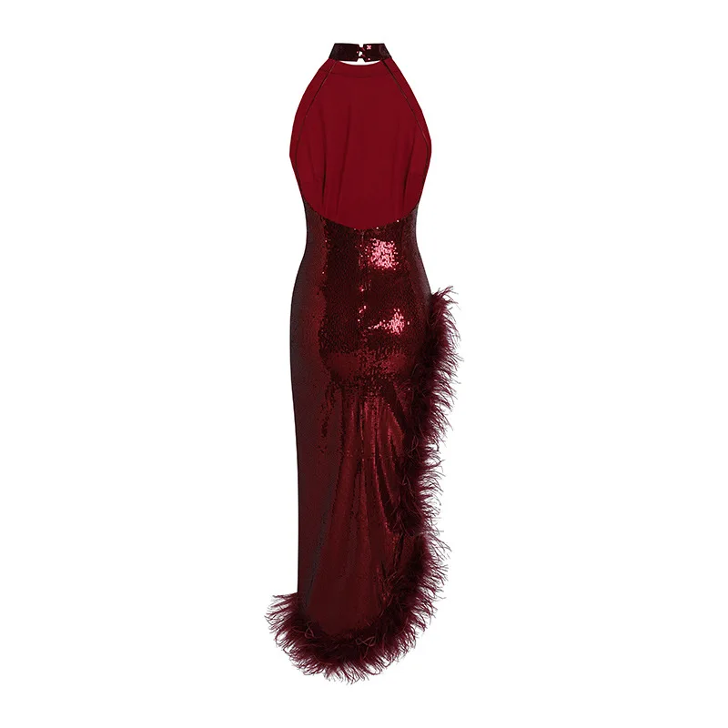 OUDINA Wholesale Backless Irregular Halter Neck Feather Party Long Dress Bling Sequin Women Evening Elegant Dresses