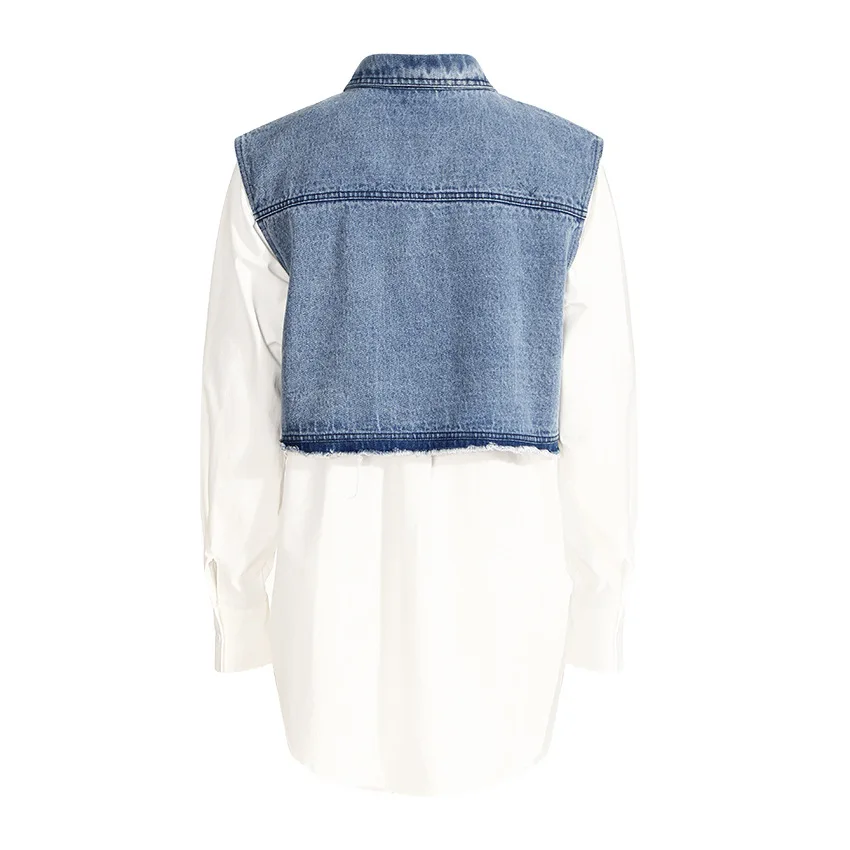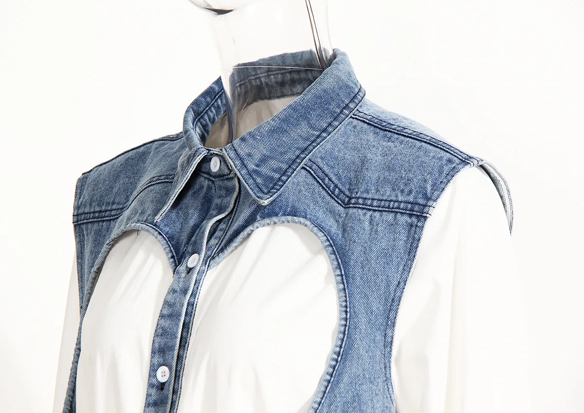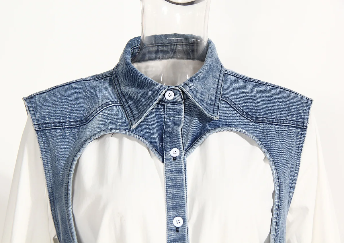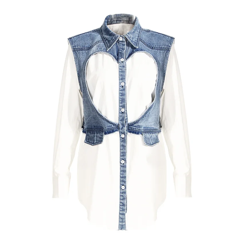 OUDINA Wholesale RTS Casual Patchwork Denim Top Heart-shaped Cotton Hollow Ladies Shirt Tops Women's Blouses & Shirts