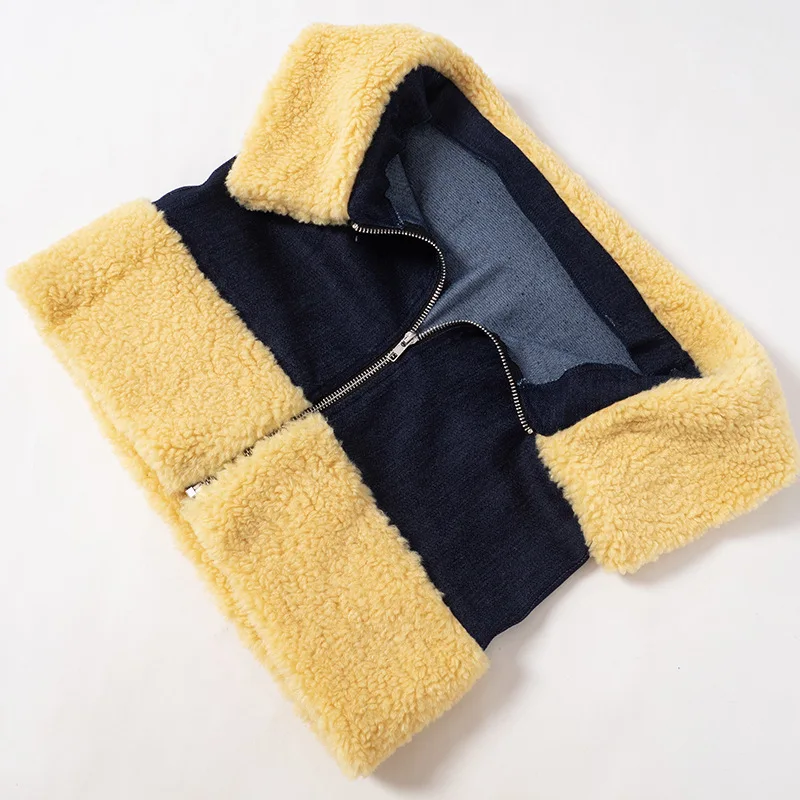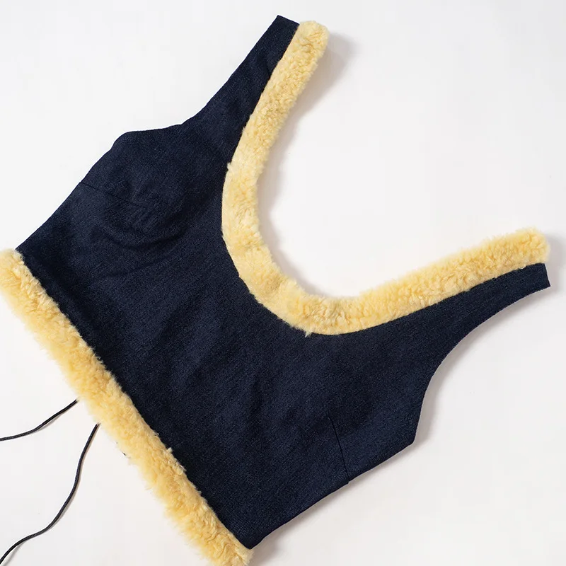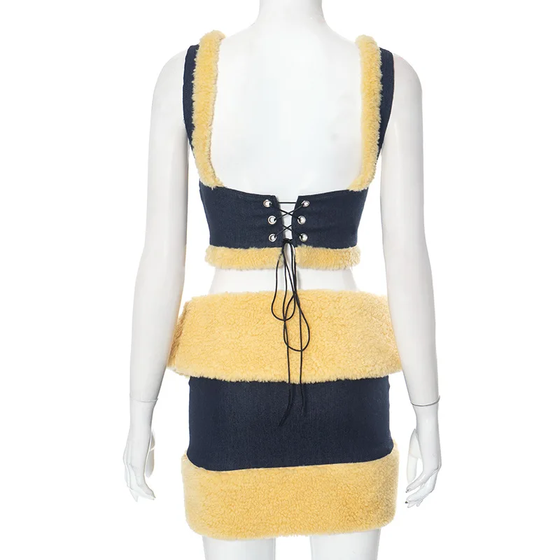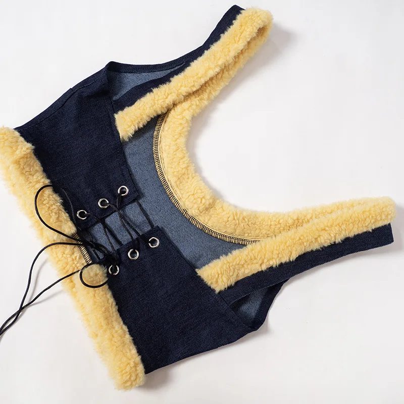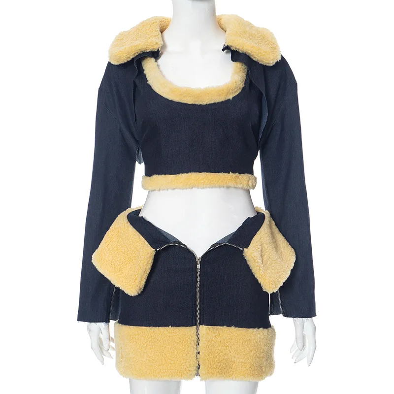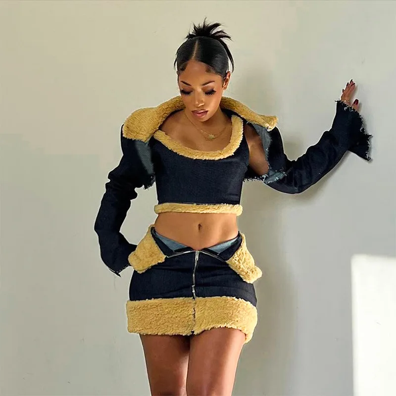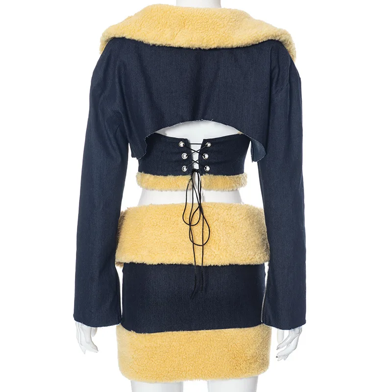 OUDINA Women's Denim Patchwork Woolen Long-sleeved Jacket Lace-up Sleeveless Vest Three Piece Skirt Set