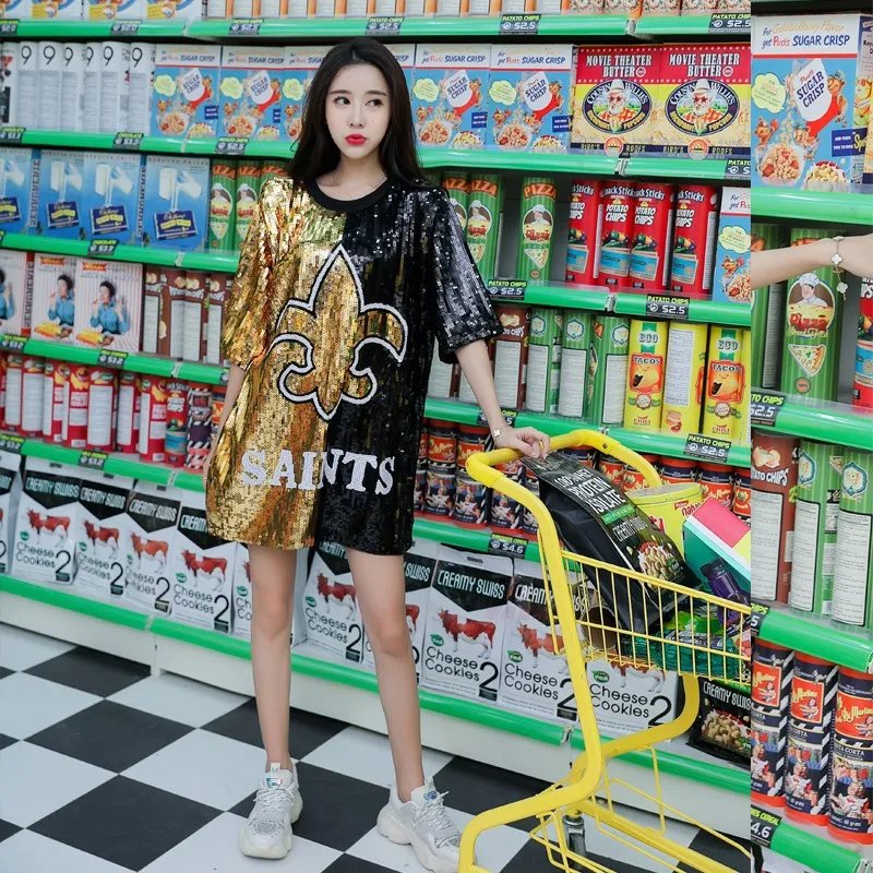 Oversize Boyfriend Style Nfl Women Casual Fashion Bling Sequins T-Shirts Girl's Sexy Loose Short Sleeve Long T Shirt dress