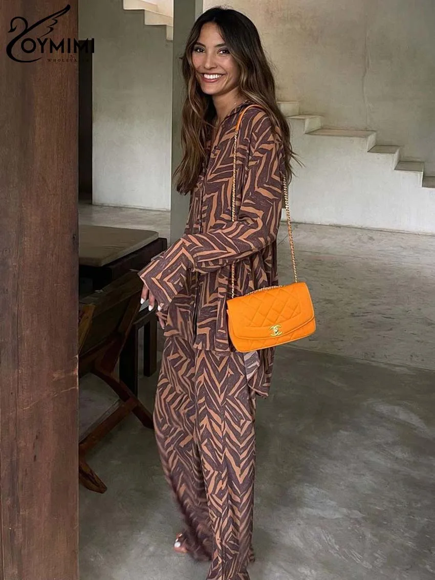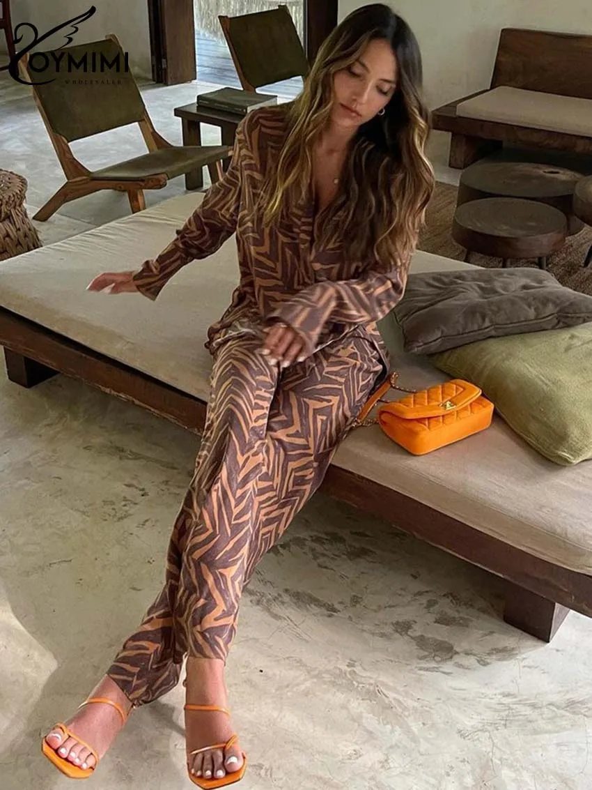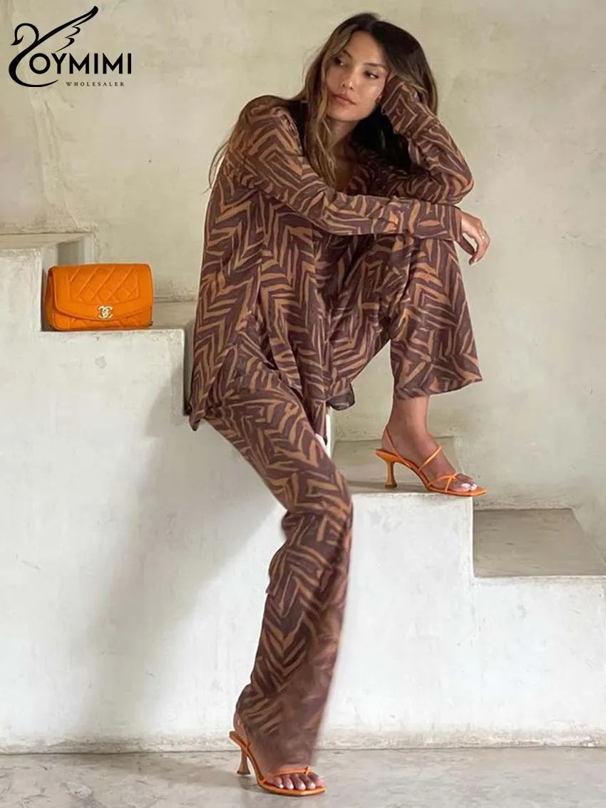Oymimi Casual Brown Print Sets Womens 2 Piece Elegant Long Sleeve Button Side Slit Shirts And High Waisted Straight Trousers Set