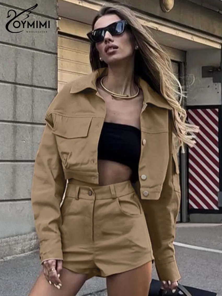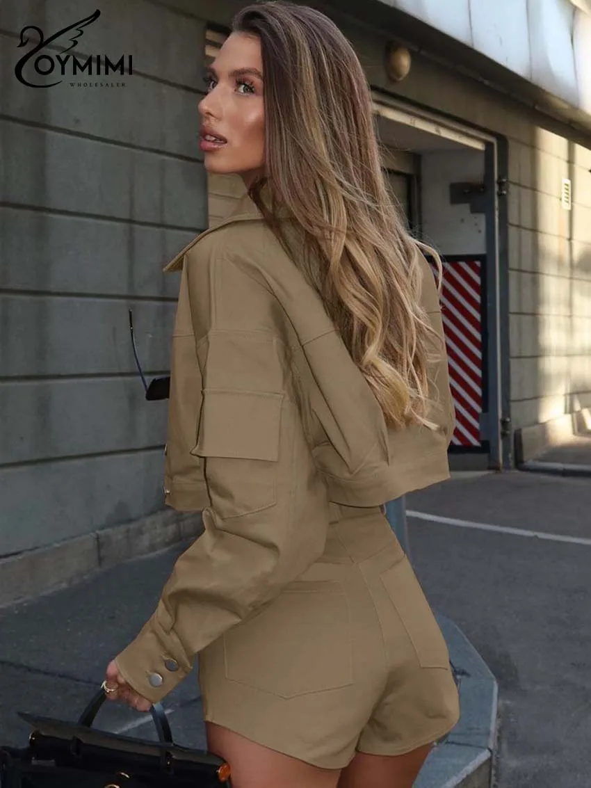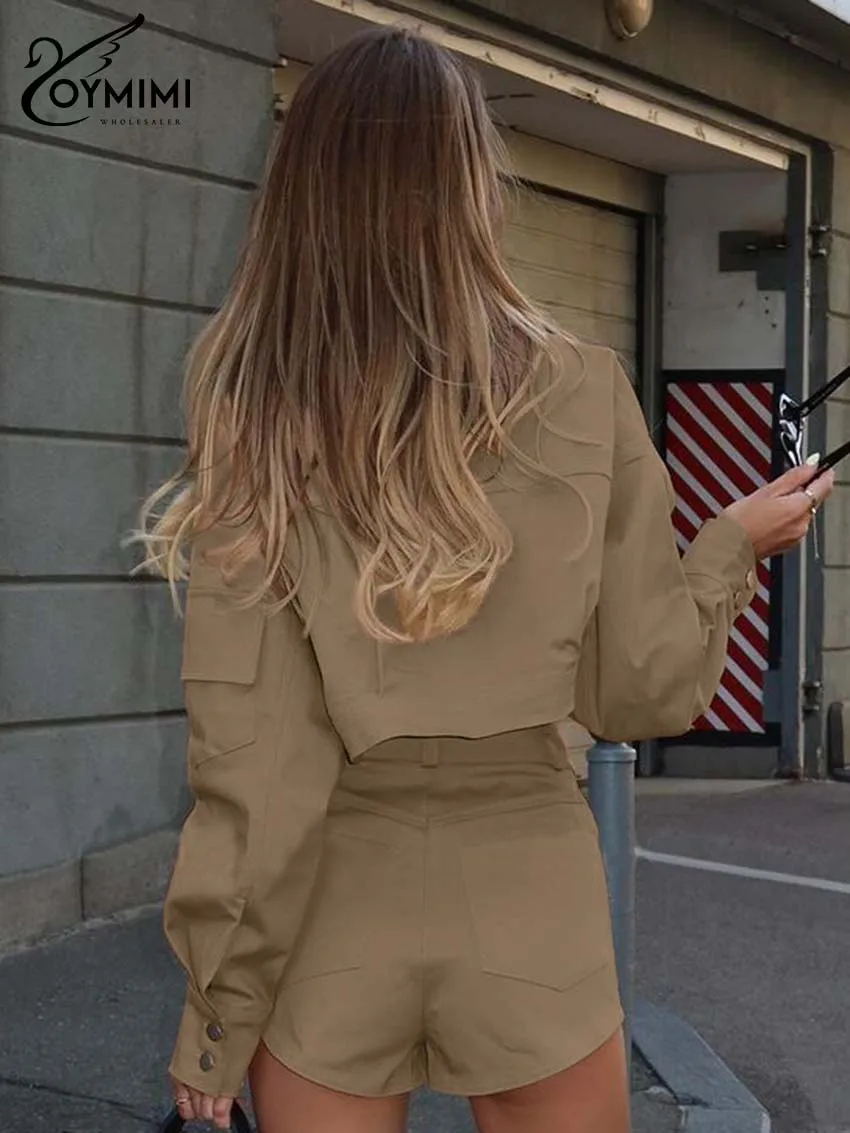 Oymimi Casual Khaki Womens 2 Piece Outfit Set Fashion Long Sleeve Button Pockets Shirts And High Waist Simple Shorts Streetwear