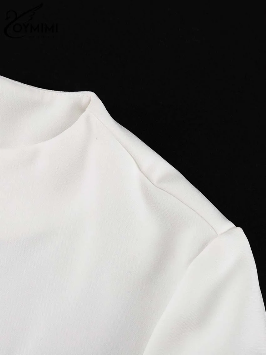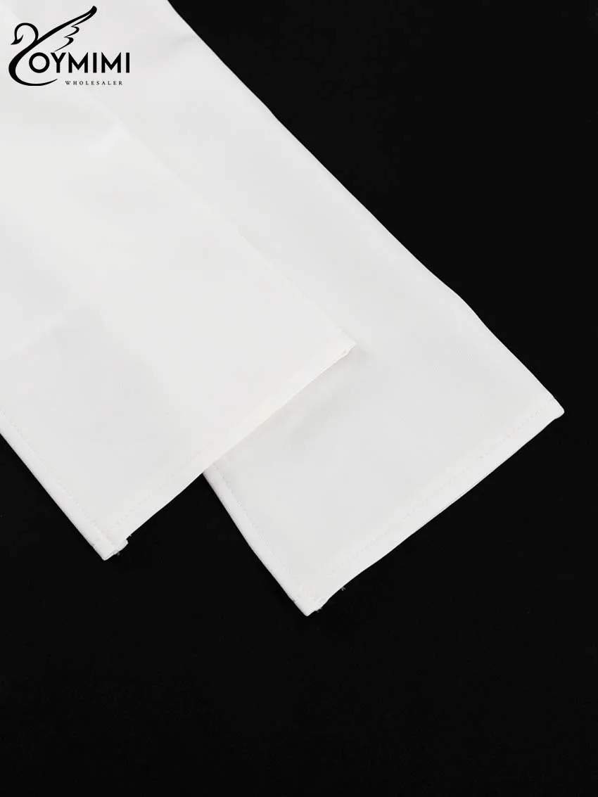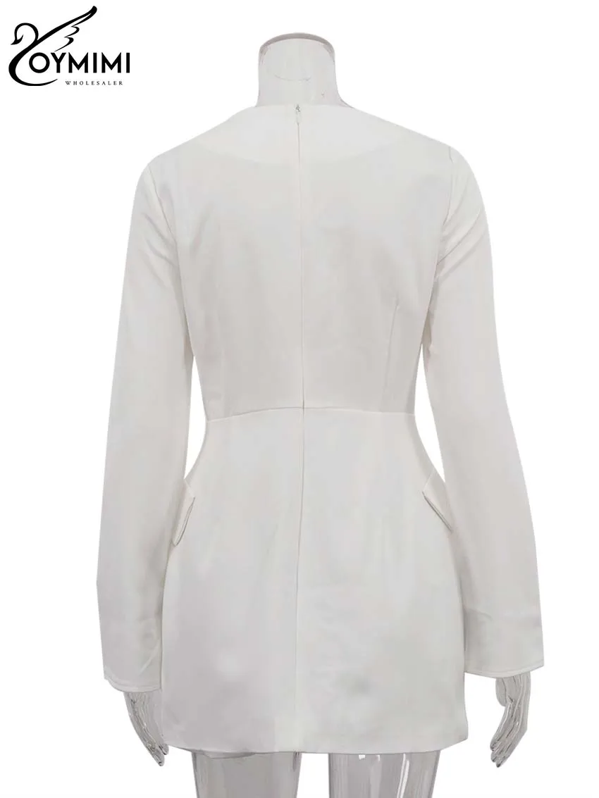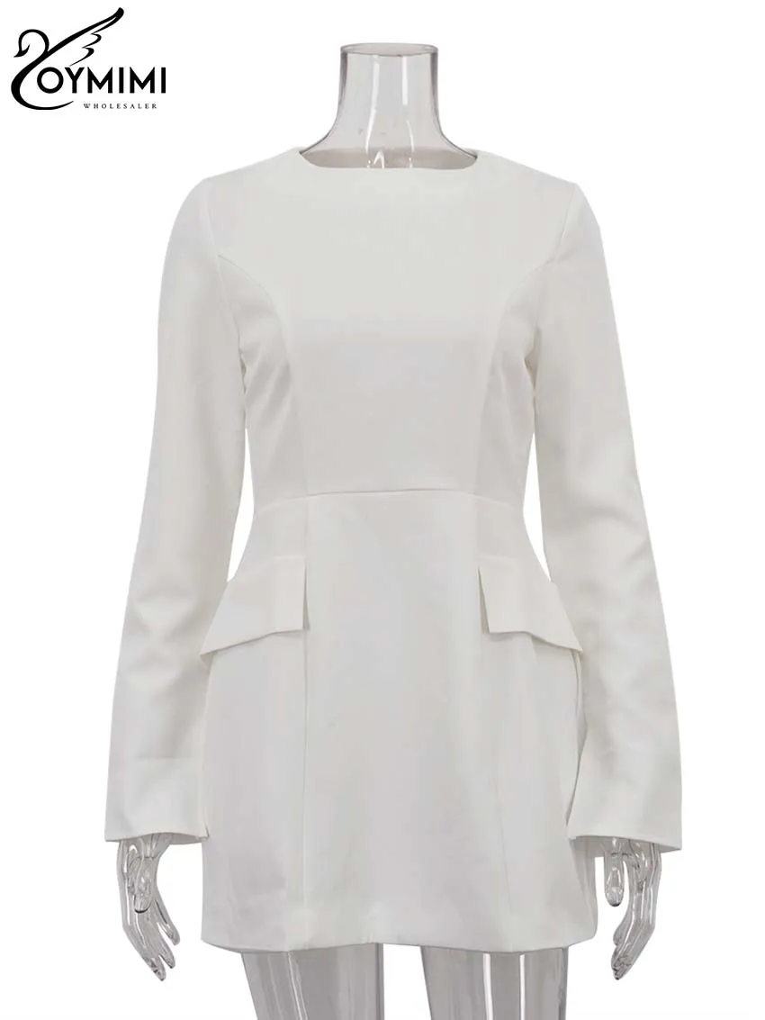 Oymimi Casual White O-Neck Dresses For Women Elegant Long Sleeve Slim Pockets Dresses Autumn Straight Mini Dress Female Clothing
