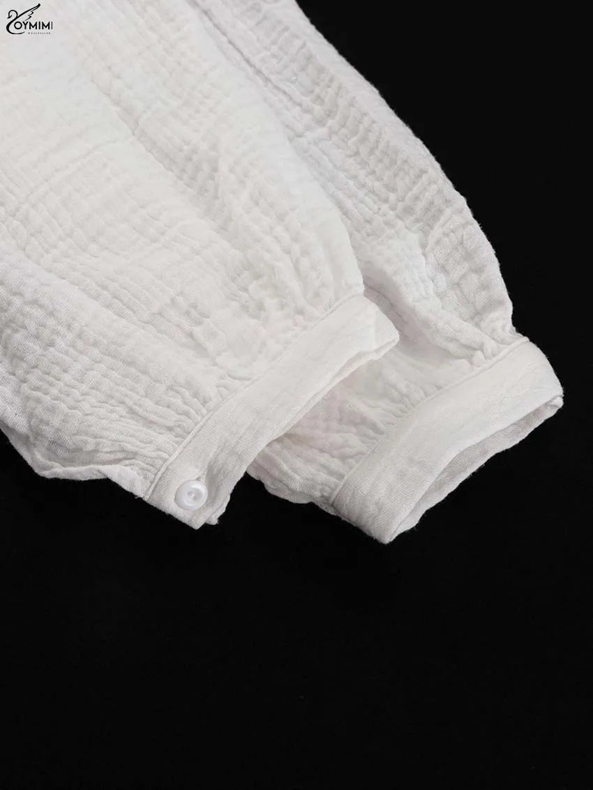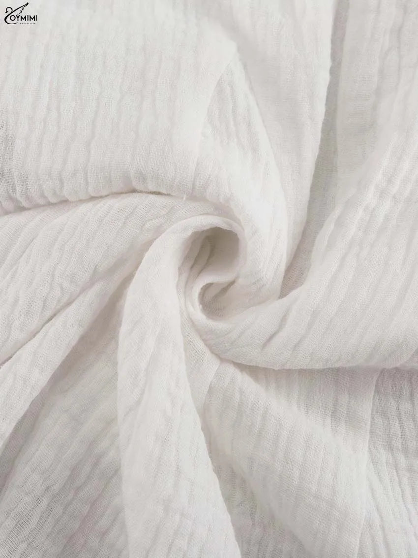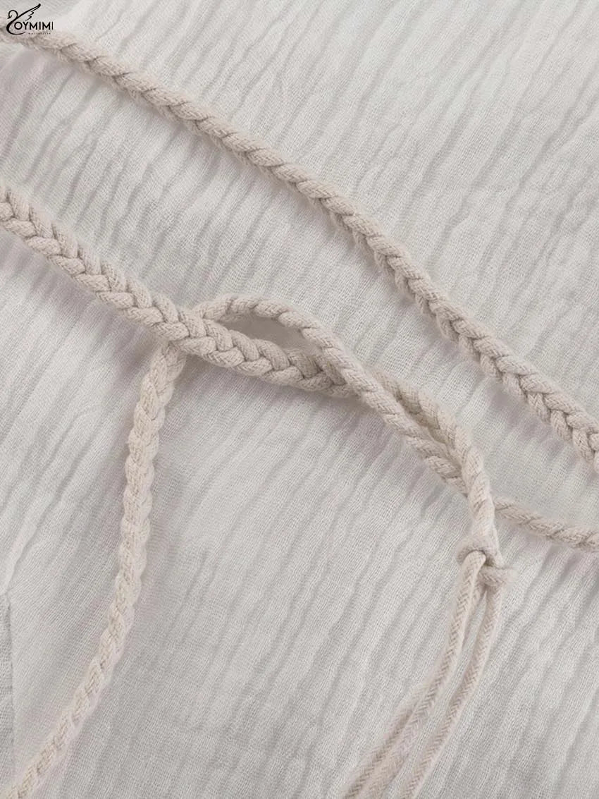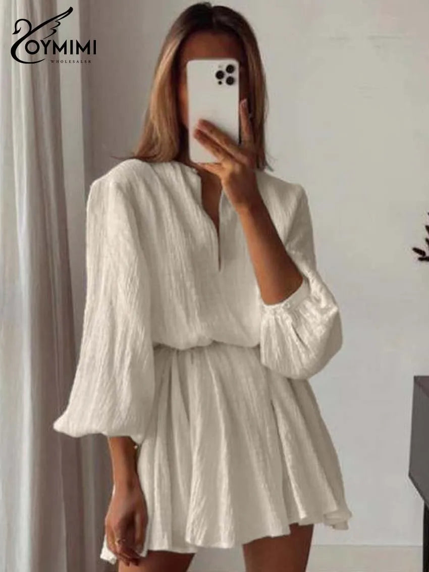 Oymimi Elegant Beige Cotton Womens Dresses Fashion V-Neck Long Sleeve Lace-Up Dresses Casual Loose Pleated Mini Dress Streetwear