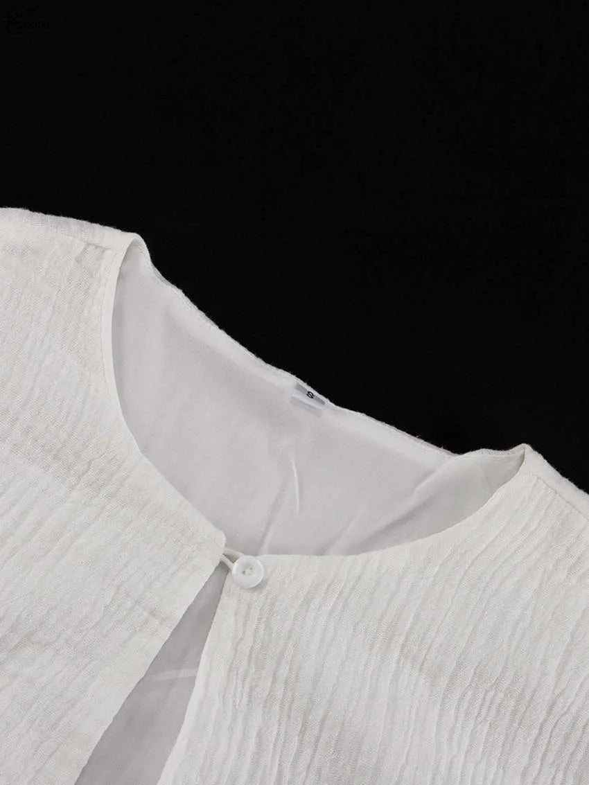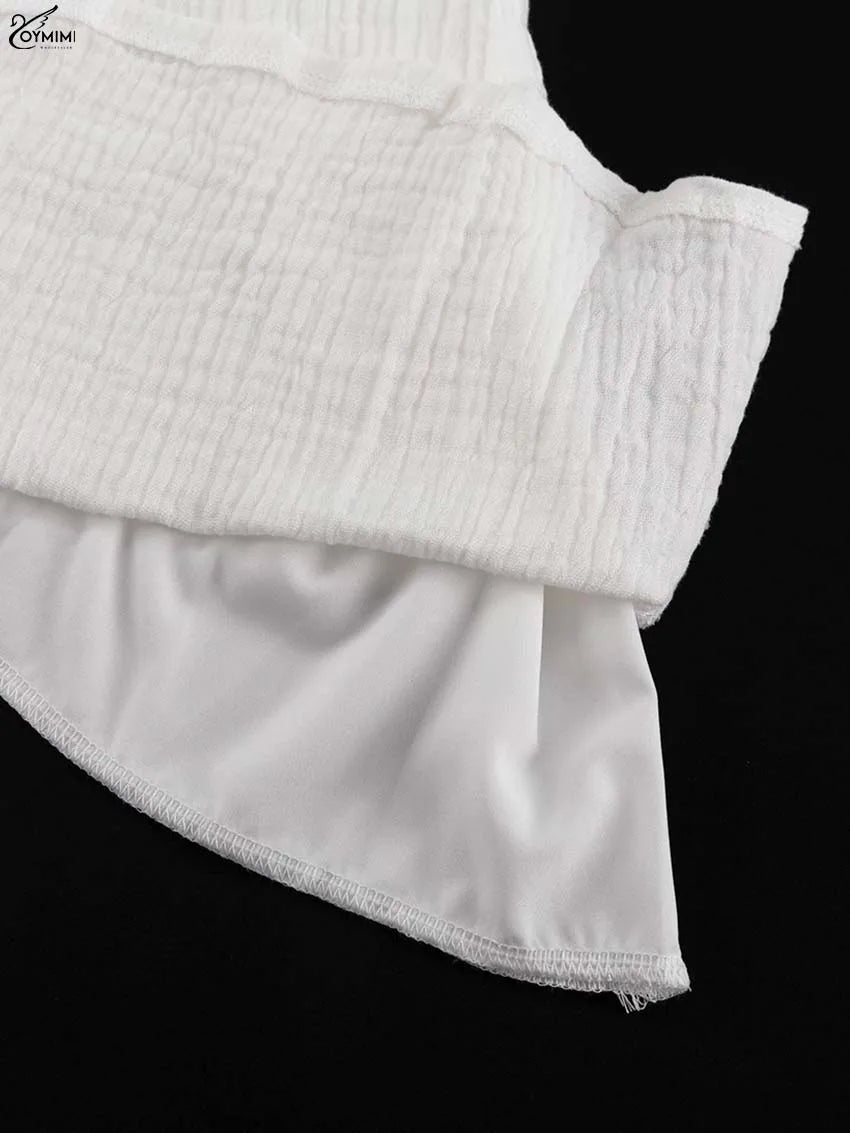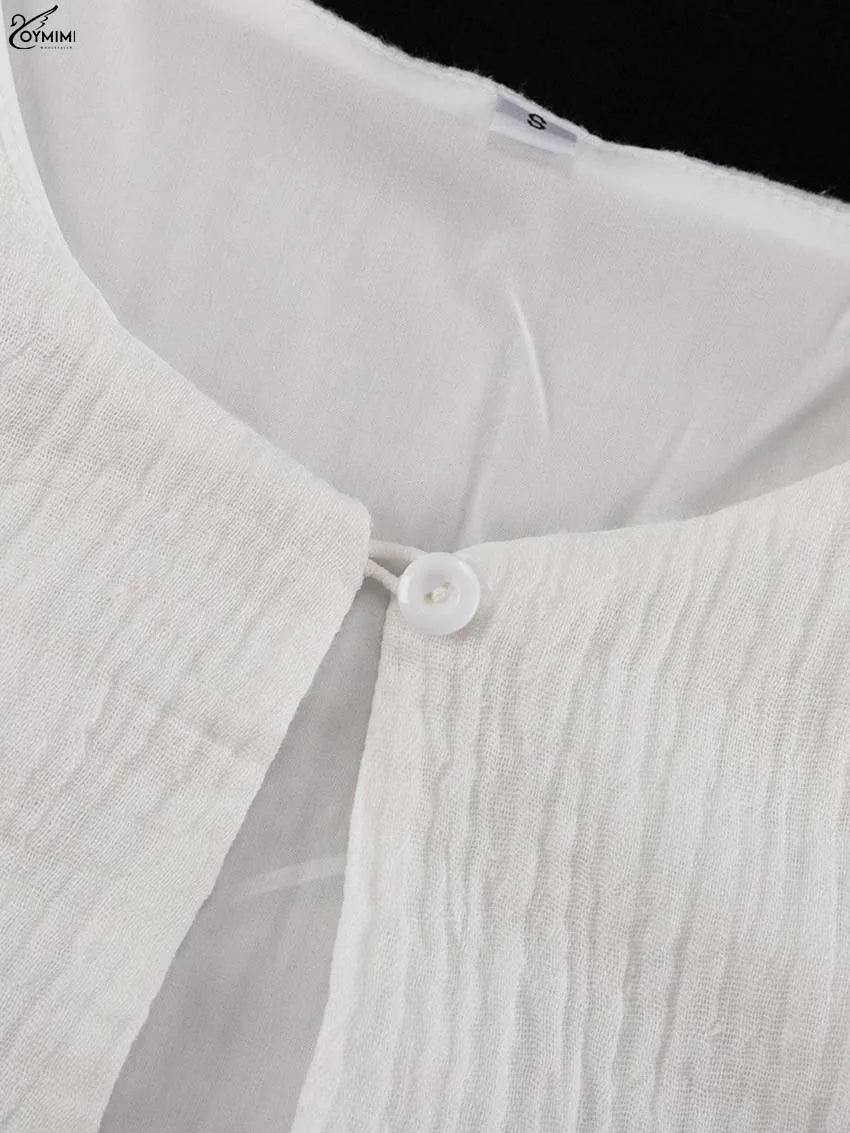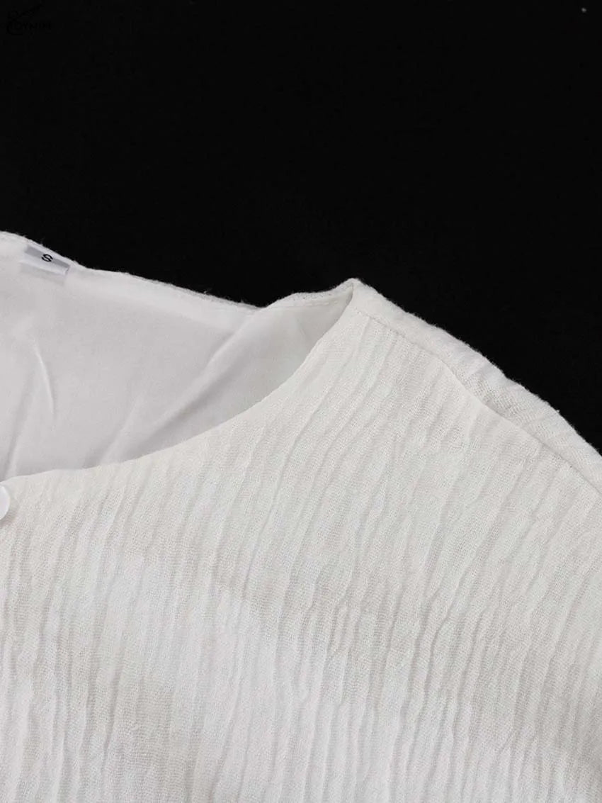 Oymimi Elegant Beige Cotton Womens Dresses Fashion V-Neck Long Sleeve Lace-Up Dresses Casual Loose Pleated Mini Dress Streetwear