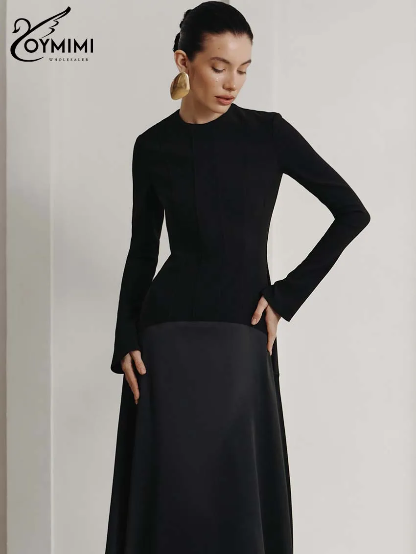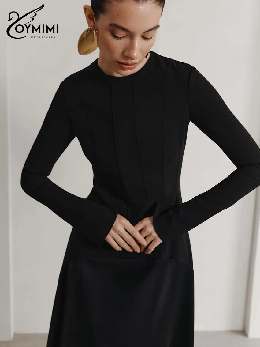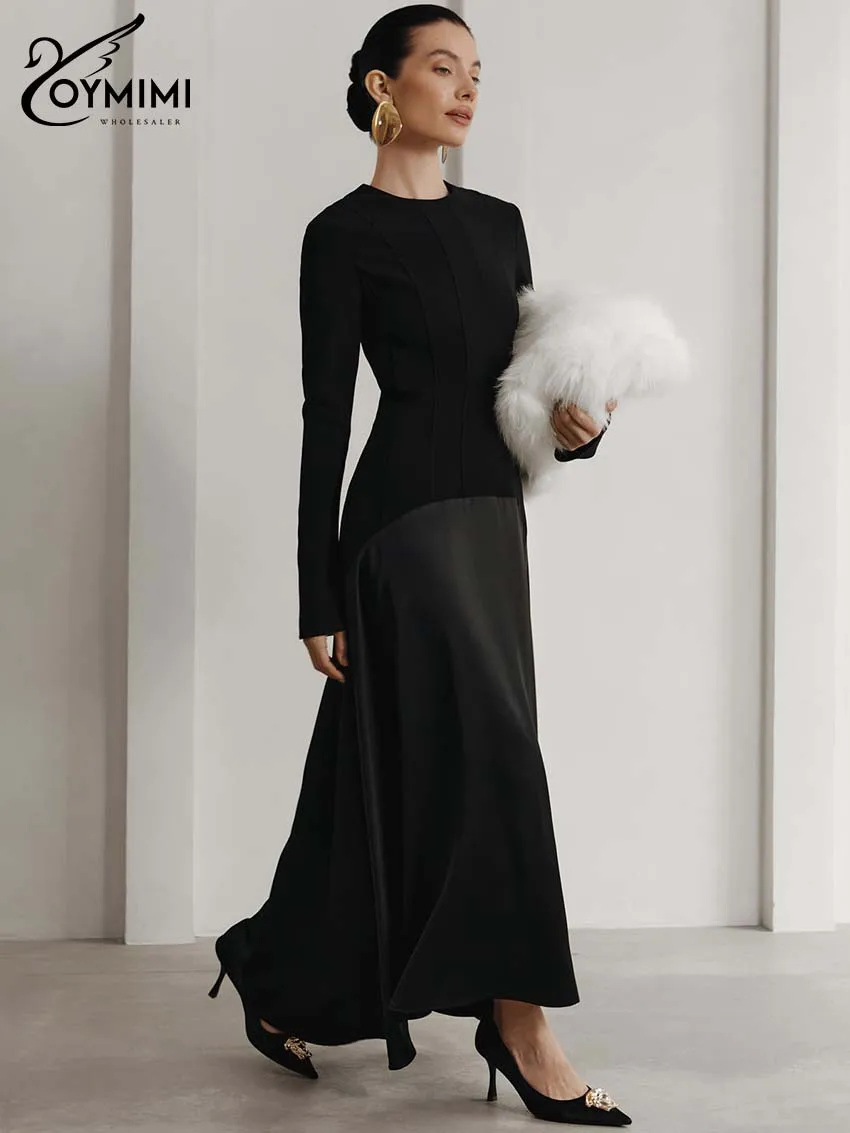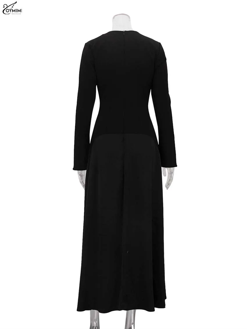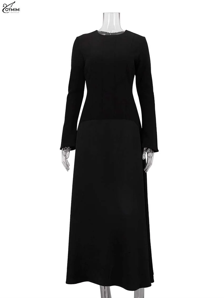 Oymimi Elegant Black O-Neck Womens Dresses Fashion Long Sleeve Patchwork Slim Dresses Casual New Straight Ankle-Length Dress