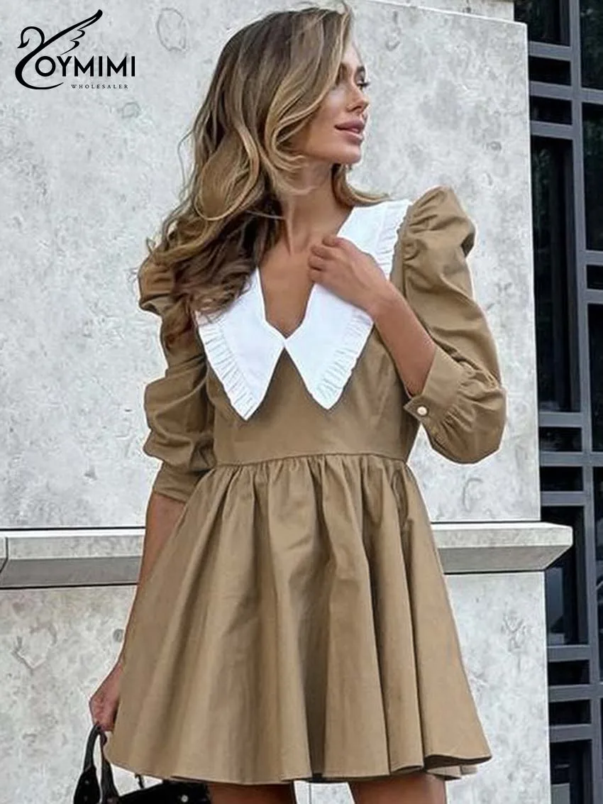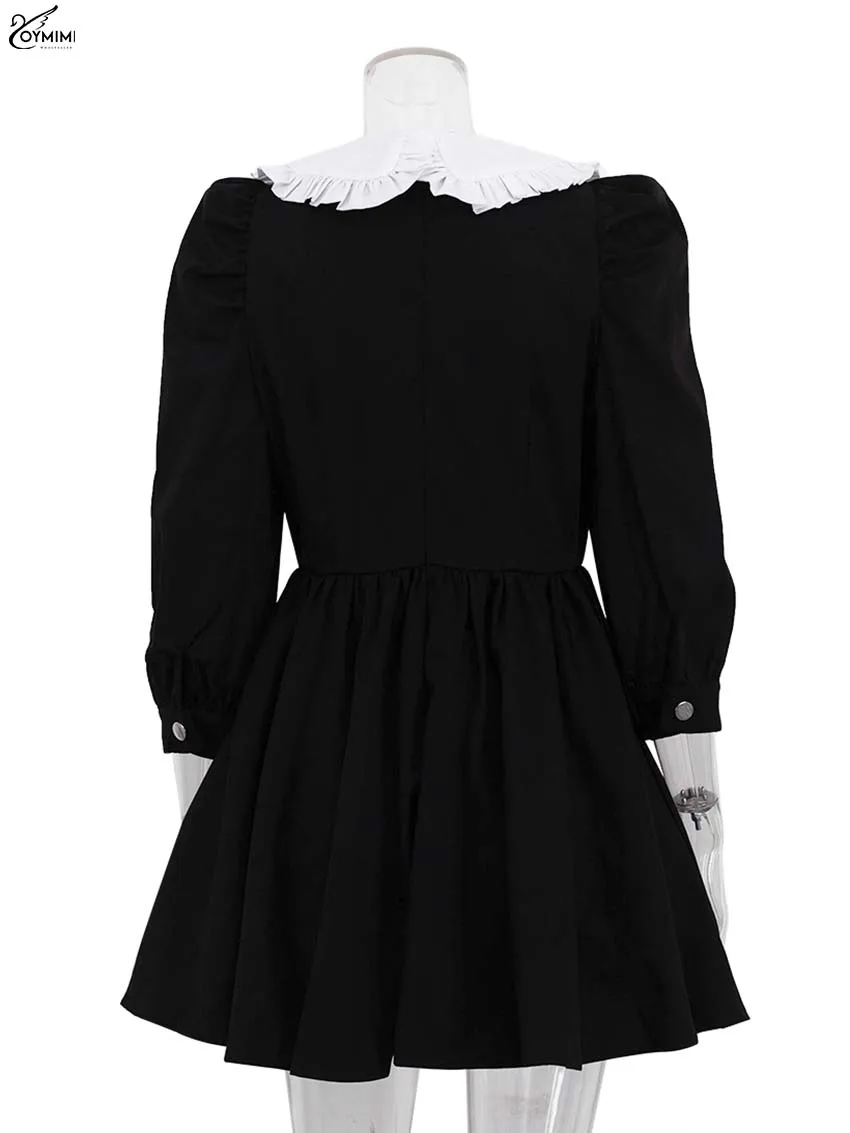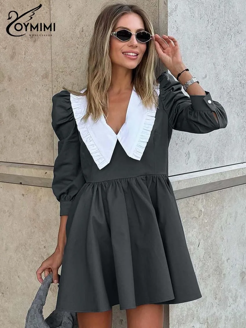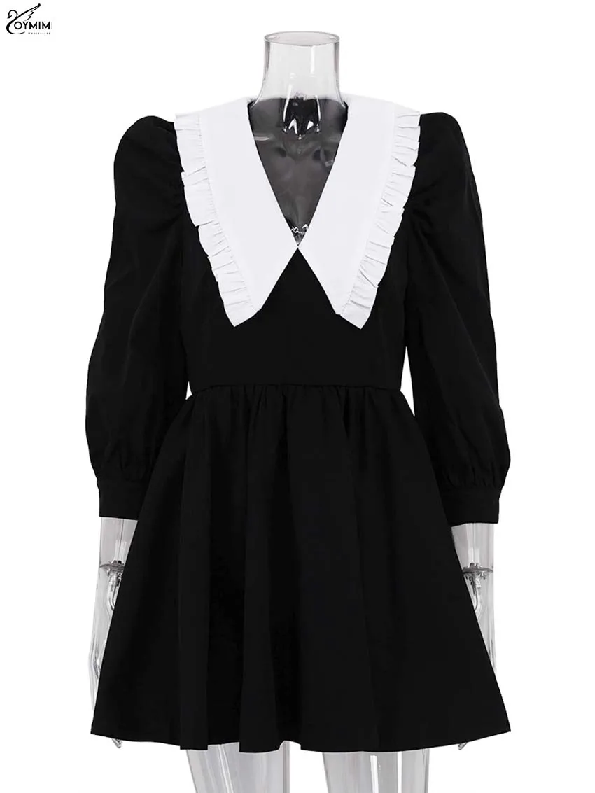 Oymimi Elegant Black Patchwork Women's Dress Casual Peter Pan Collar Three Quarter Sleeve Dresses Fashion Pleated Mini Dresses