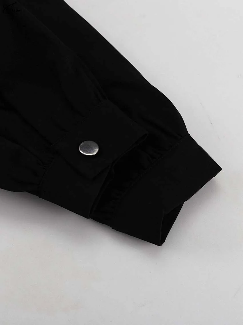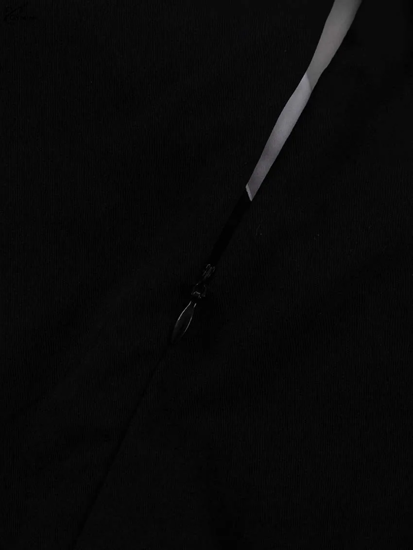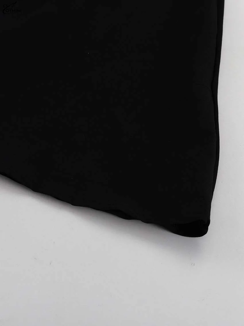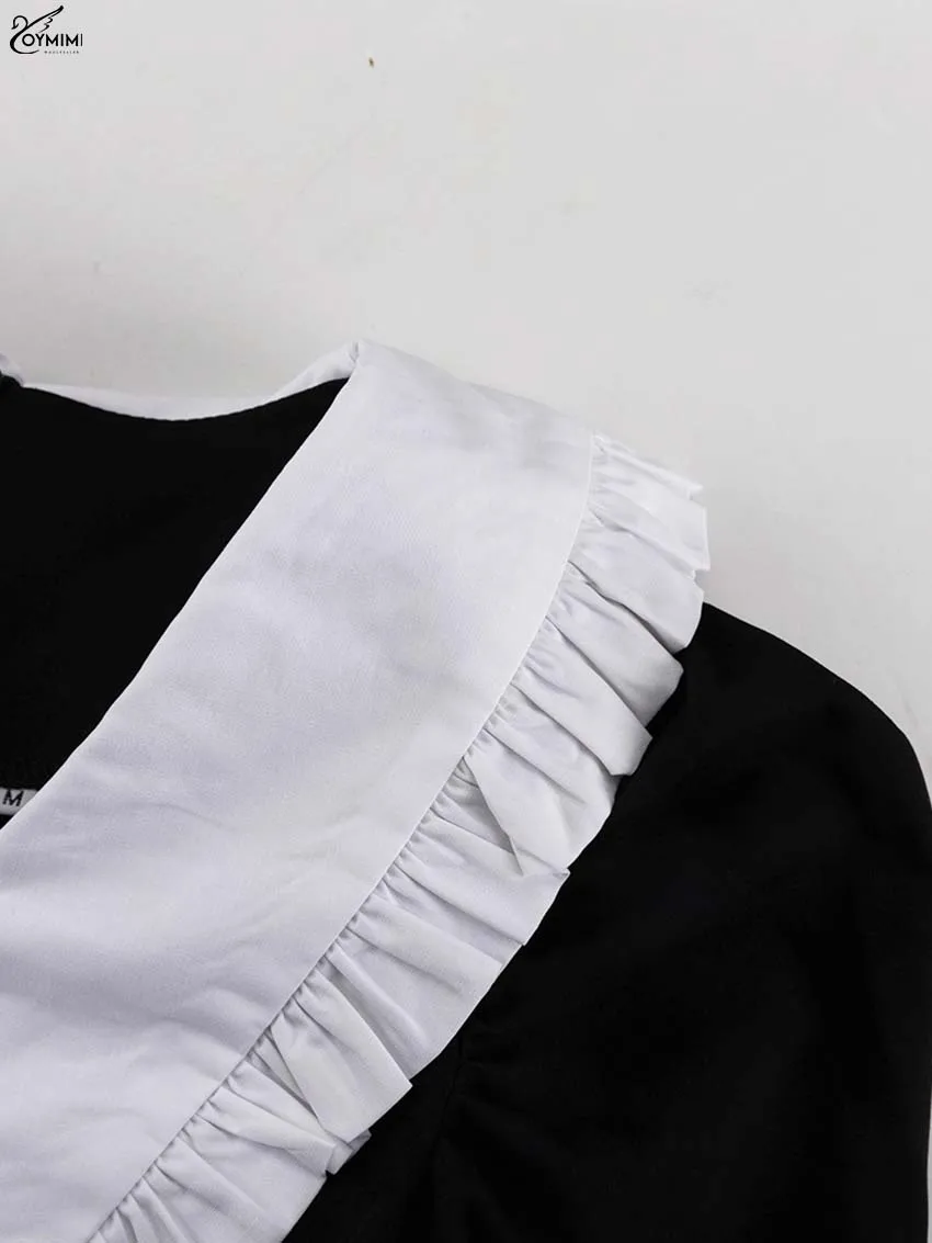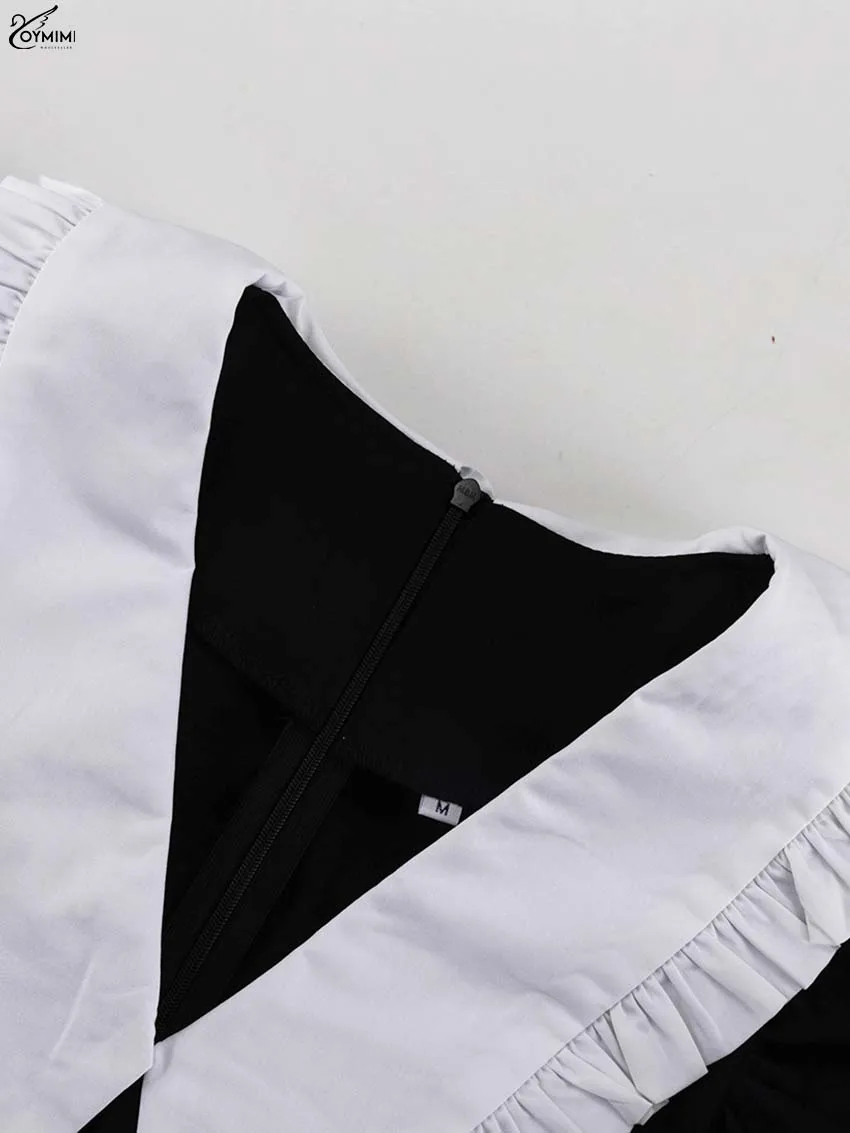 Oymimi Elegant Black Patchwork Women's Dress Casual Peter Pan Collar Three Quarter Sleeve Dresses Fashion Pleated Mini Dresses