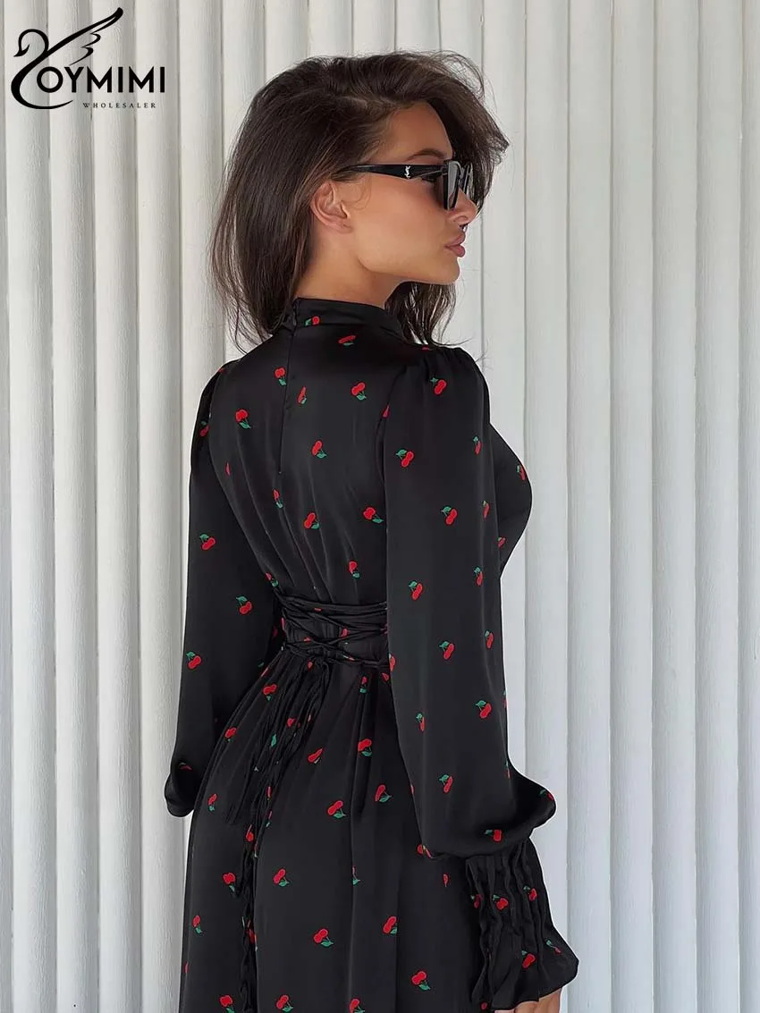 Oymimi Elegant Black Print Dresses For Women Fashion O-Neck Long Sleeve Dresses Casual New High Waist Lace-Up Ankle-Length Dress