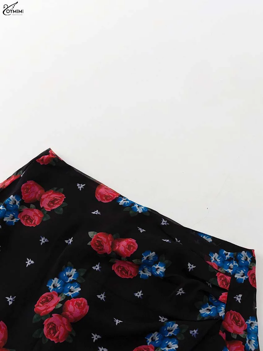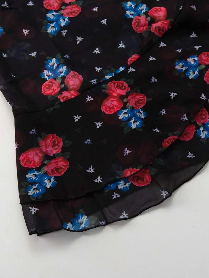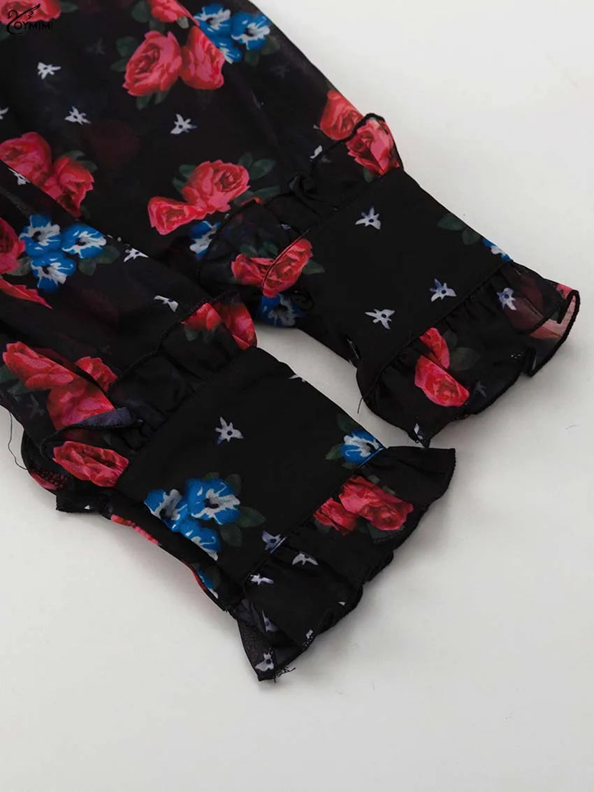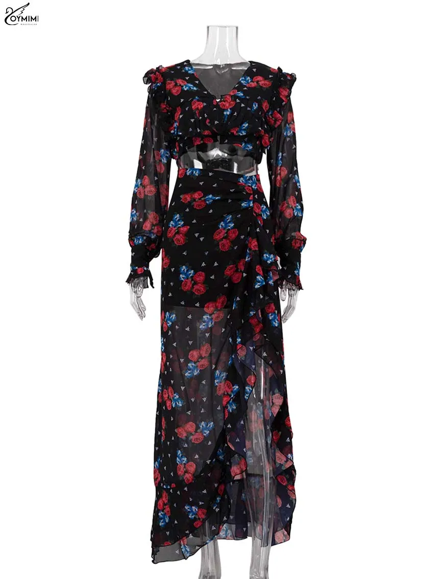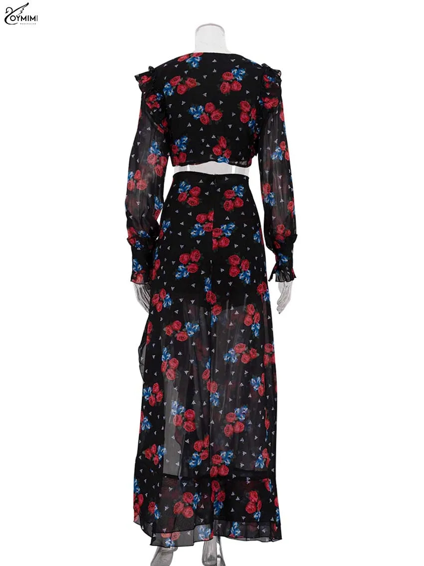 Oymimi Elegant Black Print Two Piece Set For Women Fashion Ruffled Long Sleeve Crop Shirts And Side Slit Floor-Length Skirts Set