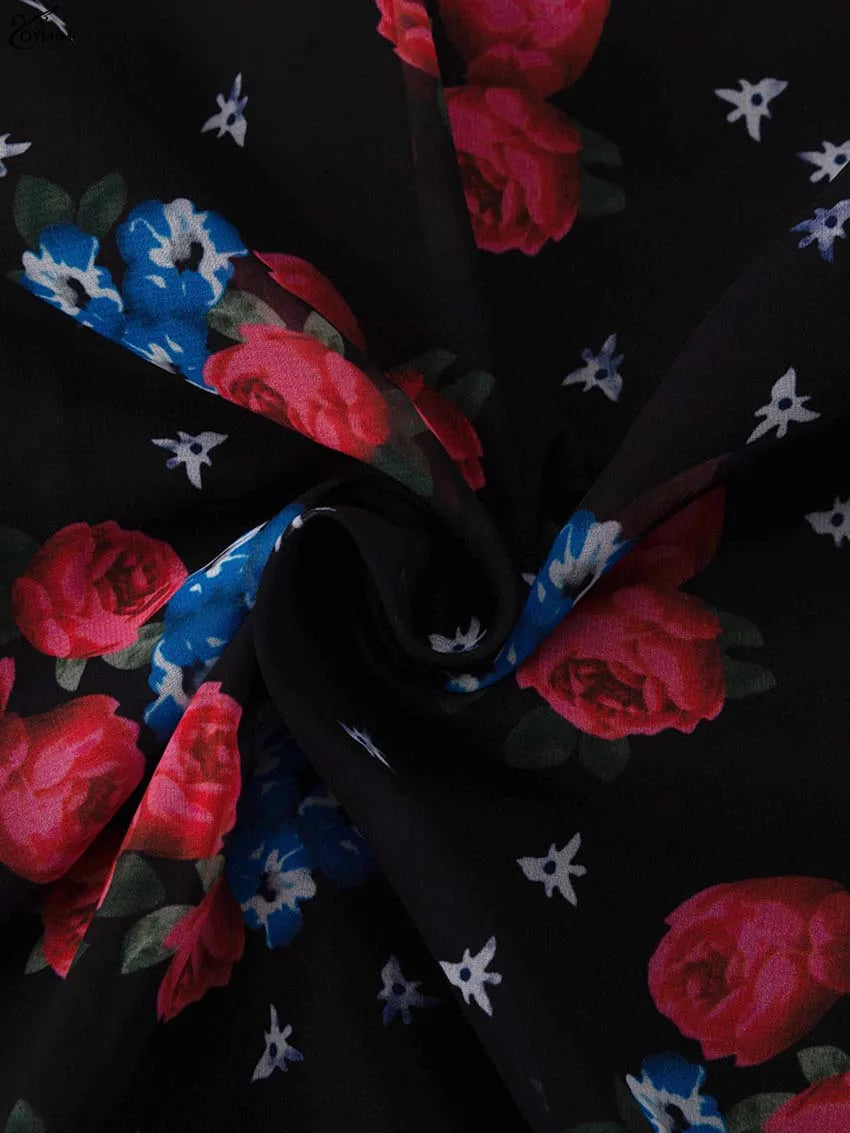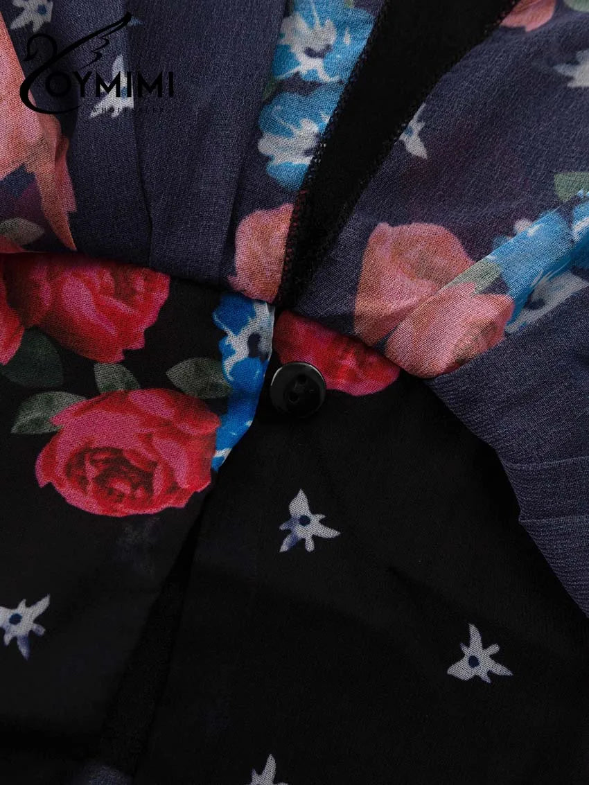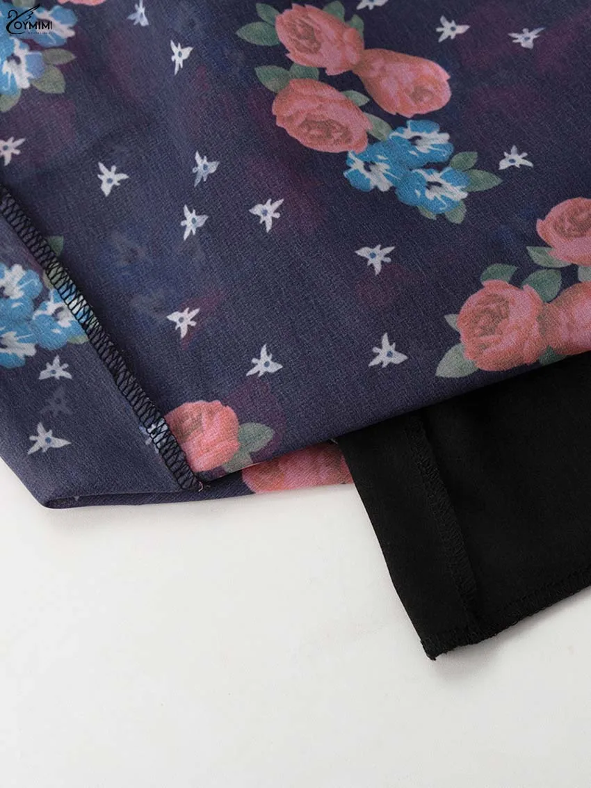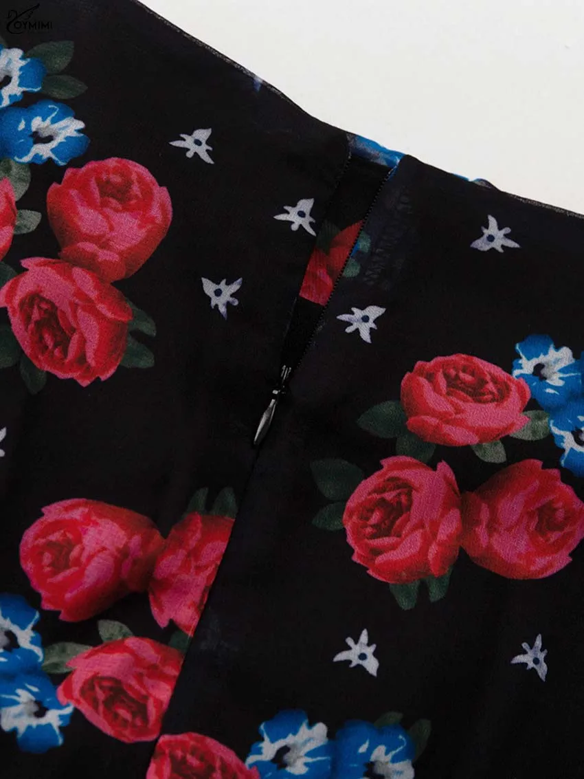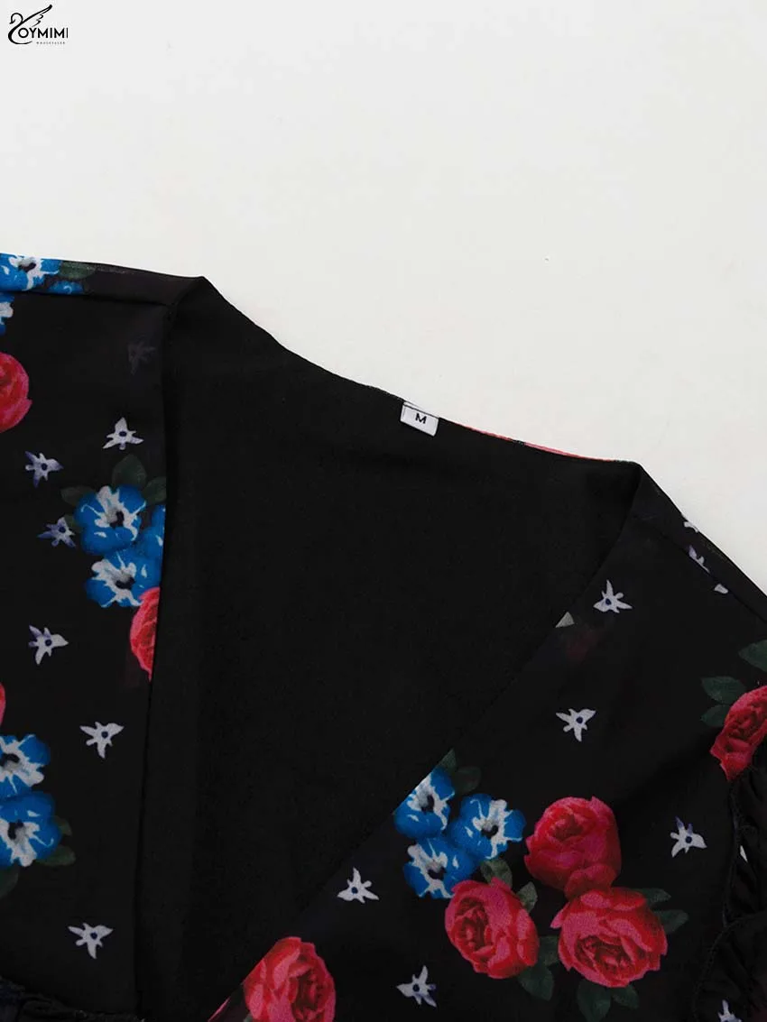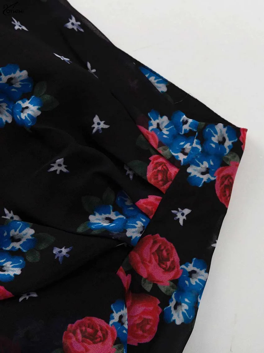 Oymimi Elegant Black Print Two Piece Set For Women Fashion Ruffled Long Sleeve Crop Shirts And Side Slit Floor-Length Skirts Set