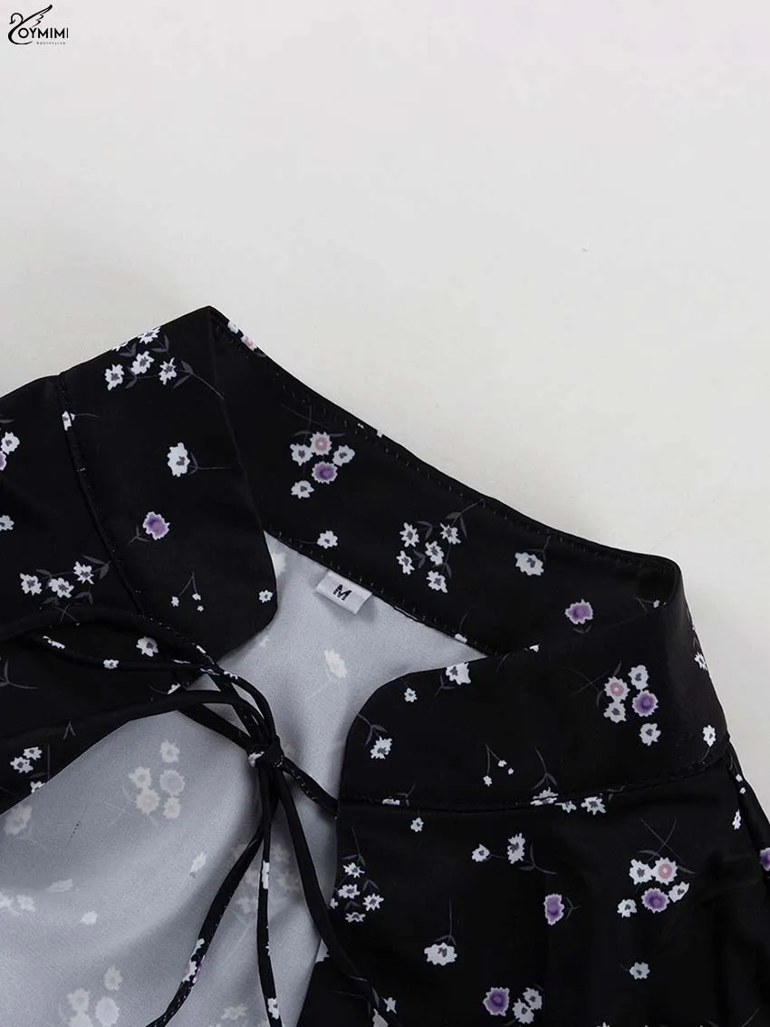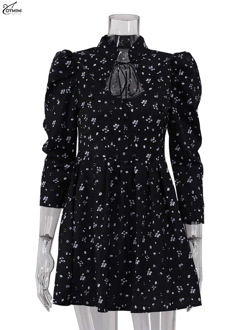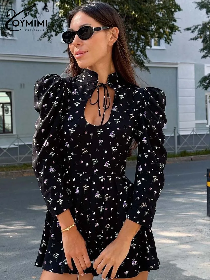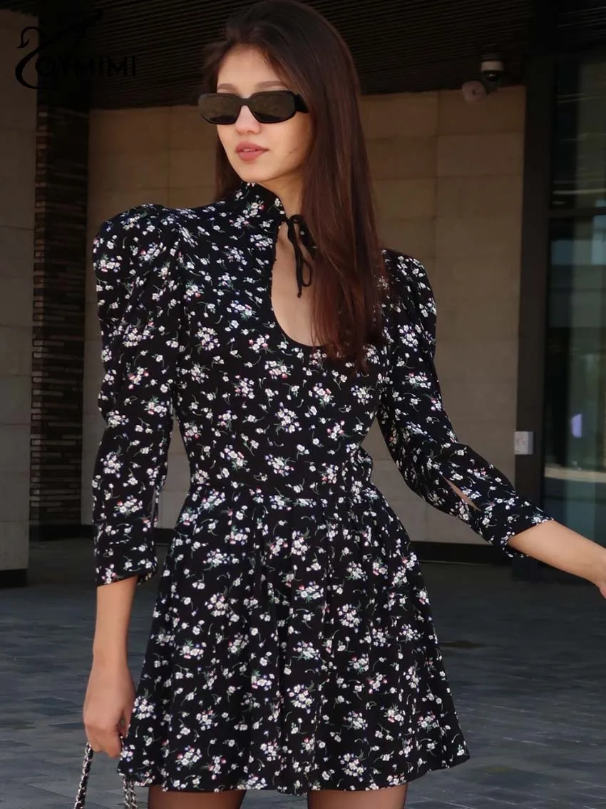 Oymimi Elegant Black White Womens Dresses Fashion Three Quarter Sleeve Hollow Out Dresses Casual High Waisted Mini Dress Female