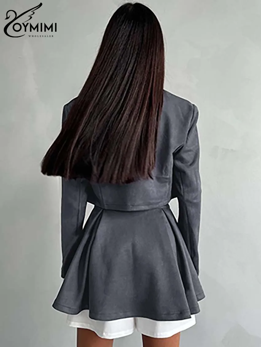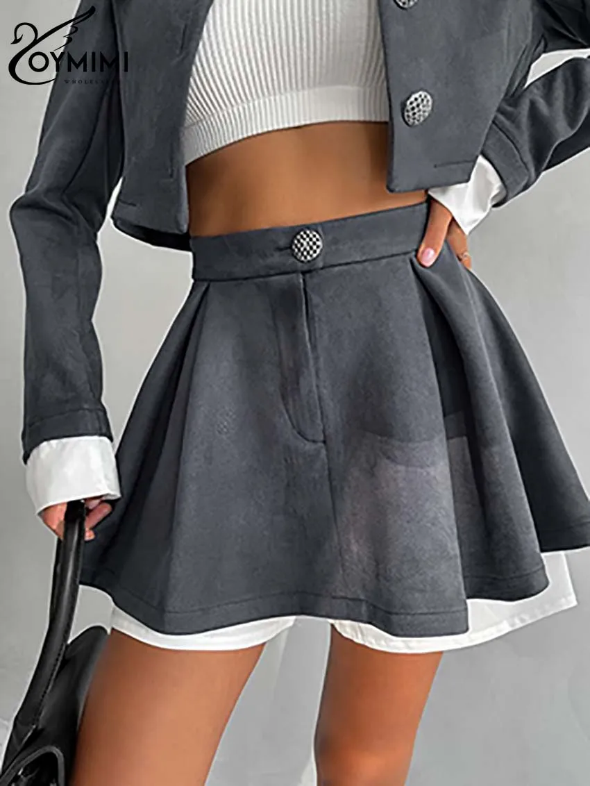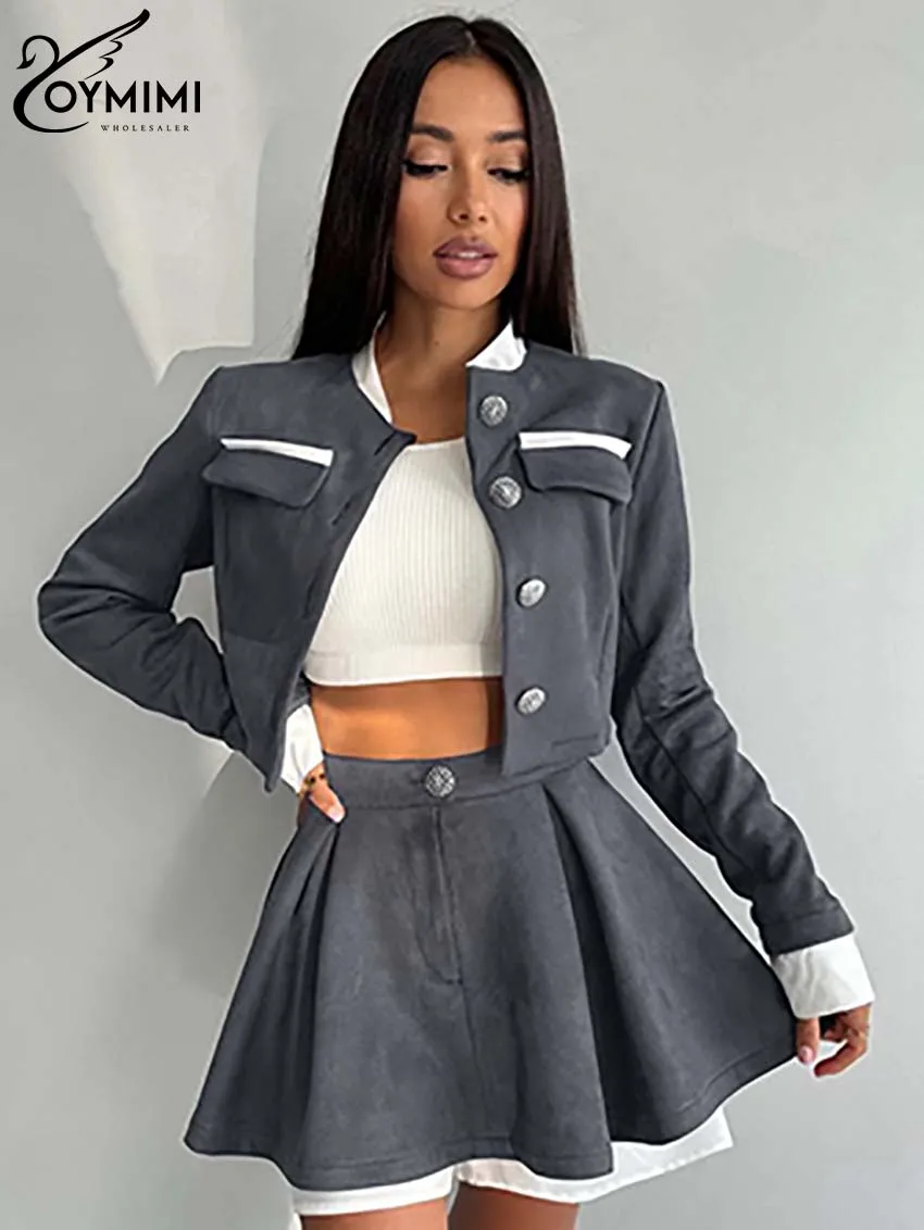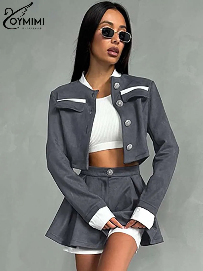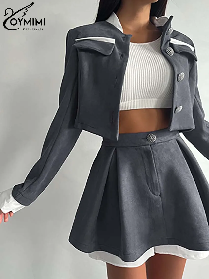 Oymimi Elegant Grey Patchwork Women 2 Piece Set Outfit Fashion Long Sleeve Pockets Button Crop Shirts And Pleated Mini Skirts