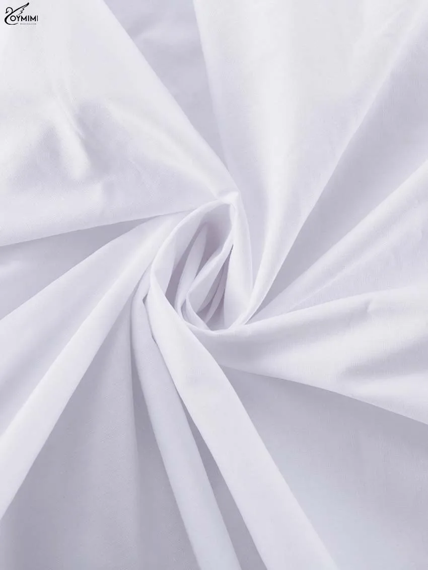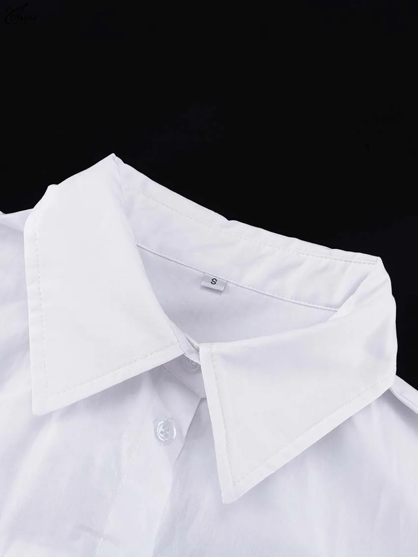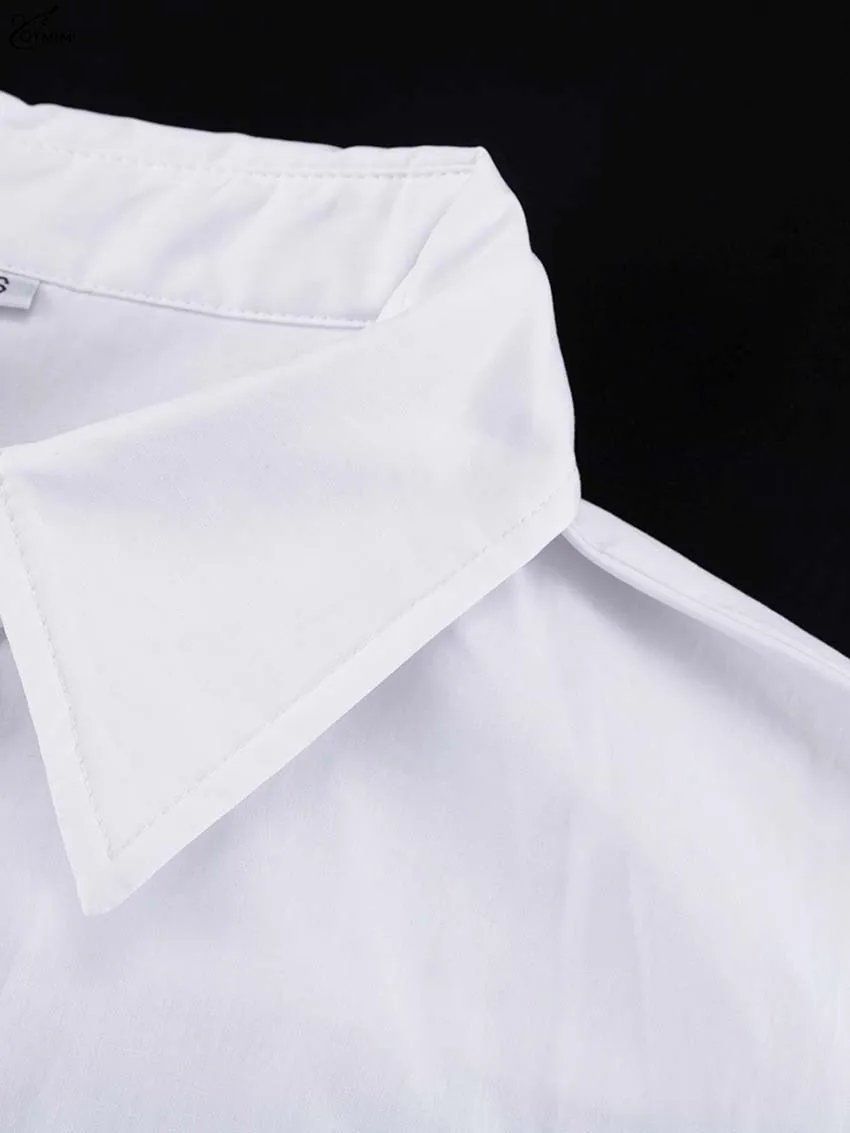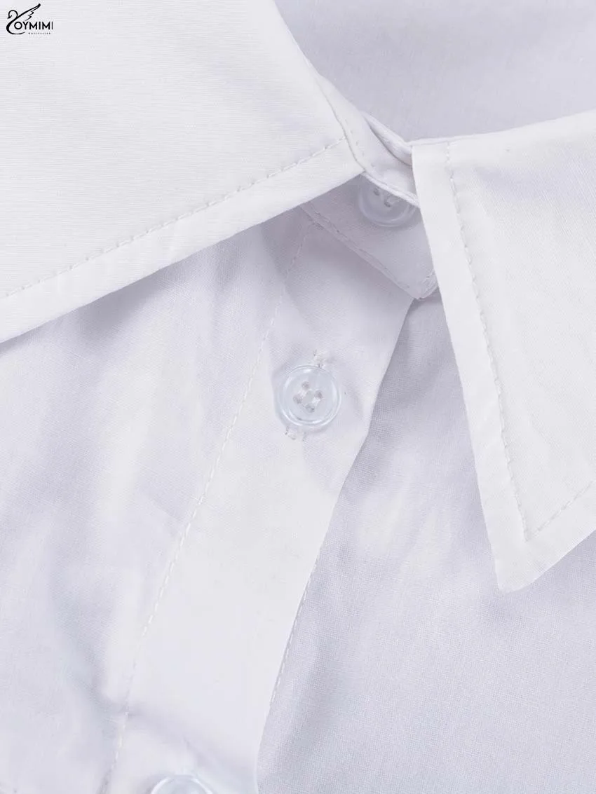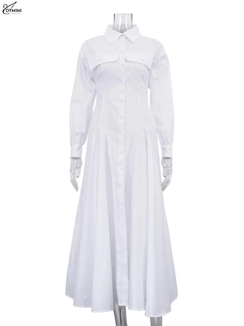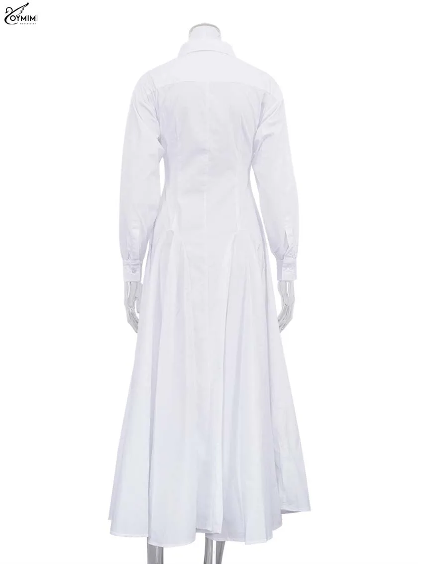 Oymimi Elegant White Lapel Women's Dress Fashion Three Quarter Sleeve Pockets Dresses Casual Button Pleated Ankle-Length Dresses