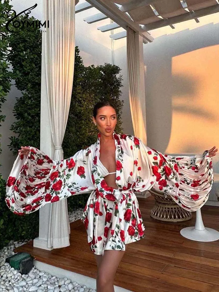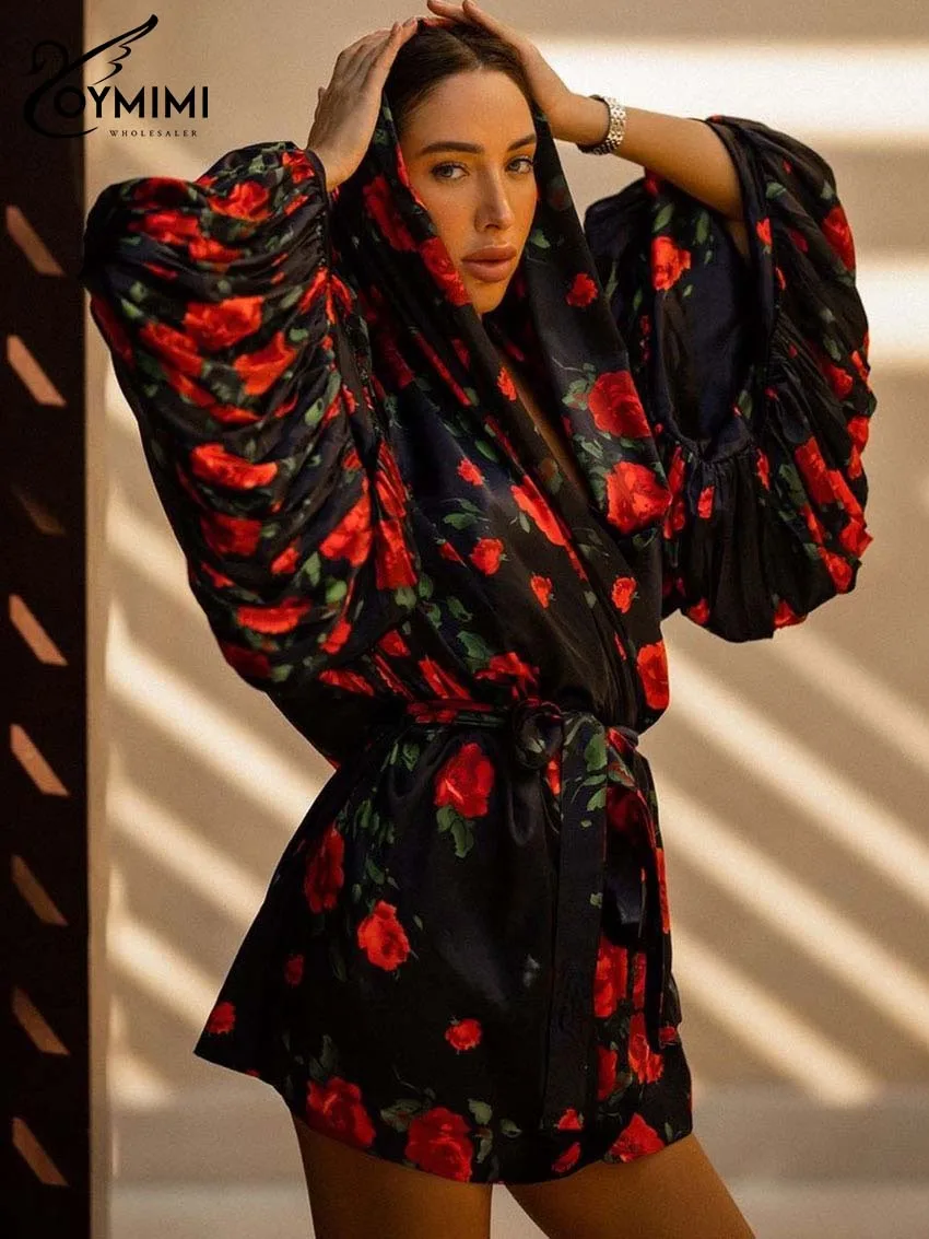 Oymimi Fashion Black Print Dresses 2025 Woman Elegant Deep V-Neck Lantern Sleeve Lace-Up Dresses Casual Loose Mini Dress Female