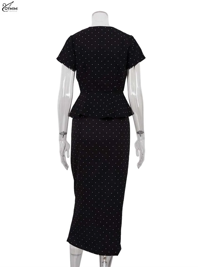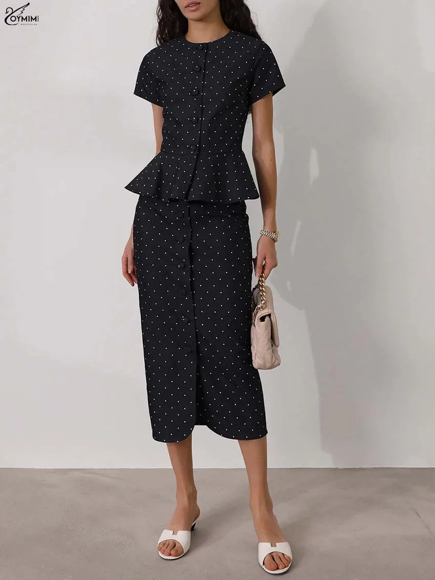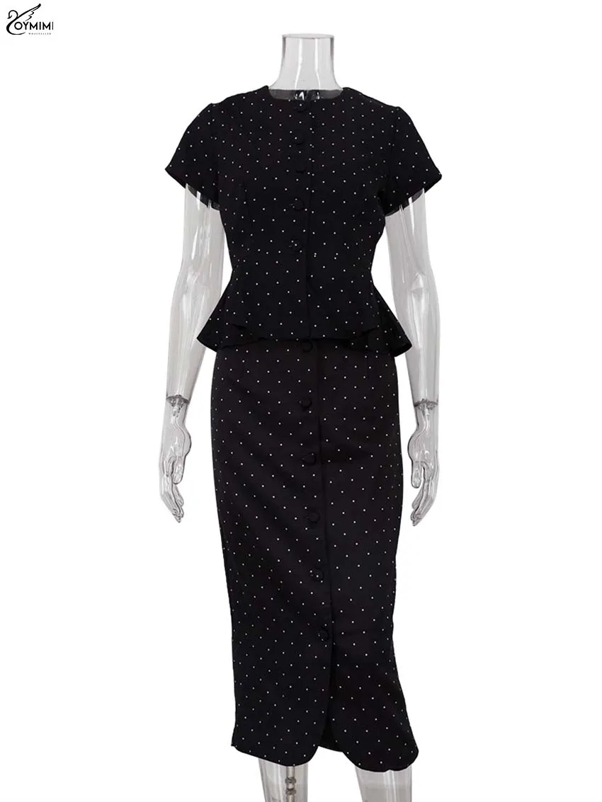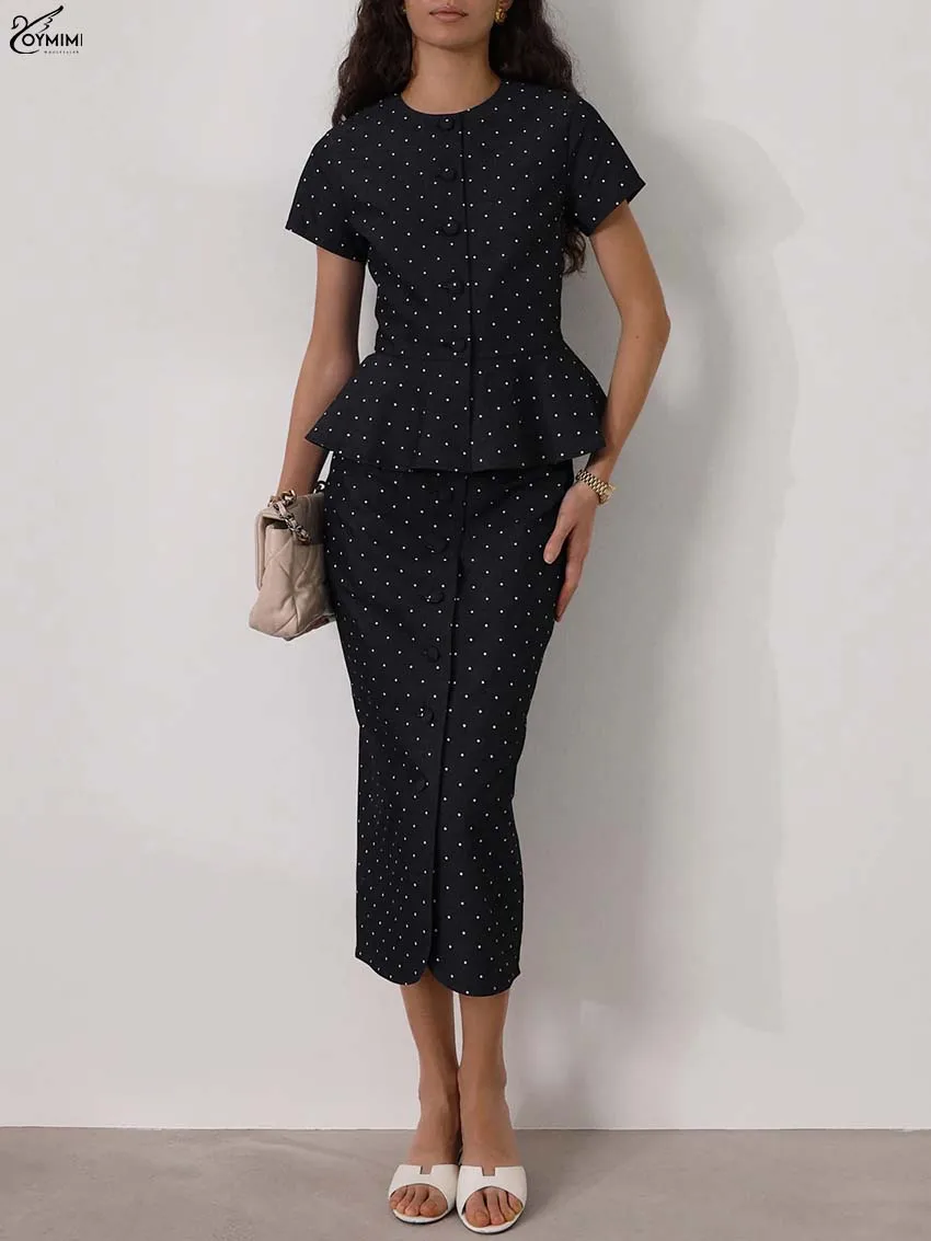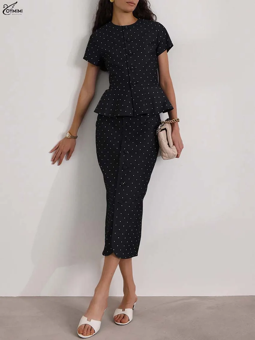 Oymimi Fashion Black Print Two Piece Outfits Woman Elegant Short Sleeve Button Blouses And High Waisted Slim Mid-Calf Skirt Sets