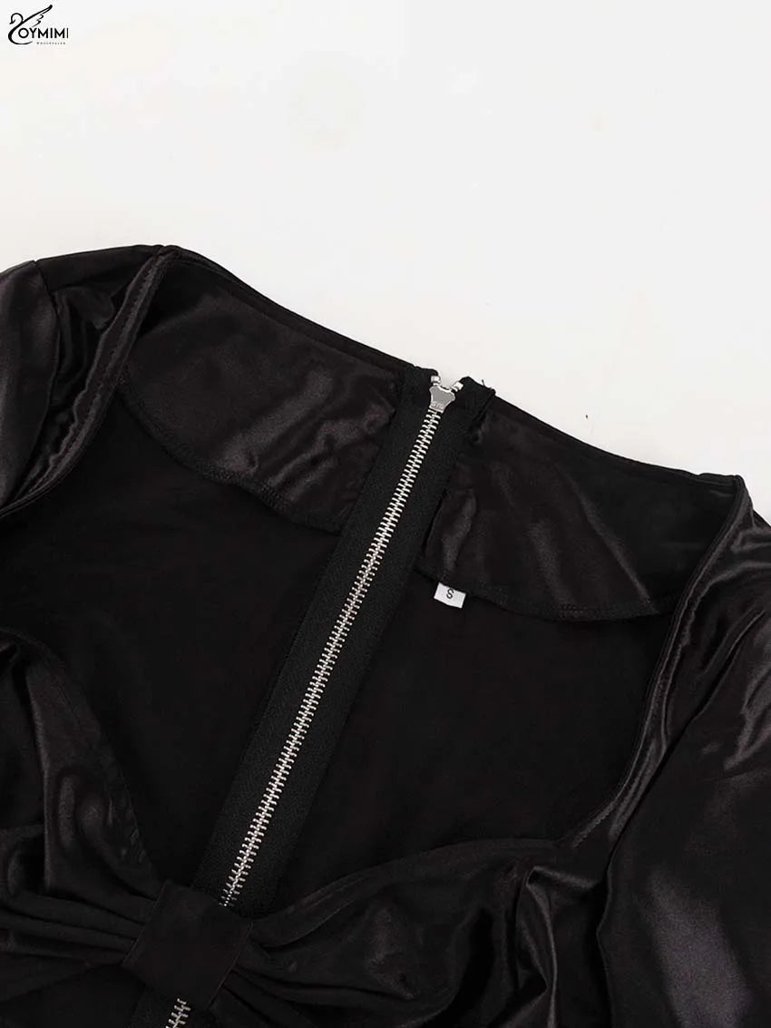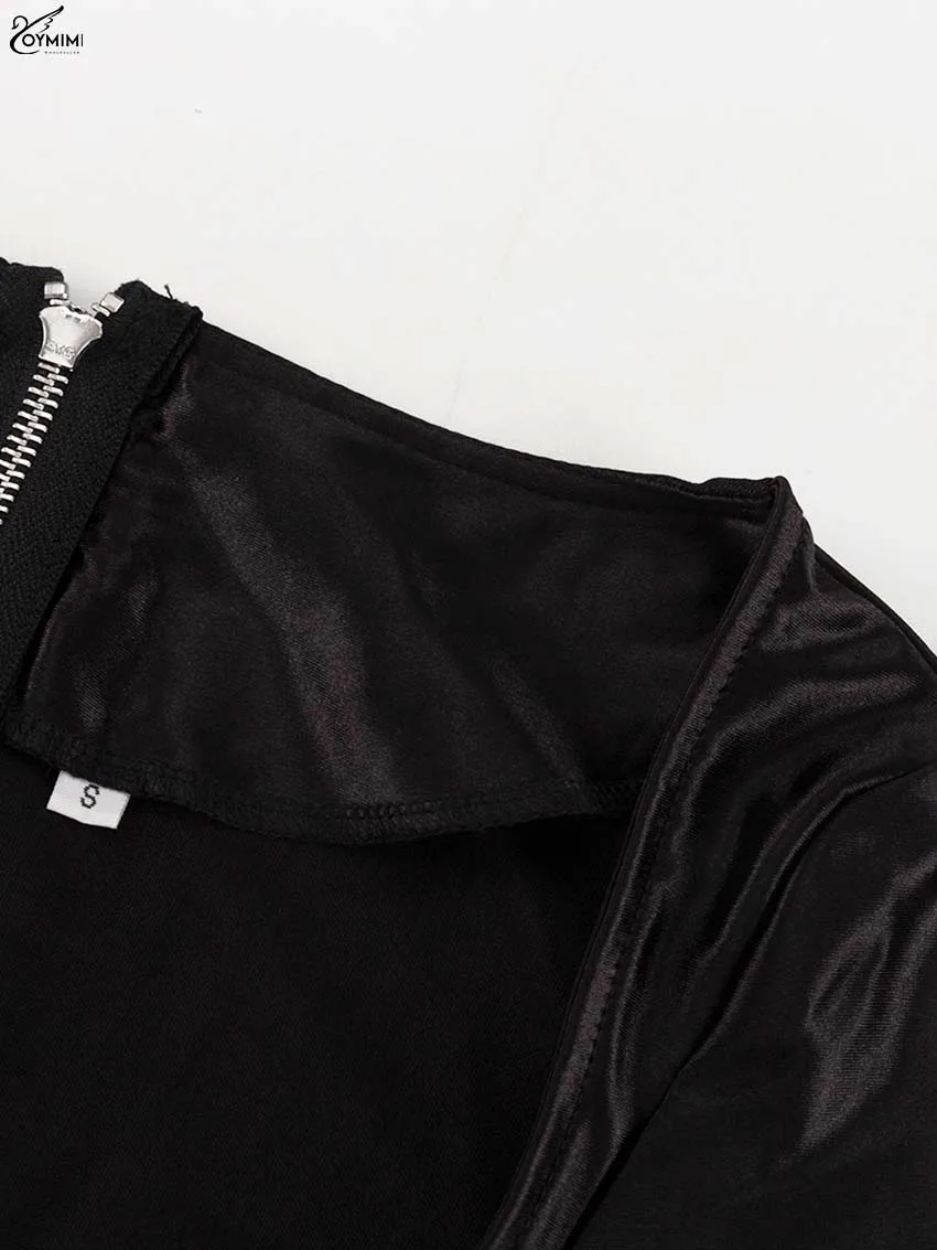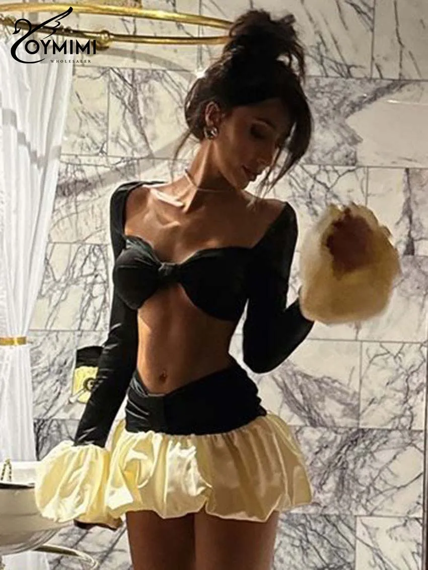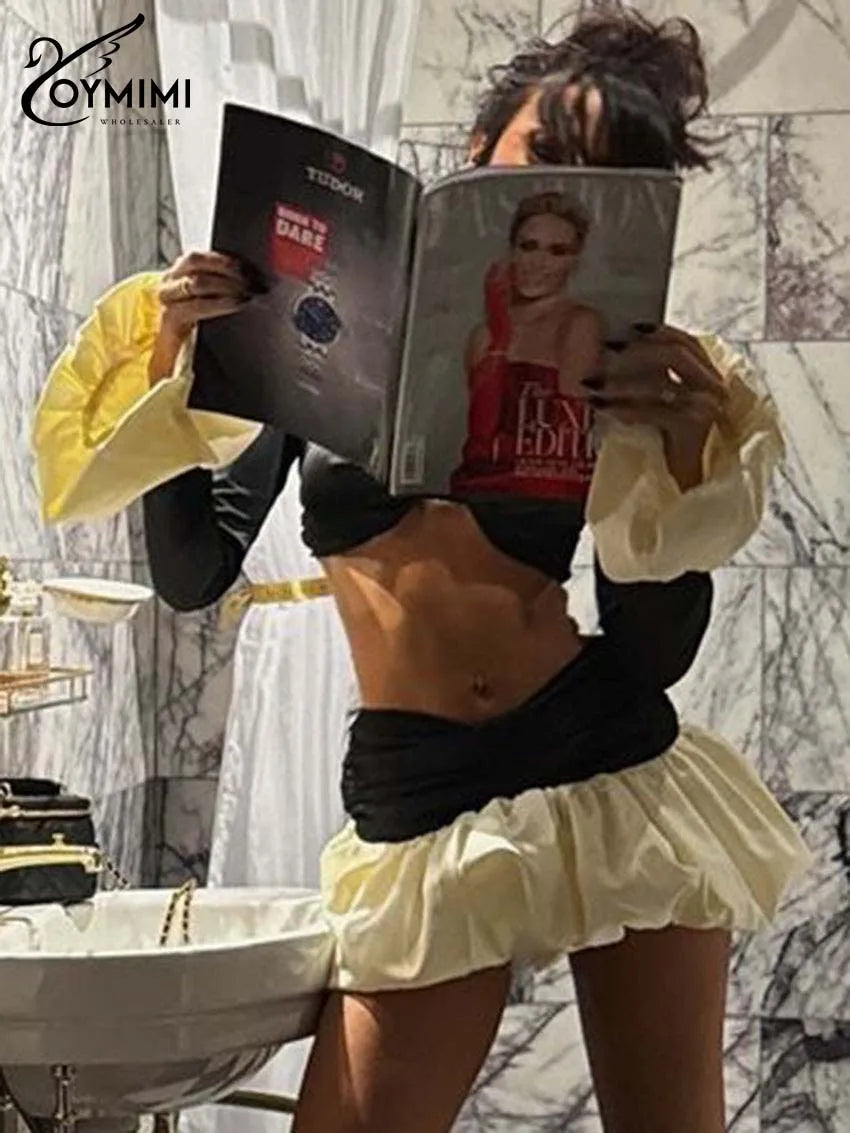 Oymimi Fashion Black Satin 2 Piece Sets Woman Outfits Elegant Long Sleeve Patchwork Zipper Crop Tops And Pleated Mini Skirts Set