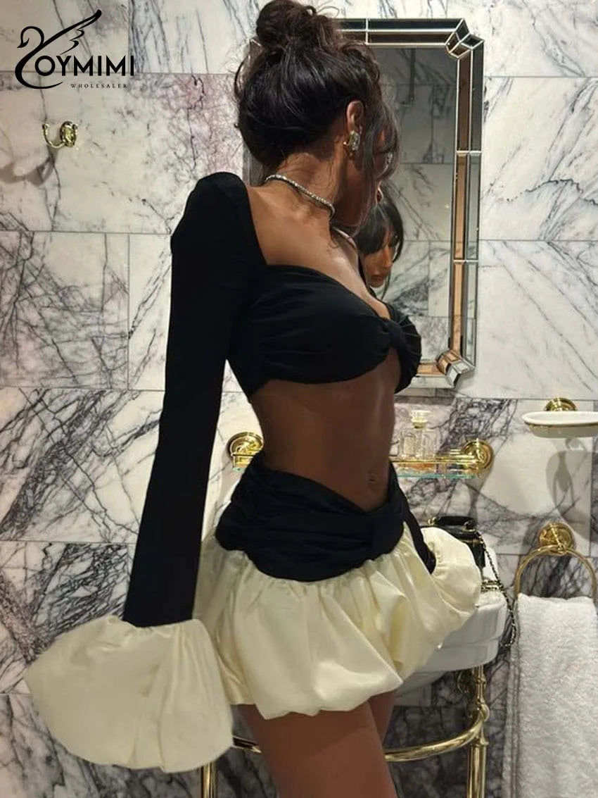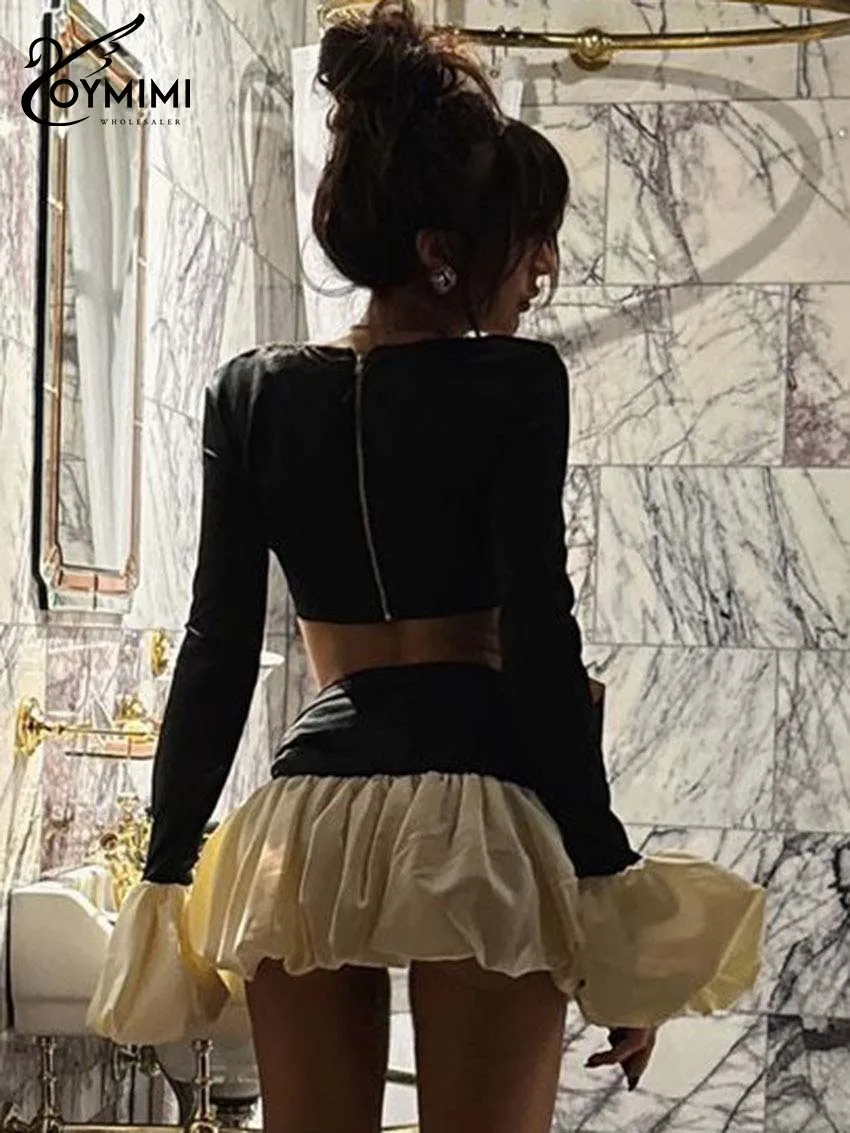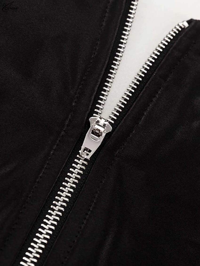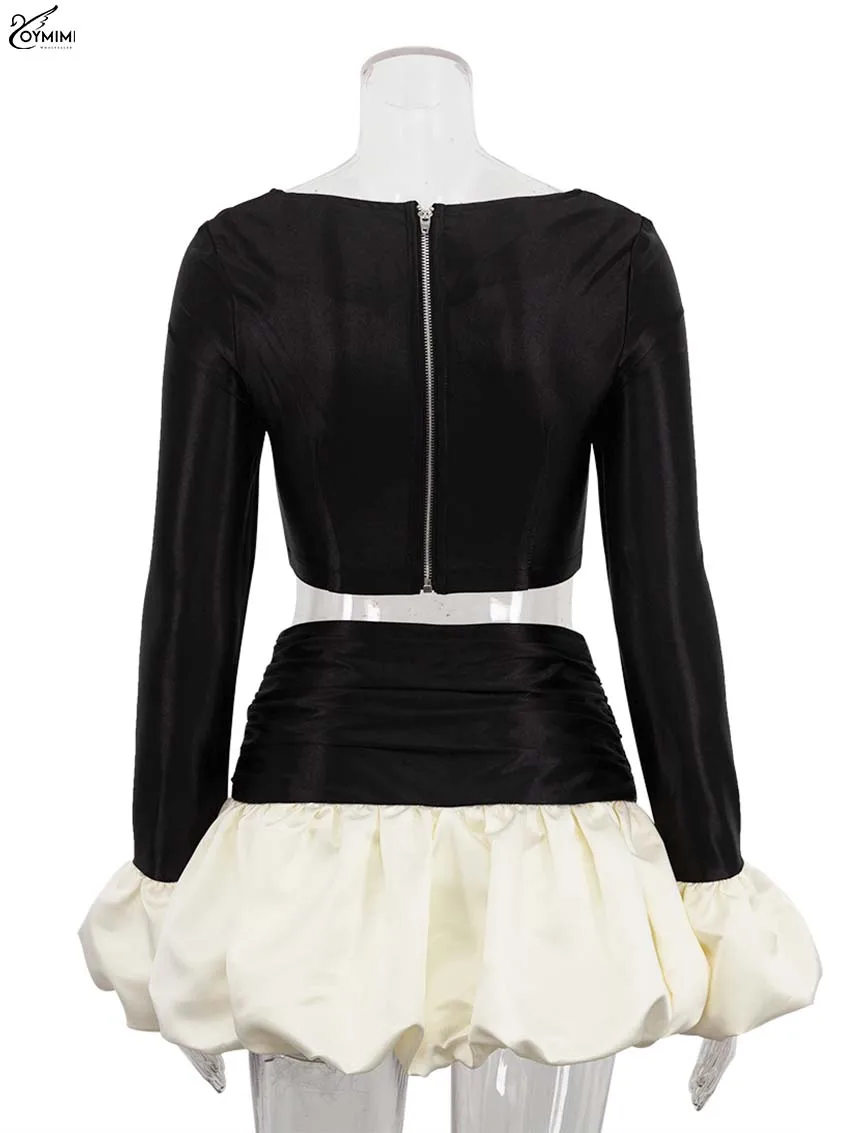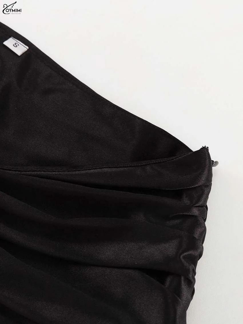 Oymimi Fashion Black Satin 2 Piece Sets Woman Outfits Elegant Long Sleeve Patchwork Zipper Crop Tops And Pleated Mini Skirts Set