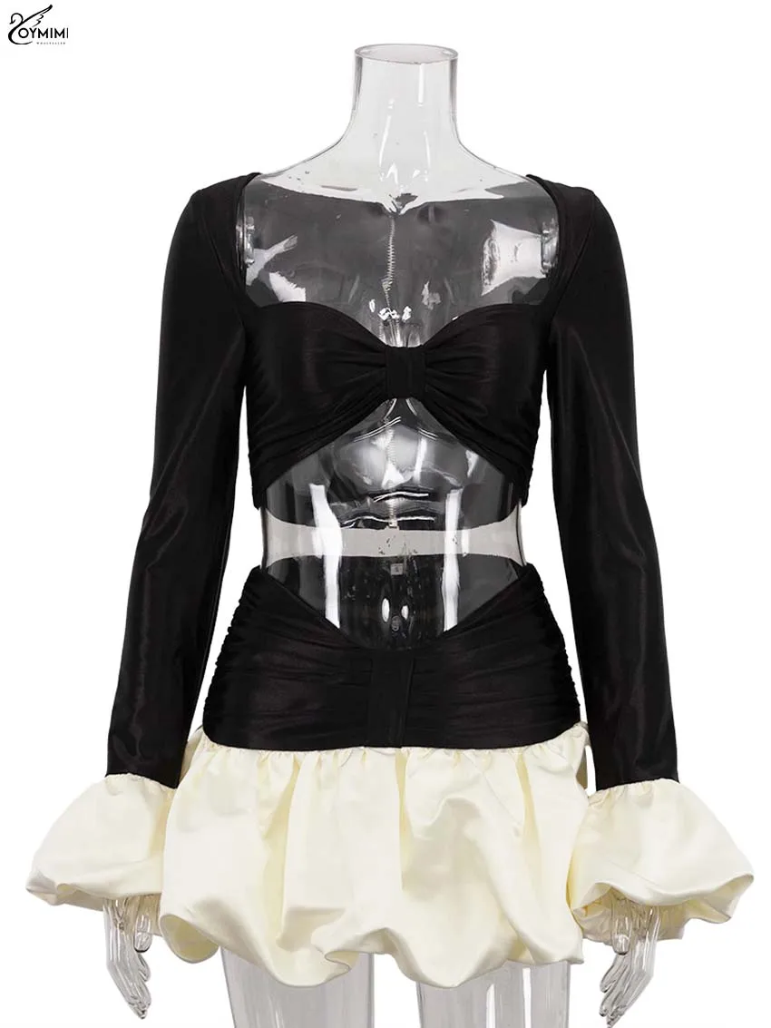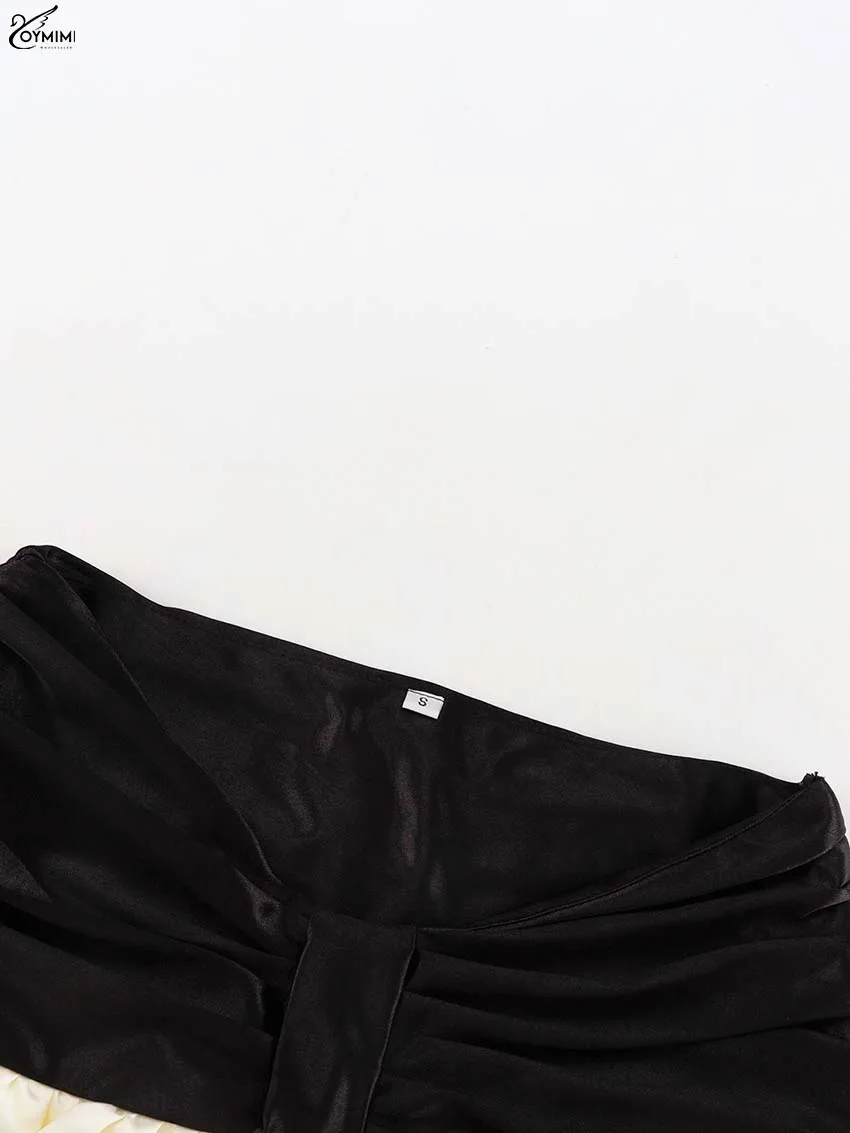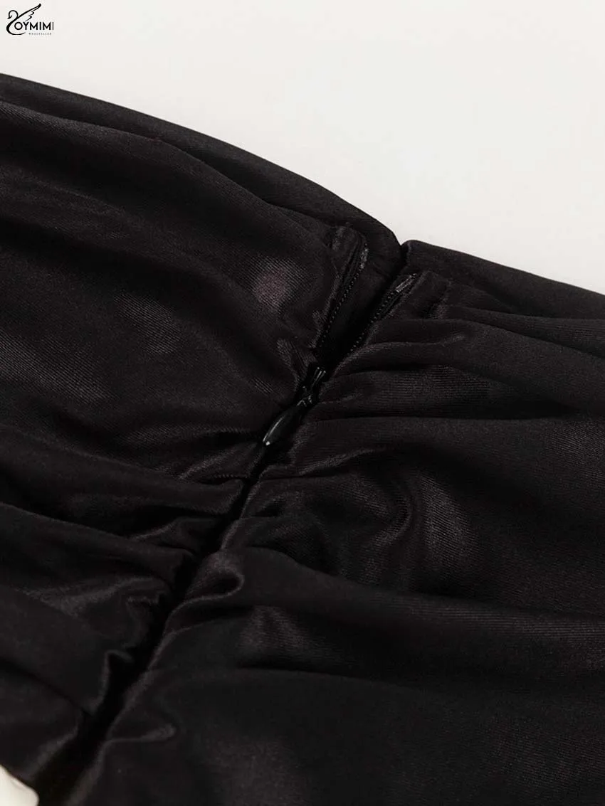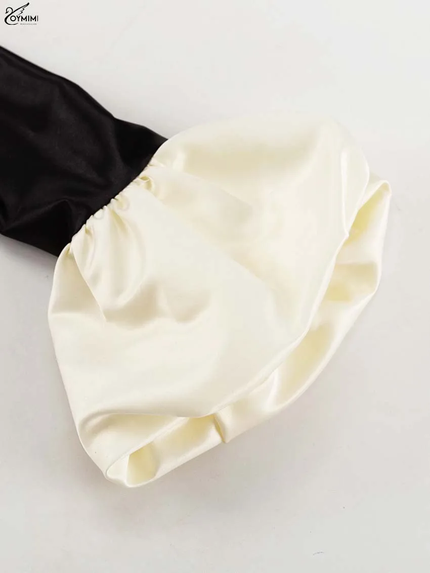 Oymimi Fashion Black Satin 2 Piece Sets Woman Outfits Elegant Long Sleeve Patchwork Zipper Crop Tops And Pleated Mini Skirts Set