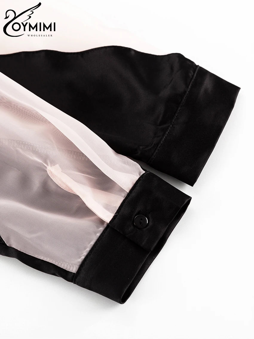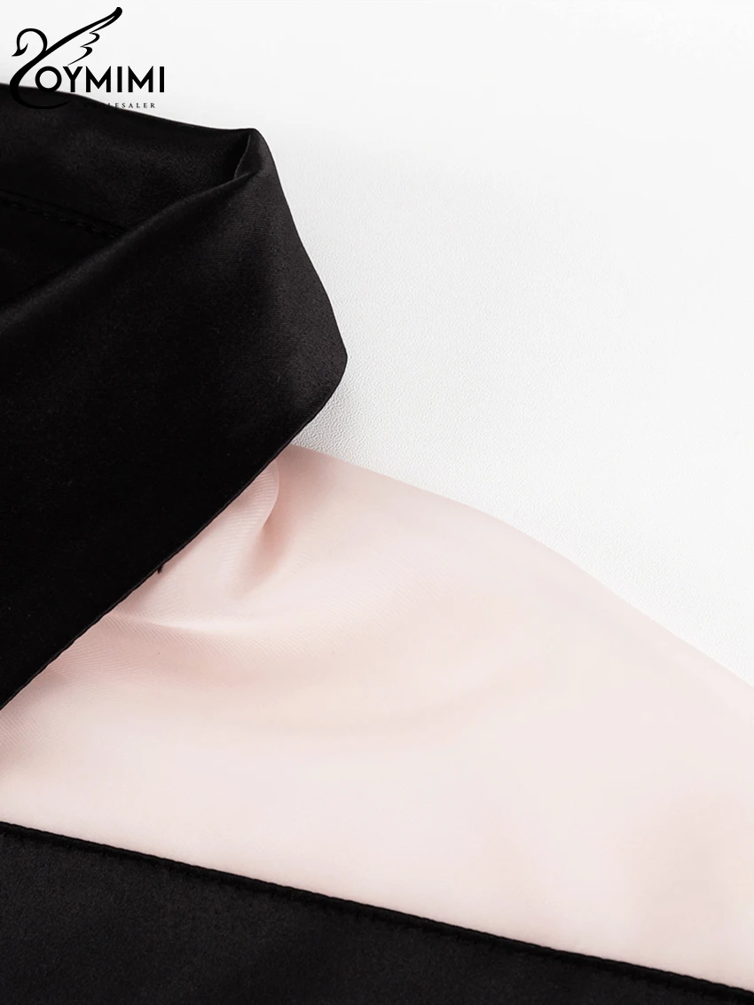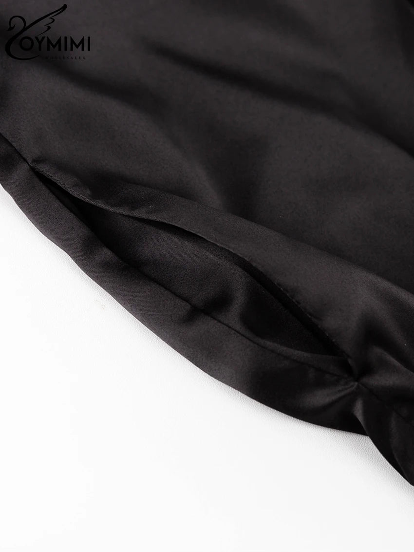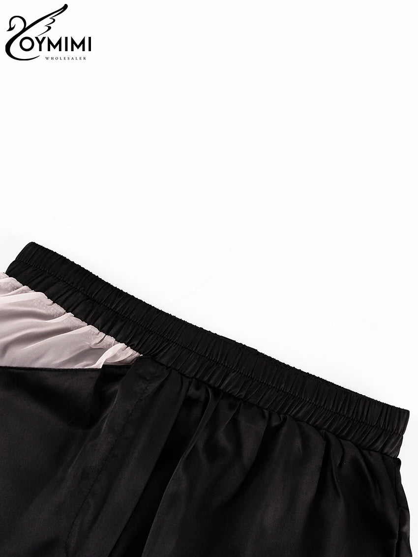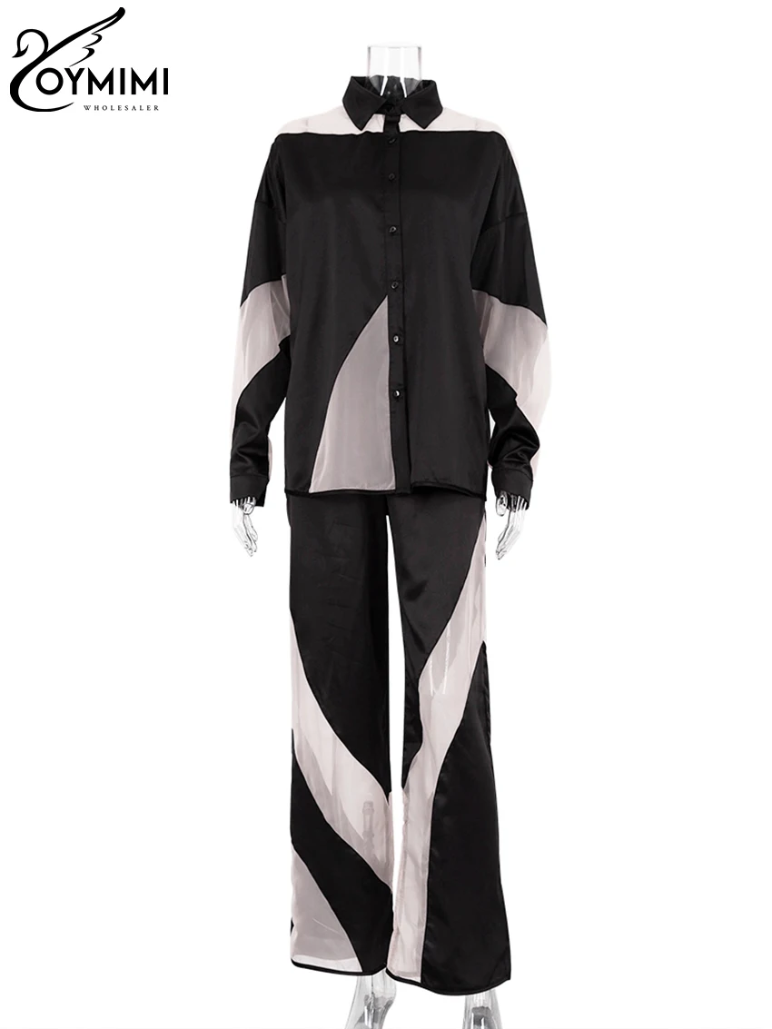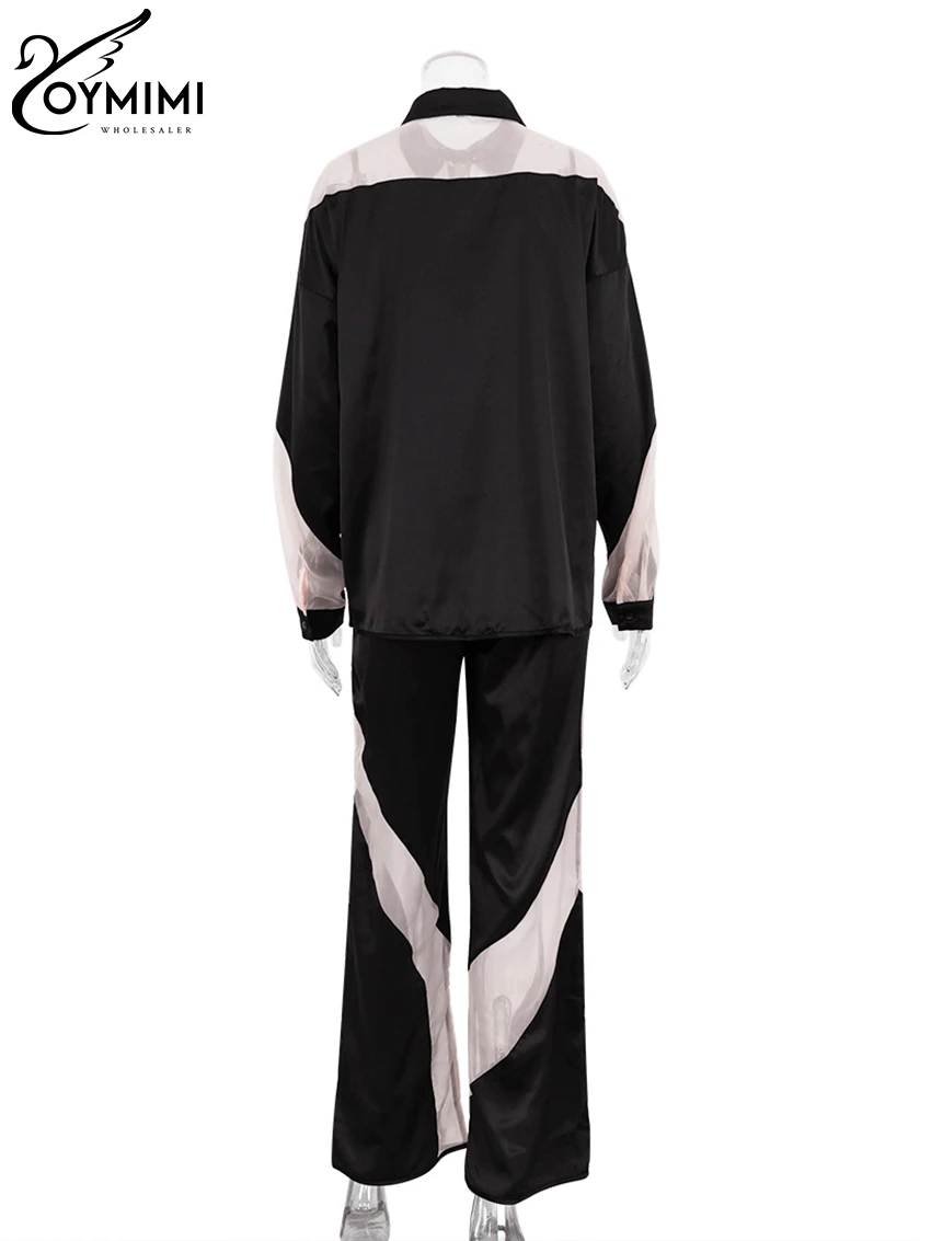 Oymimi Fashion Black Satin Patchwork 2 Piece Set Women Outfit Streetwear Long Sleeve Shirt With High Waist Pant Sets Y2k Clothes