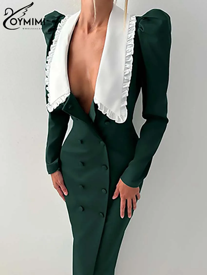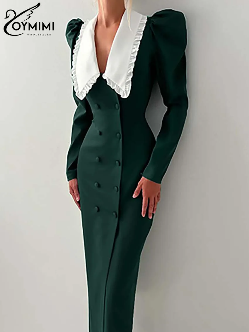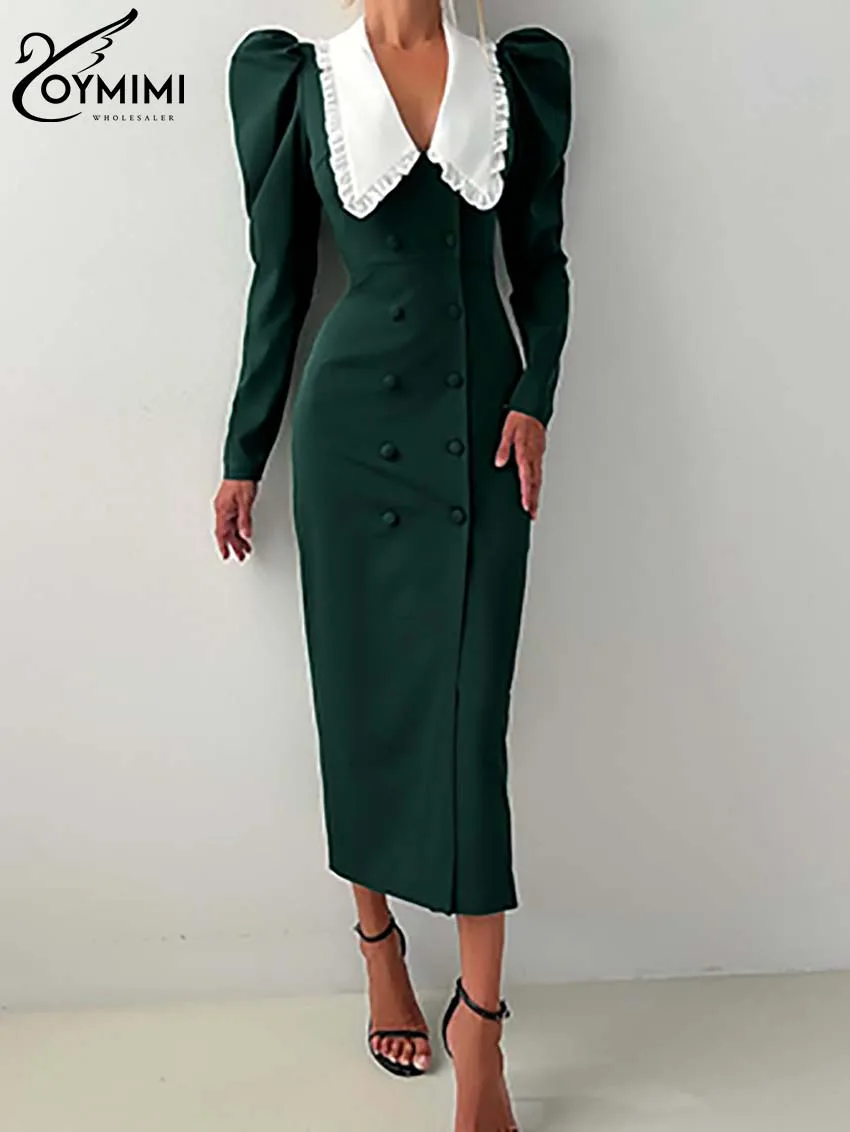 Oymimi Fashion Green Patchwork Womens Dresses Elegant Peter Pan Collar Long Sleeve Dresses Casual Slim Double Breasted Dress
